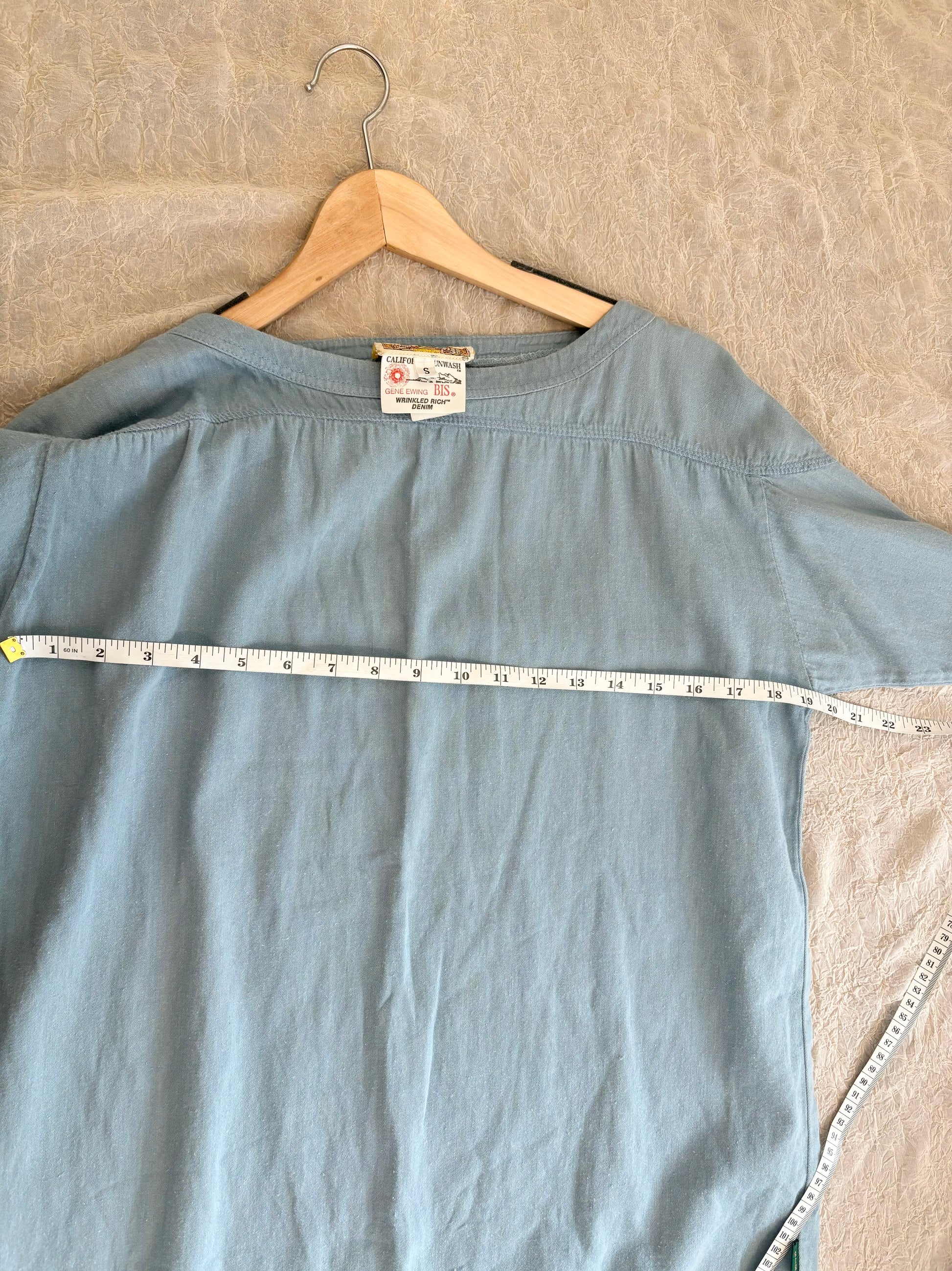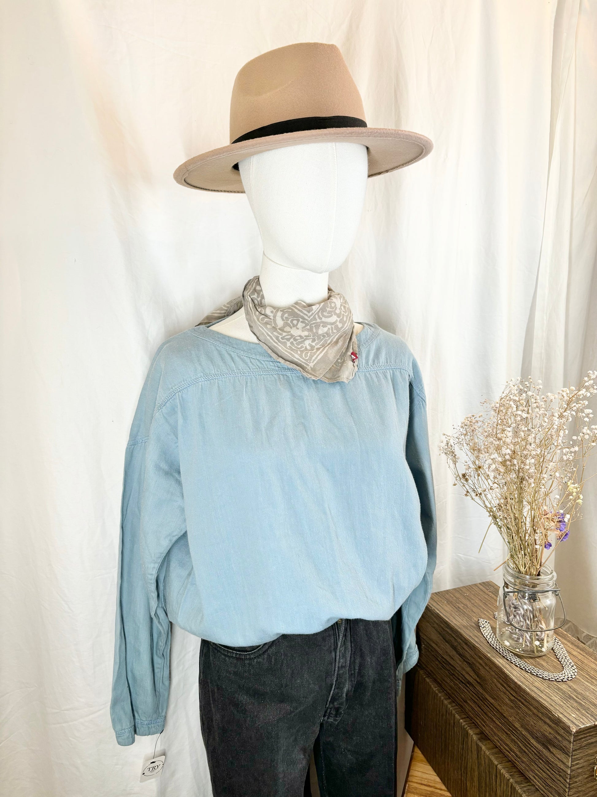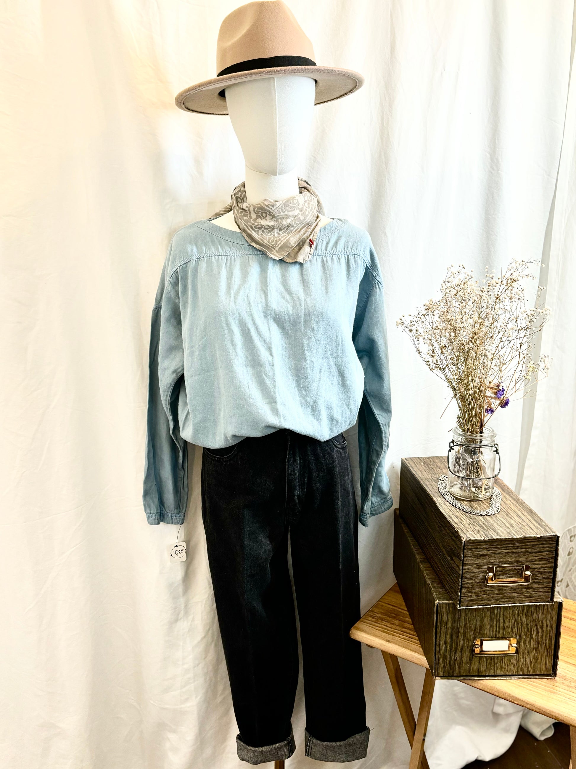 Vintage blue wash blouse with long sleeves, offering a timeless, classic look