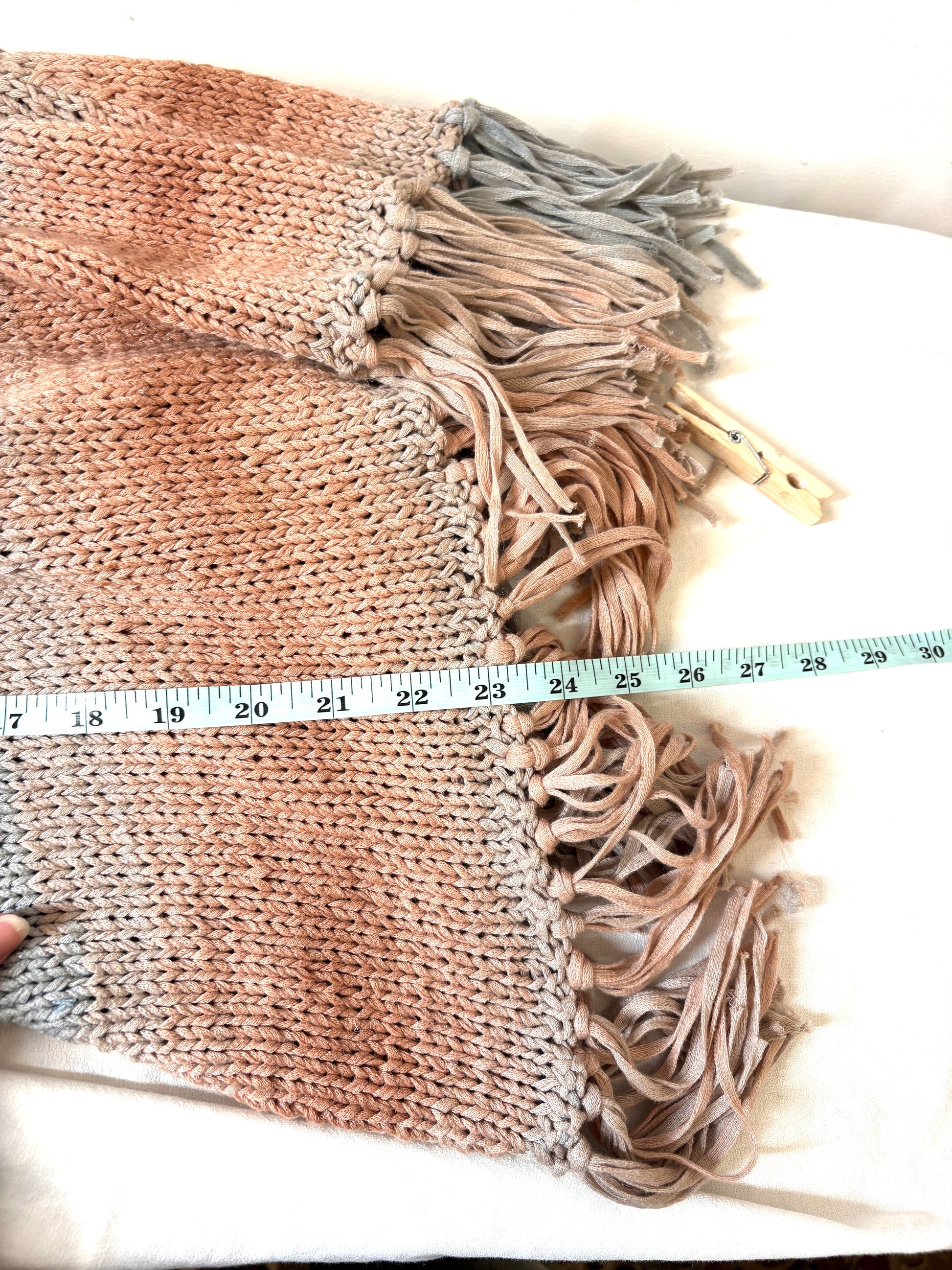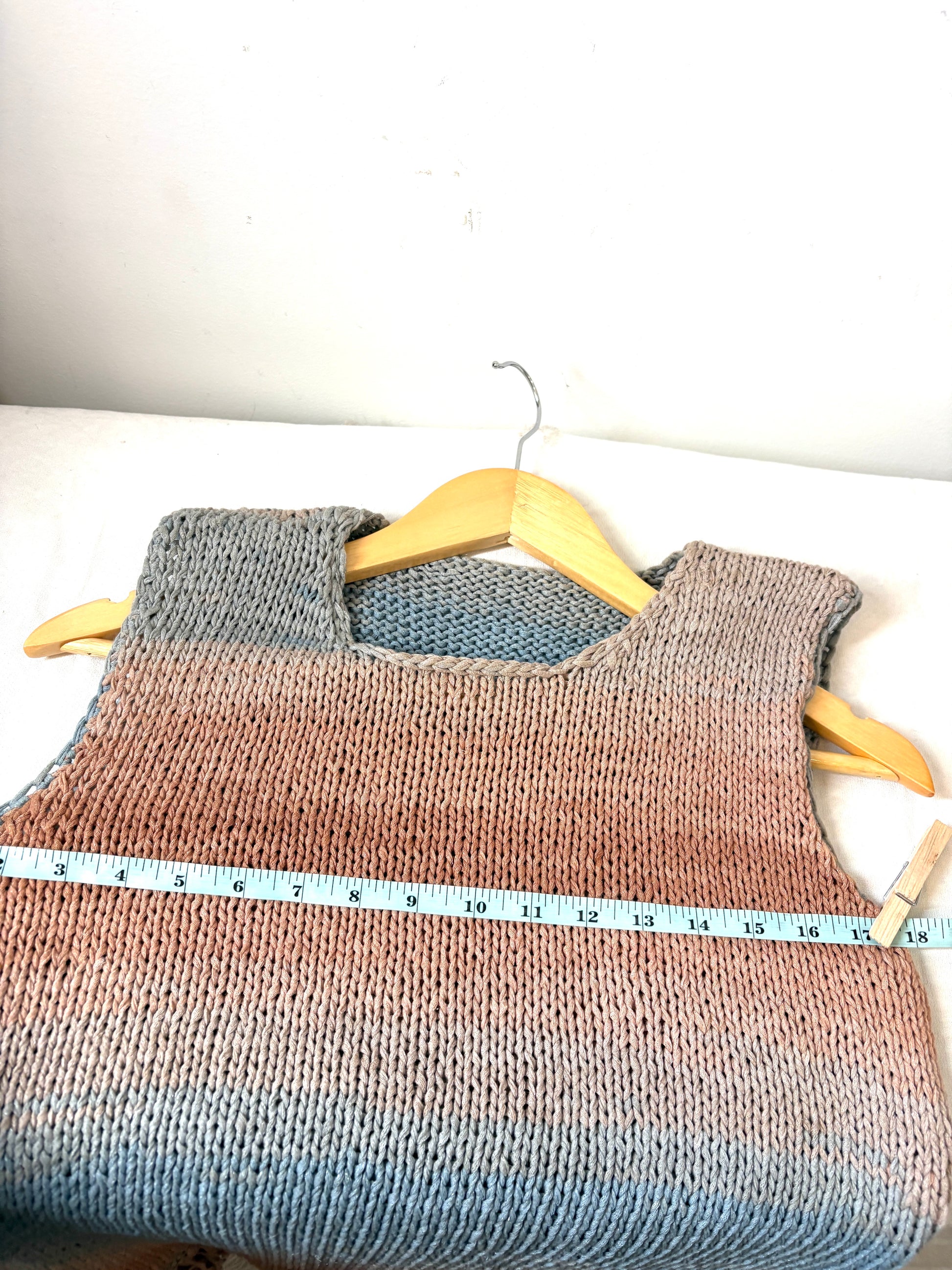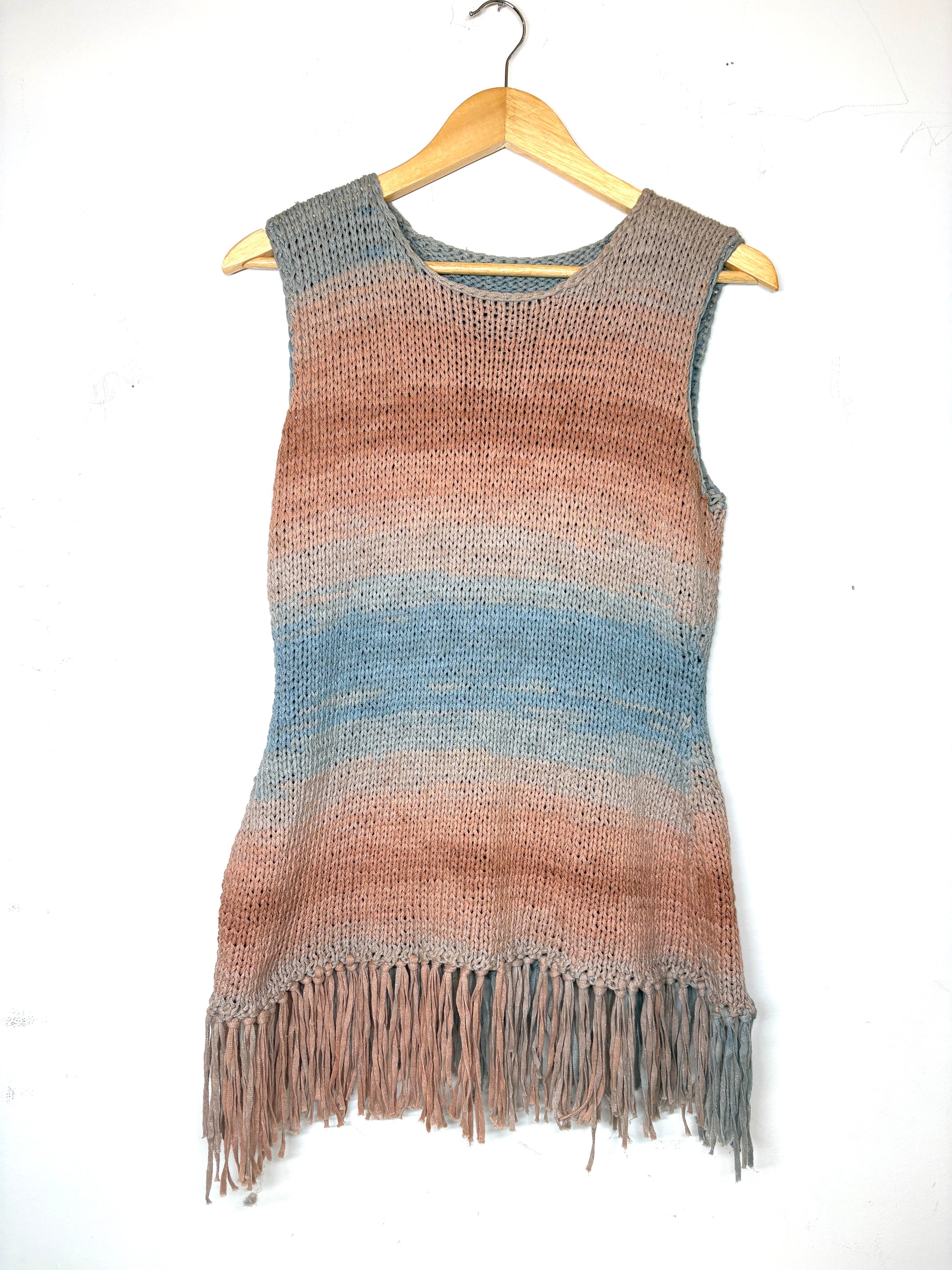 A free-spirited boho style sleeveless knit tunic featuring soft gradient tones of earthy peach, taupe, and dusty blue. Finished with playful fringe along the hem for that effortless festival or beachy vibe.