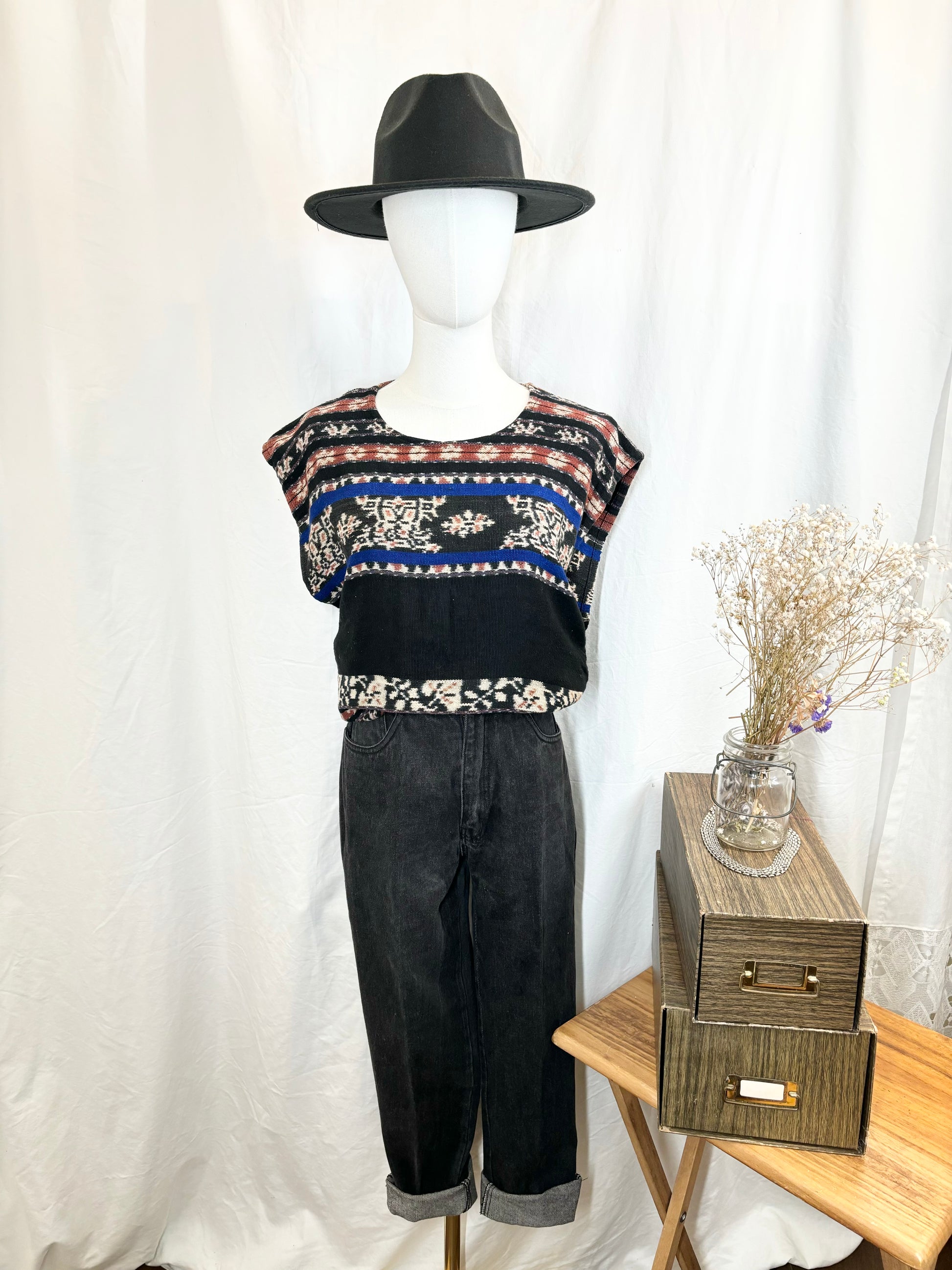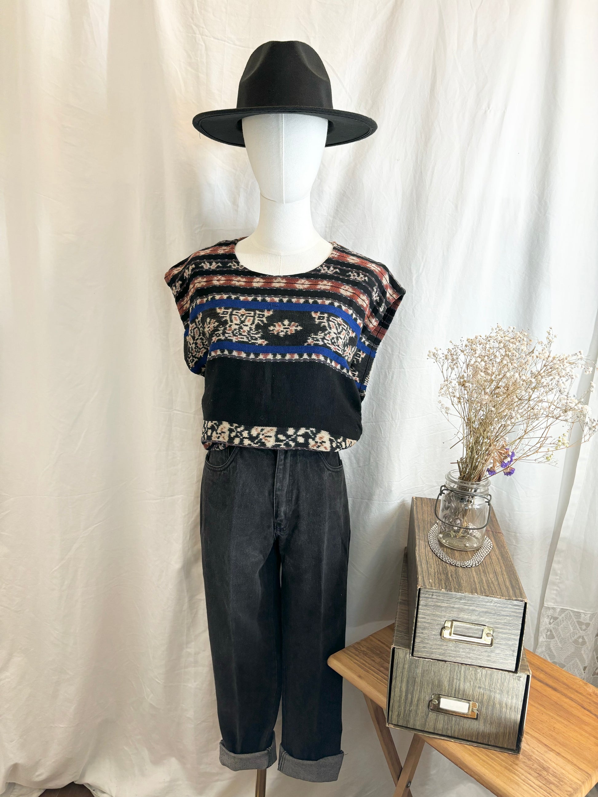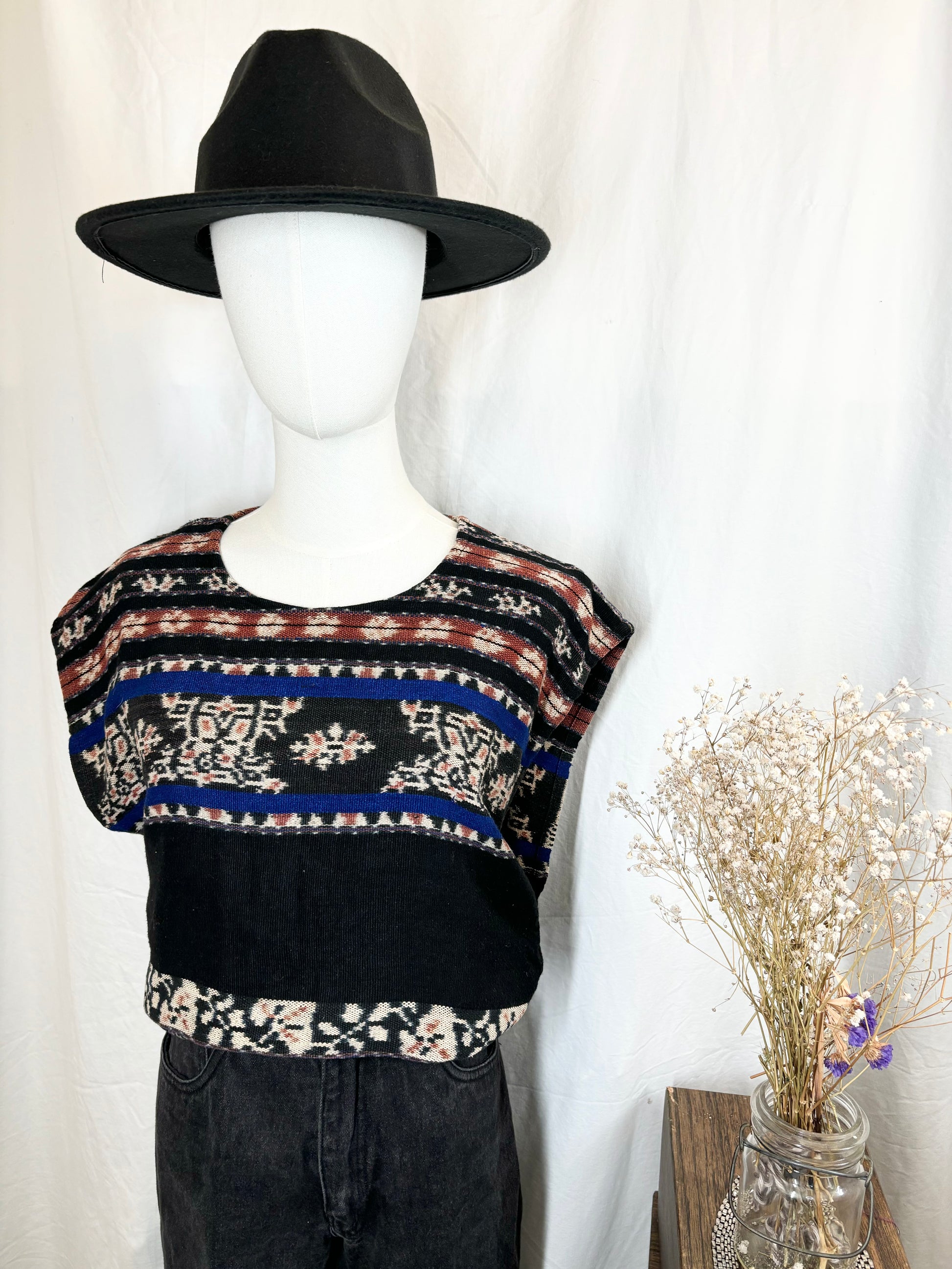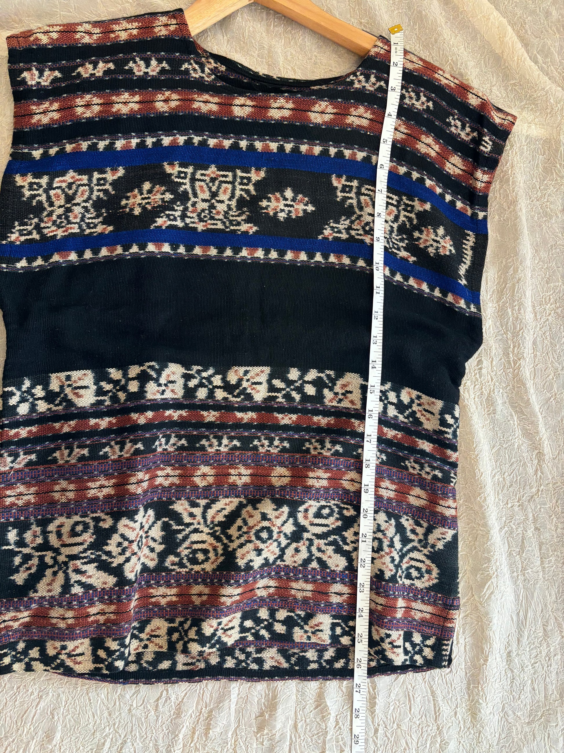 Vintage patterned knit top with earthy tones and a unique, geometric design. This piece brings a touch of retro charm, perfect for layering or wearing as a statement on its own. Please note that it doesn’t have a size tag, but it has a relaxed fit that can work well for various sizes. A truly one-of-a-kind find!