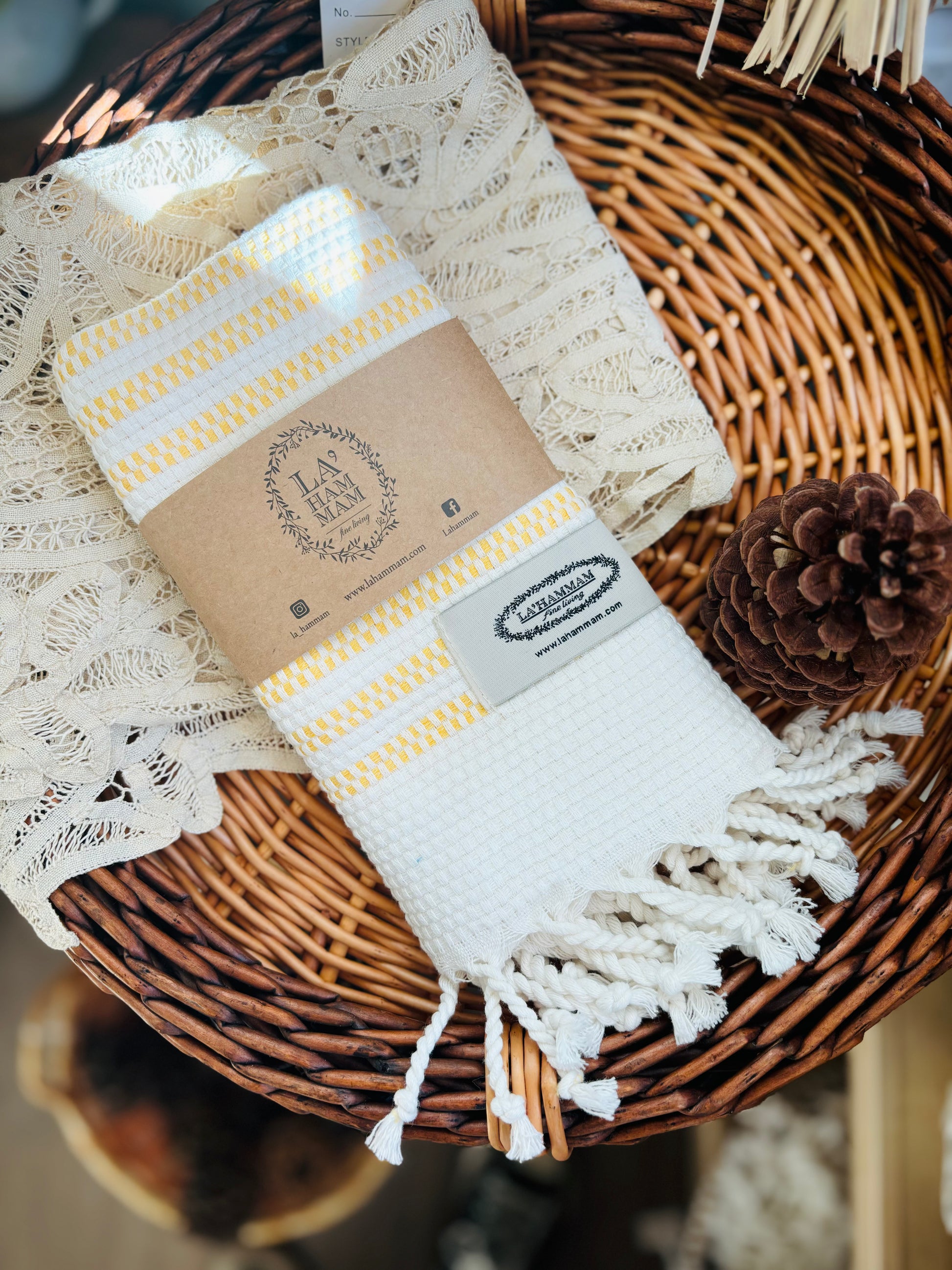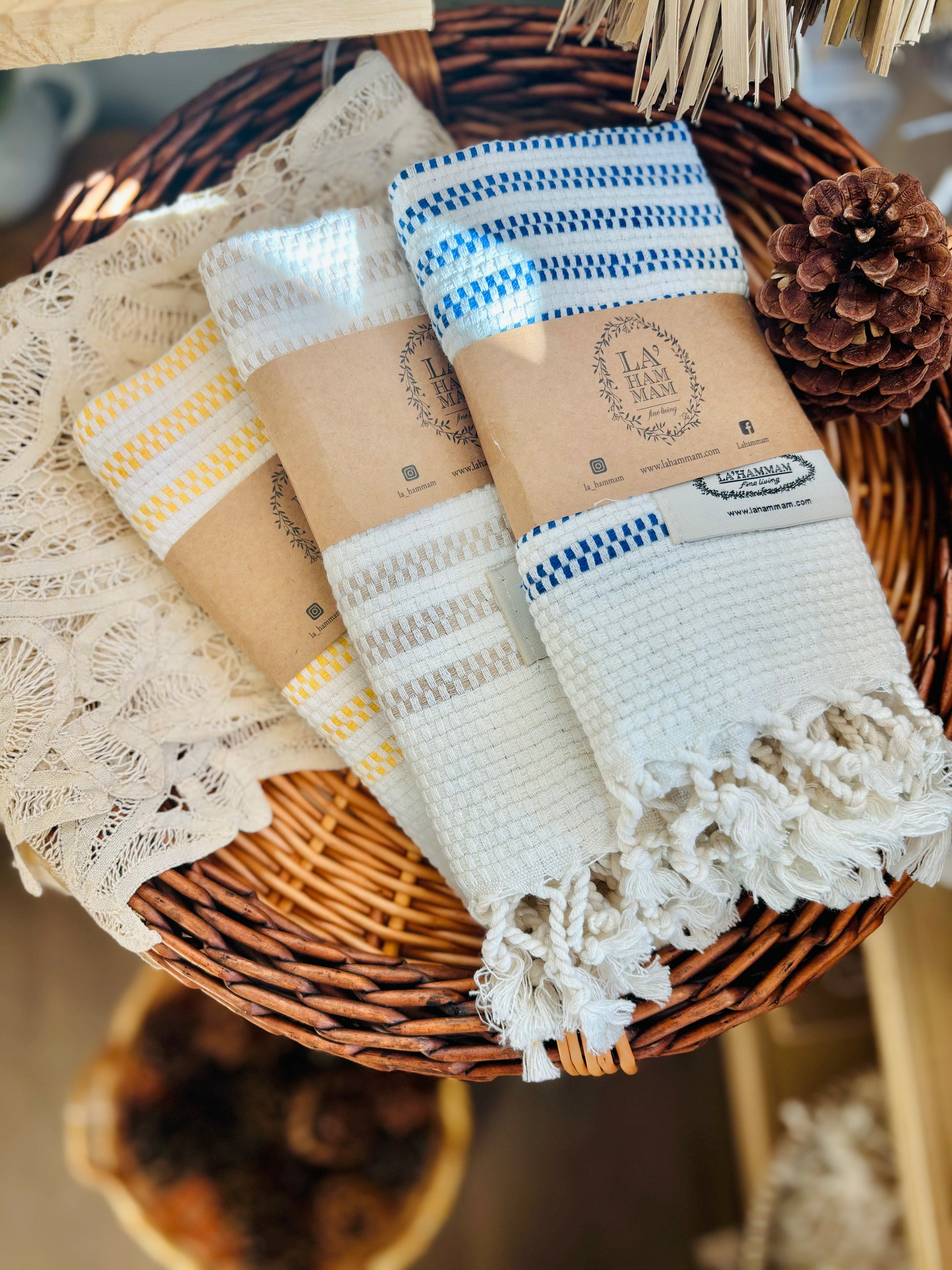 Upgrade your everyday use with Coastal Comfort Towel. These unique cotton Turkish peshtemal towels can be used in the kitchen or as a go-to hand towel, placemat, dish towel, and more. Made with long-staple Turkish cotton, known for its durability and softness. Choose from white or striped with handmade fringes.