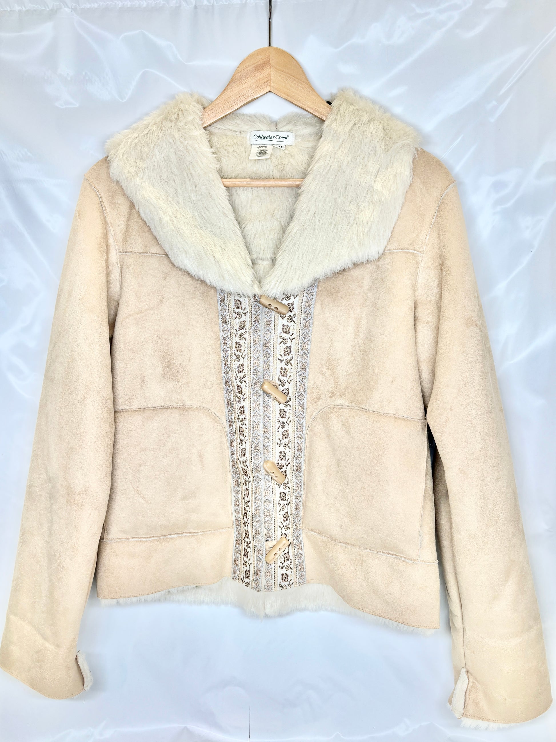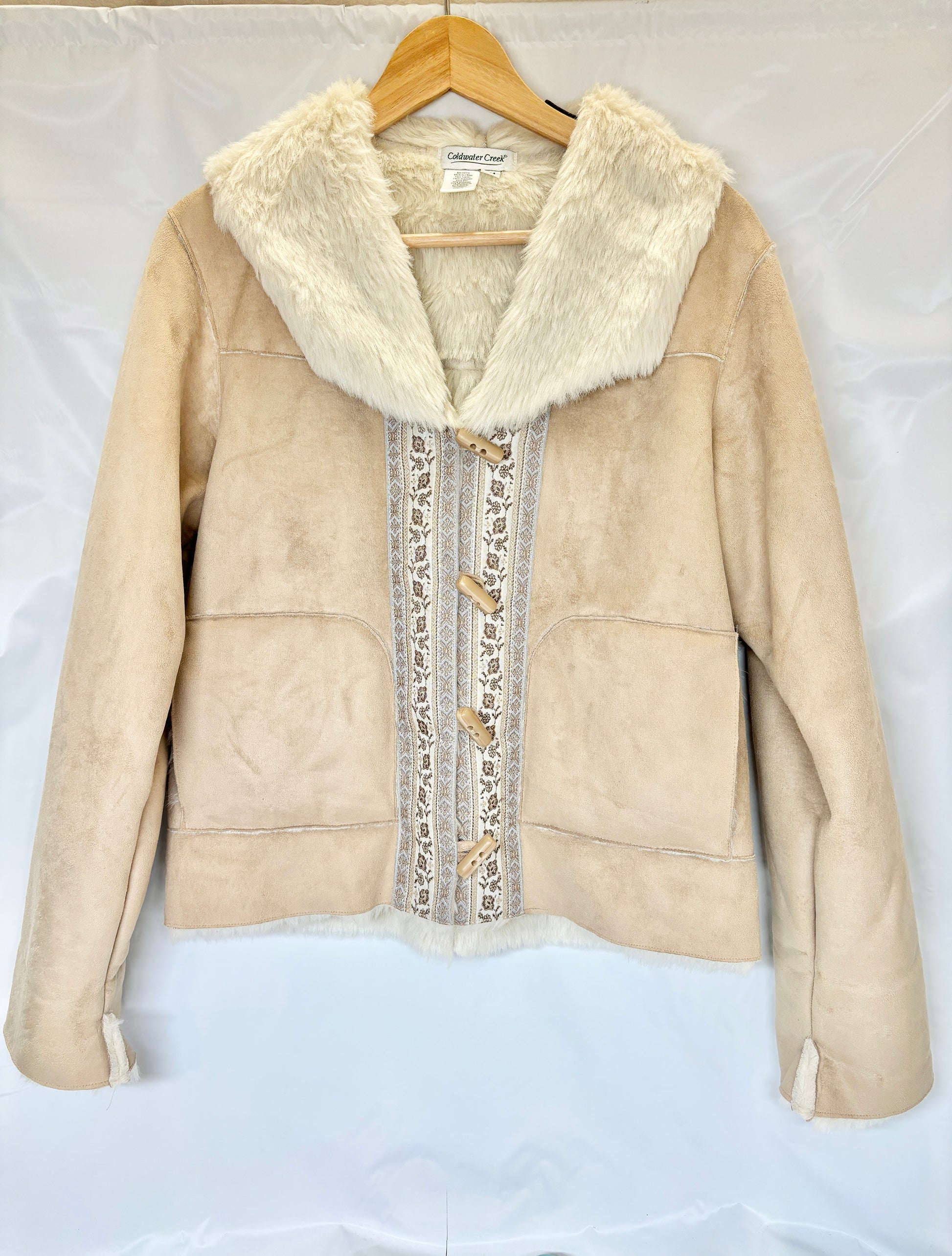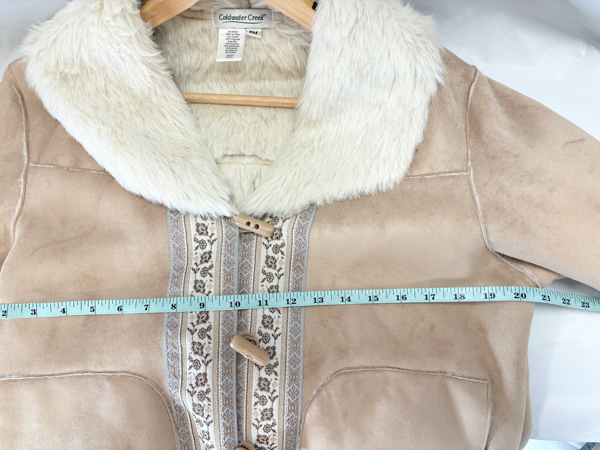 Western-inspired charm to your wardrobe with this Coldwater Creek faux suede jacket in Petite Medium. Featuring a soft sherpa lining and trim, this piece brings warmth and style perfect for chilly days and casual layering.