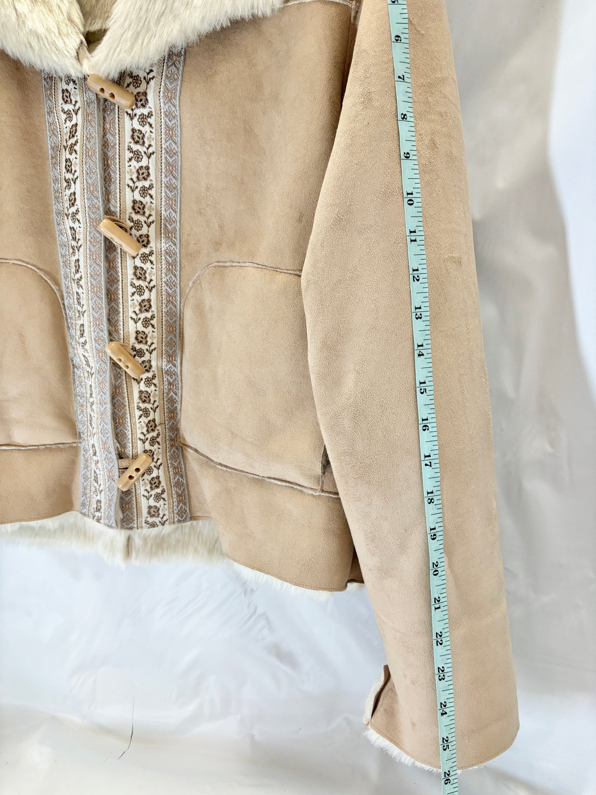 - Color: Tan / Camel faux suede with ivory sherpa trim