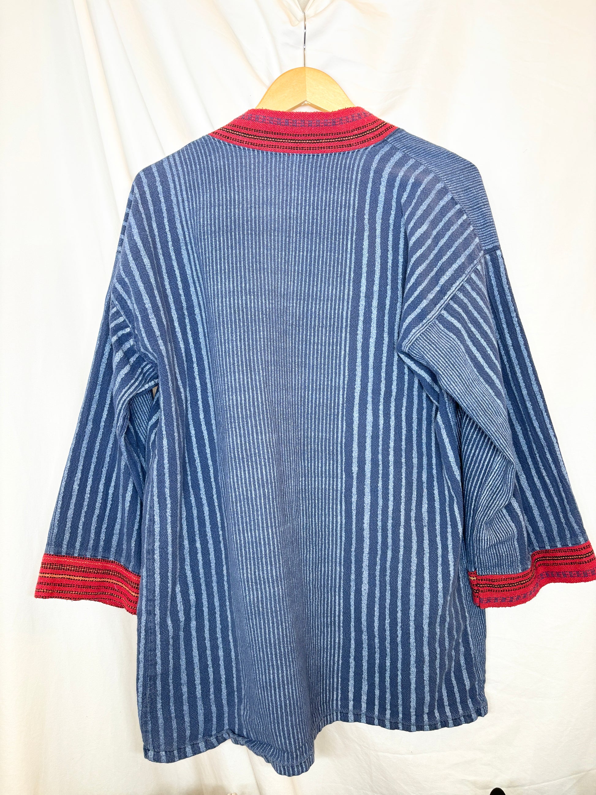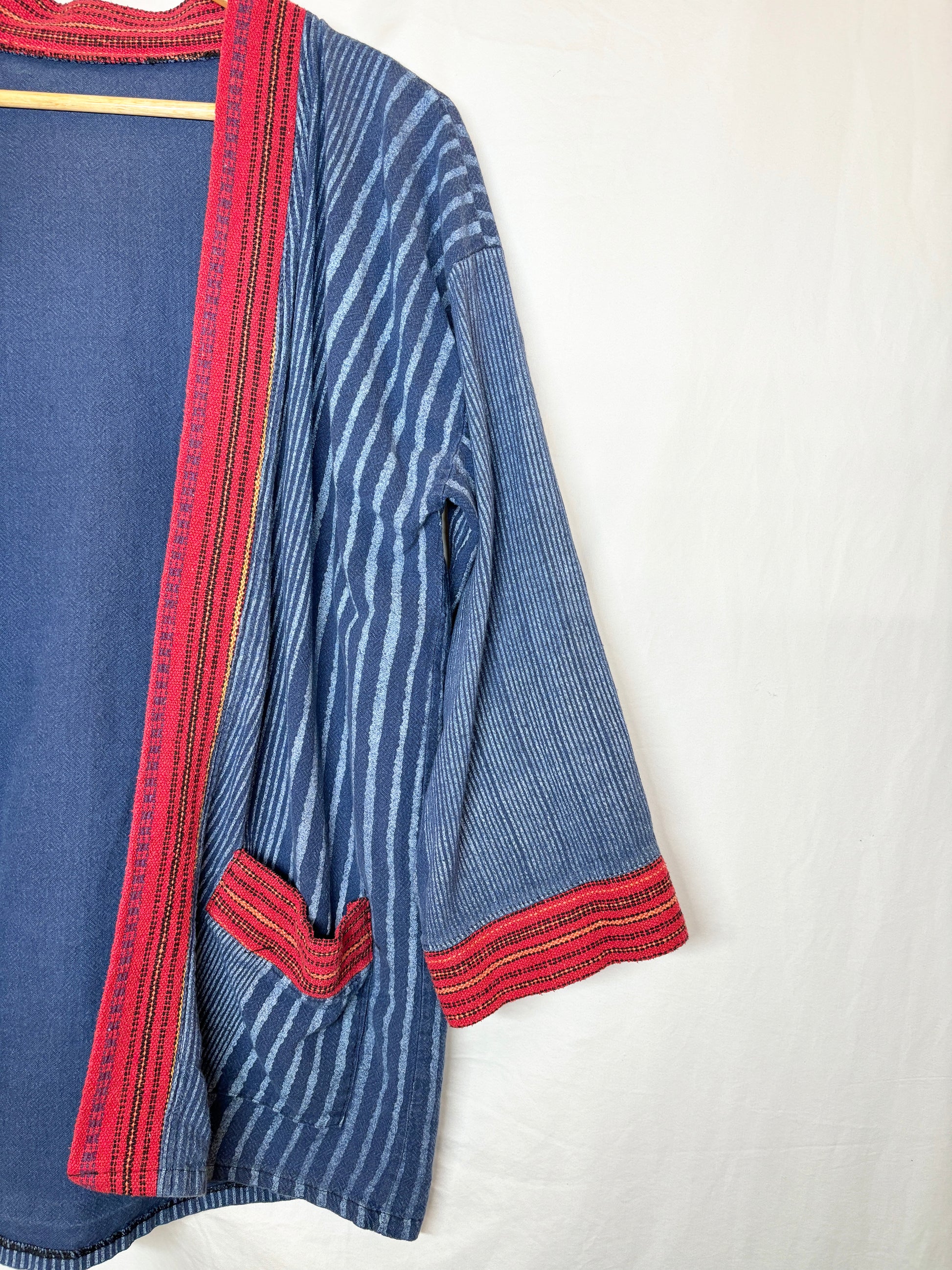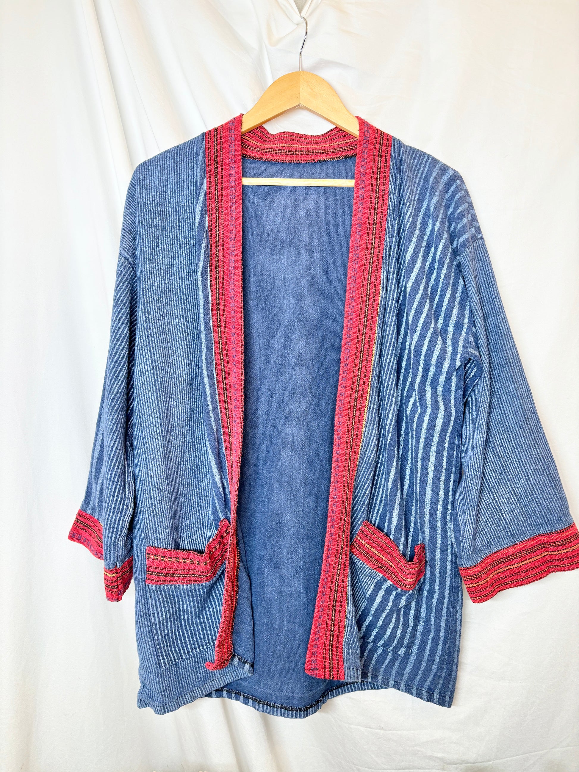 This vintage indigo kimono features an open front and a relaxed fit, bringing effortless bohemian charm to any outfit. With its unique pattern and soft drape. The character of the fabric and details give it a one-of-a-kind appeal that stands out in any wardrobe.