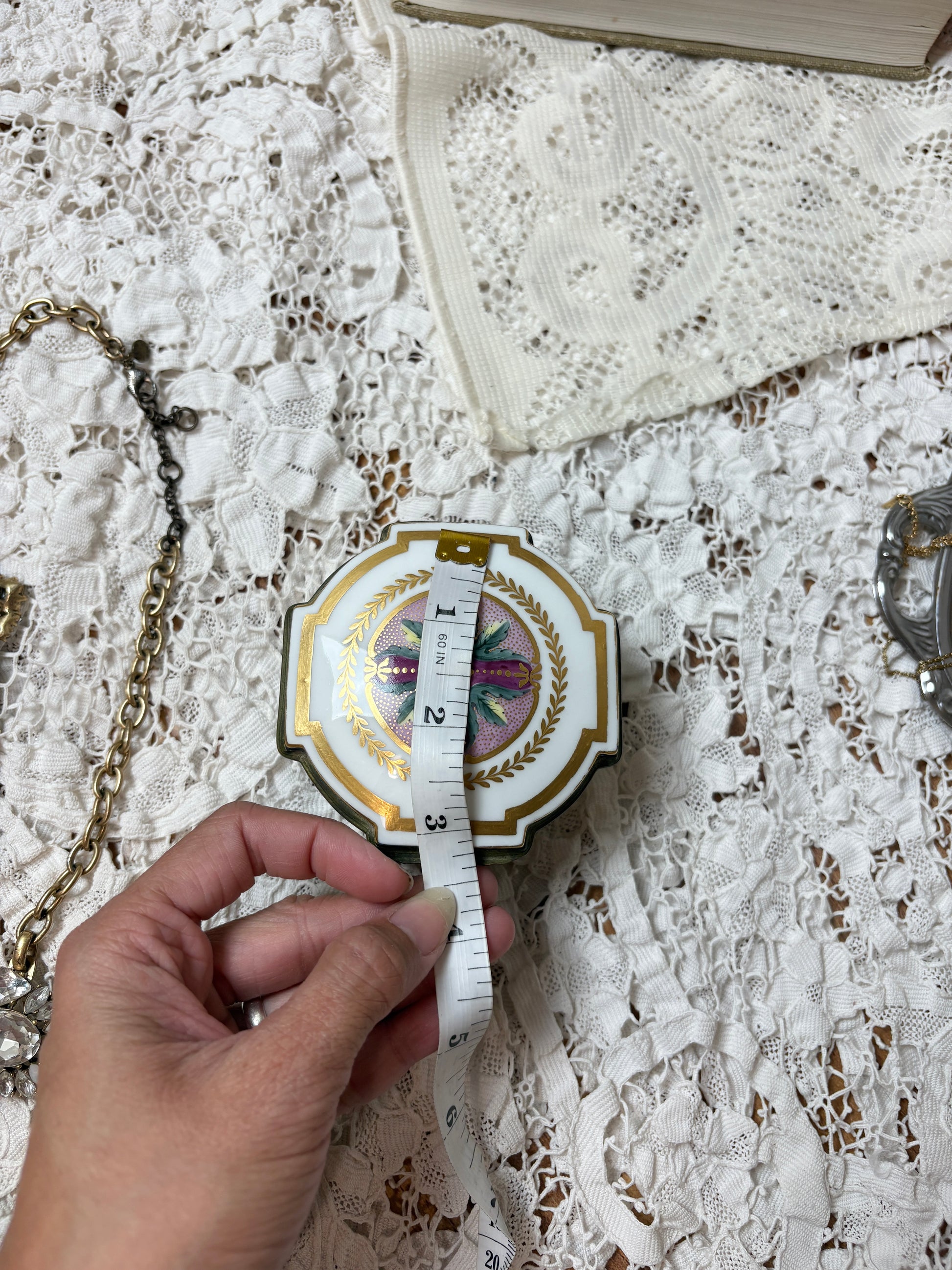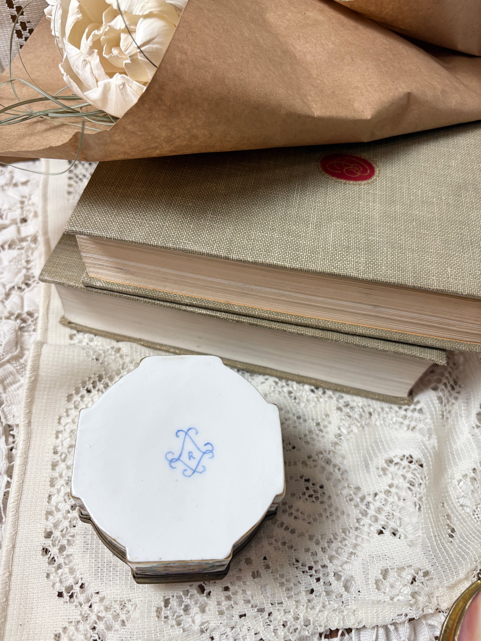 This beautiful vintage Italian porcelain trinket box features an elegant octagonal shape with hand-painted floral designs and delicate gold trim. It reflects the charm of Capodimonte or Limoges-style craftsmanship, making it a timeless collectible or a lovely gift.
