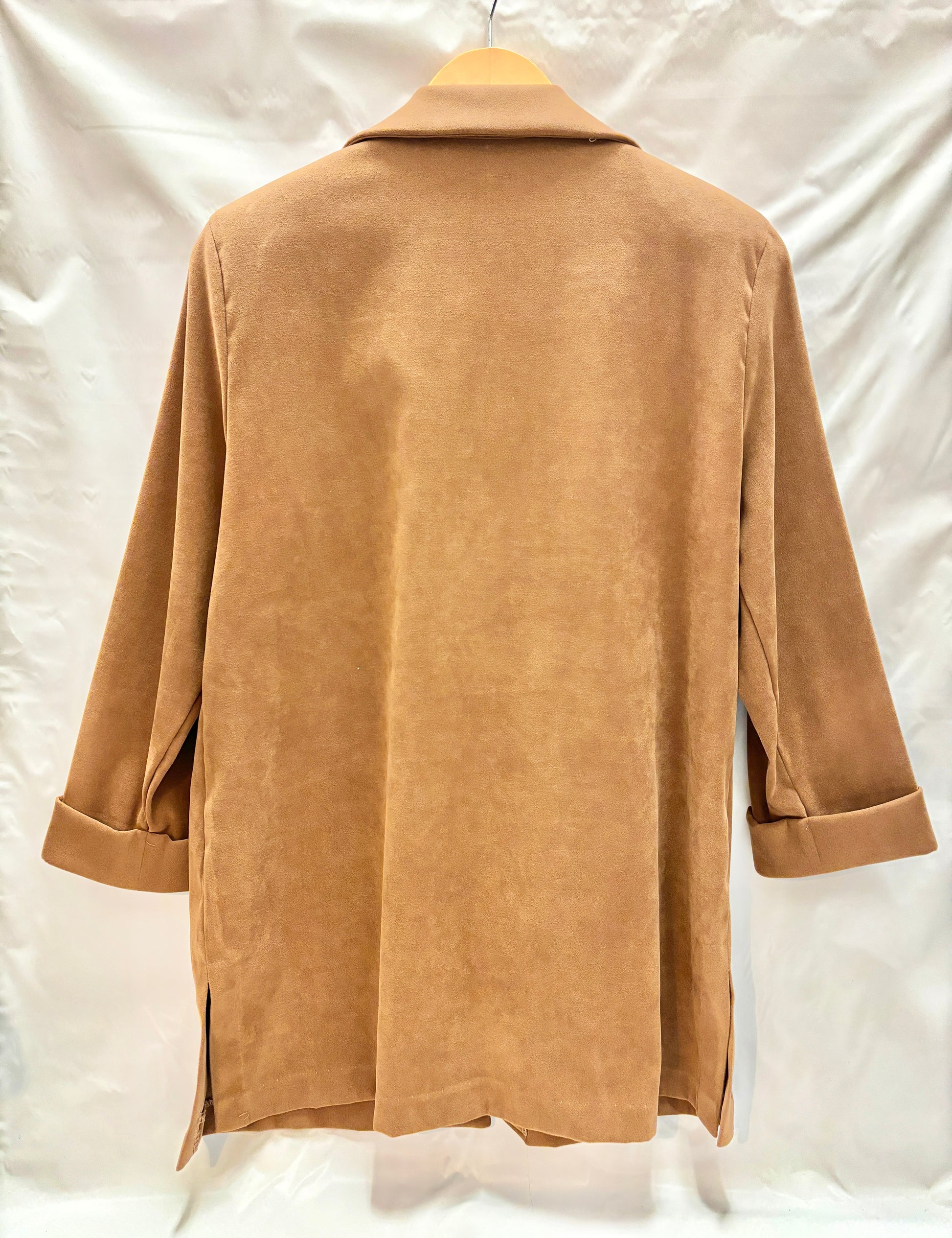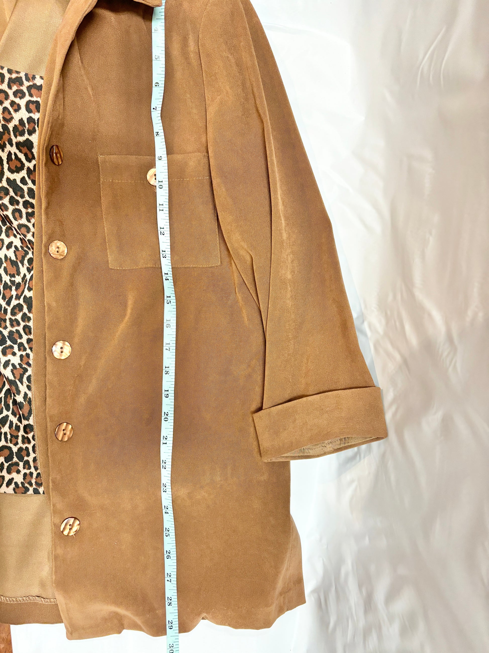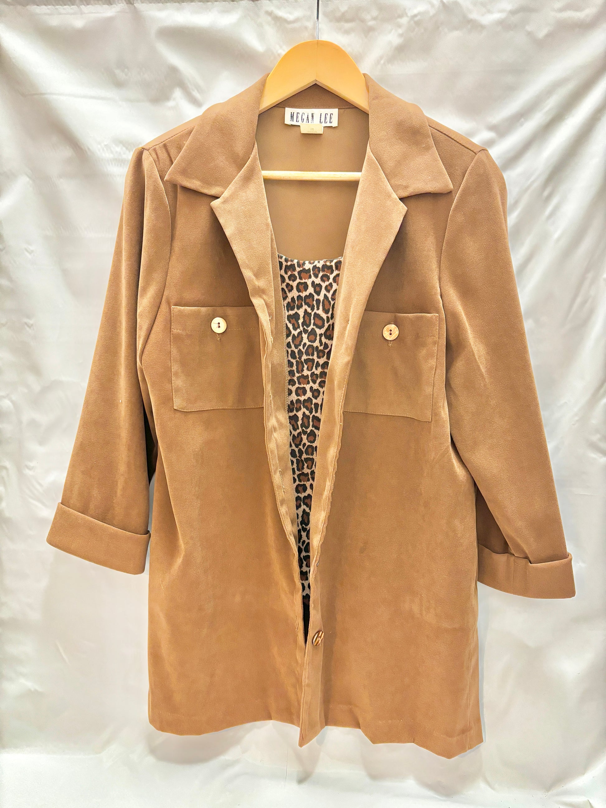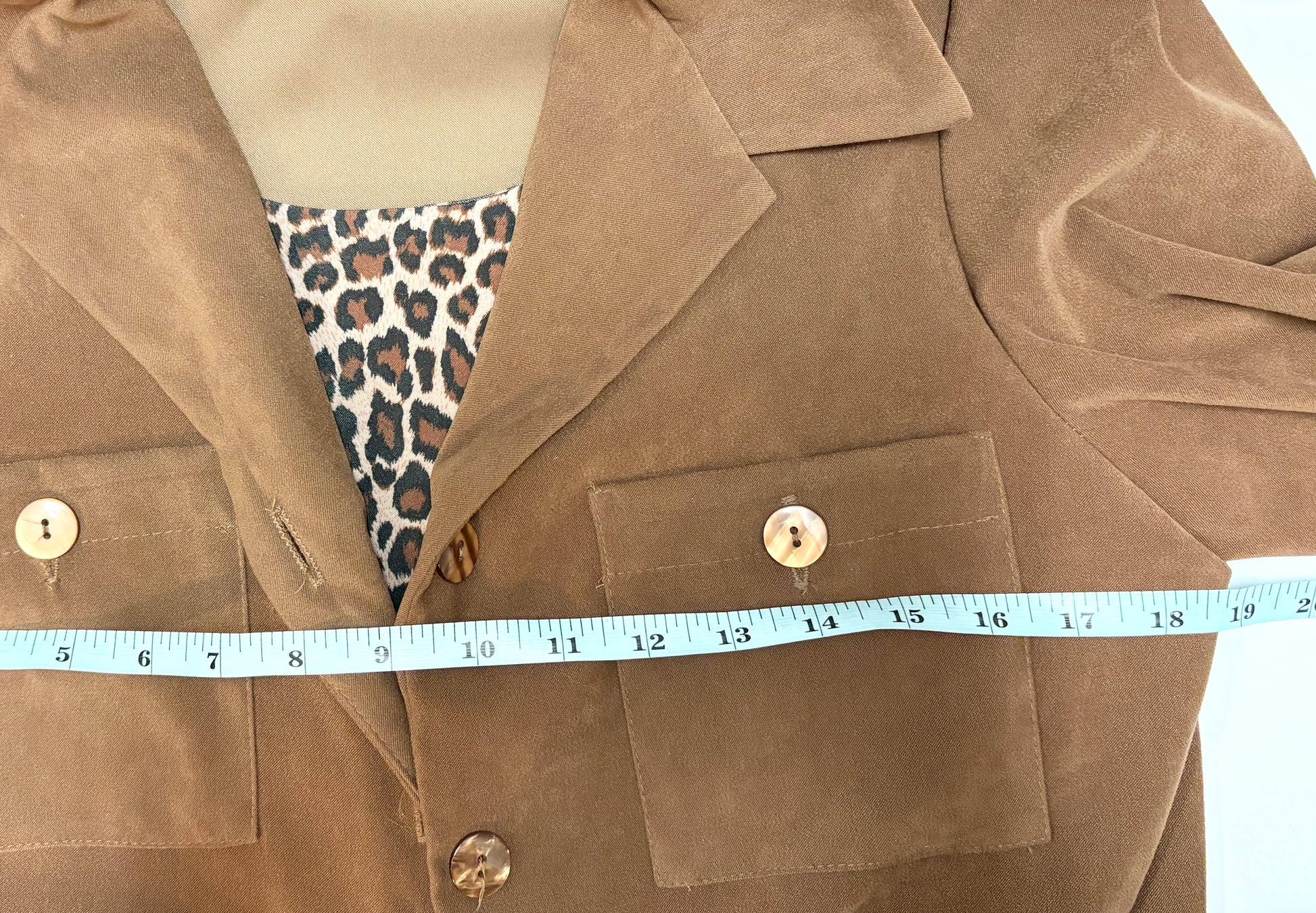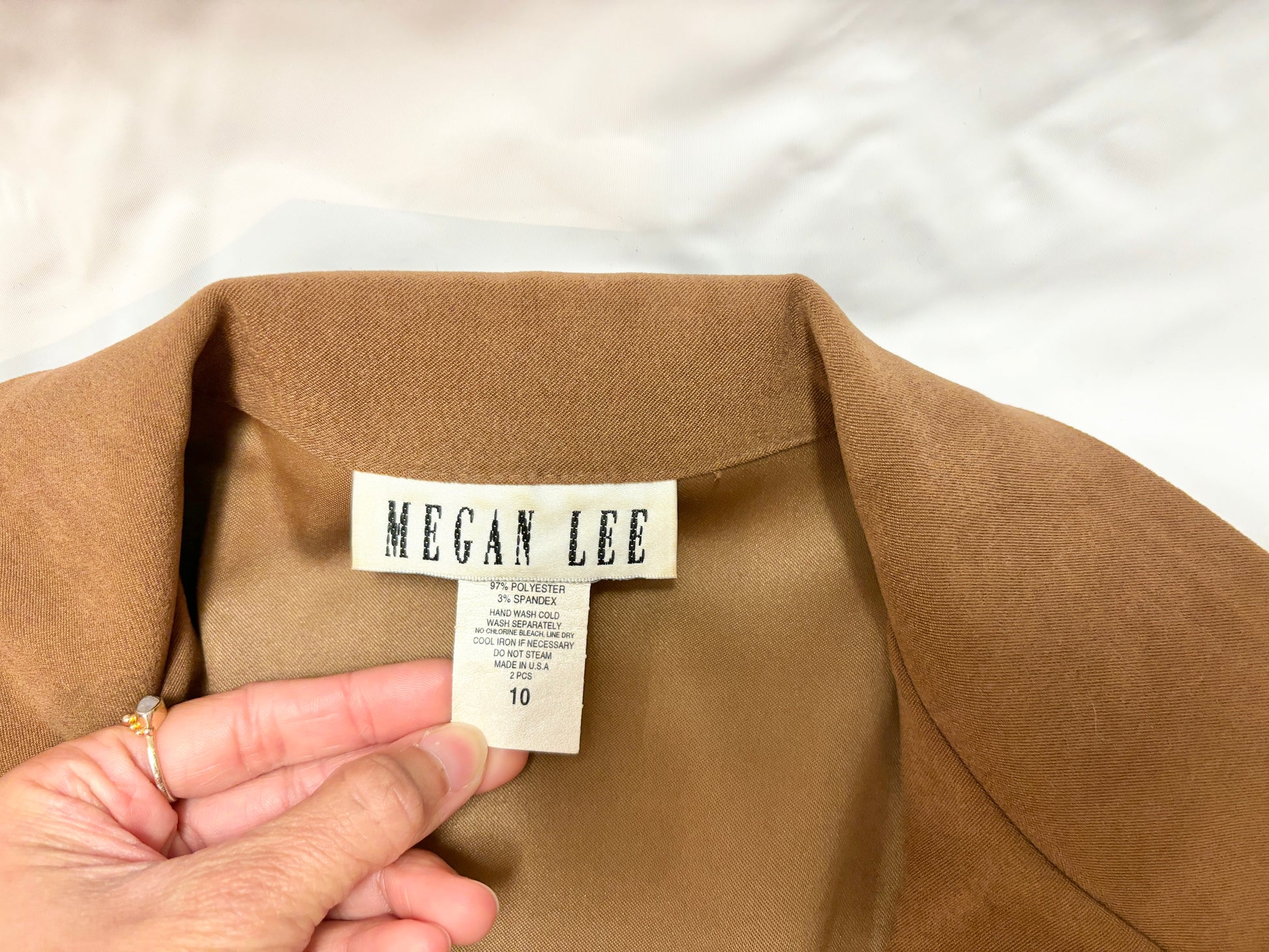 Add a touch of timeless style to your wardrobe with this vintage Megan Lee jacket in a soft tan suede-like fabric. A perfect blend of structure and subtle flair, featuring: