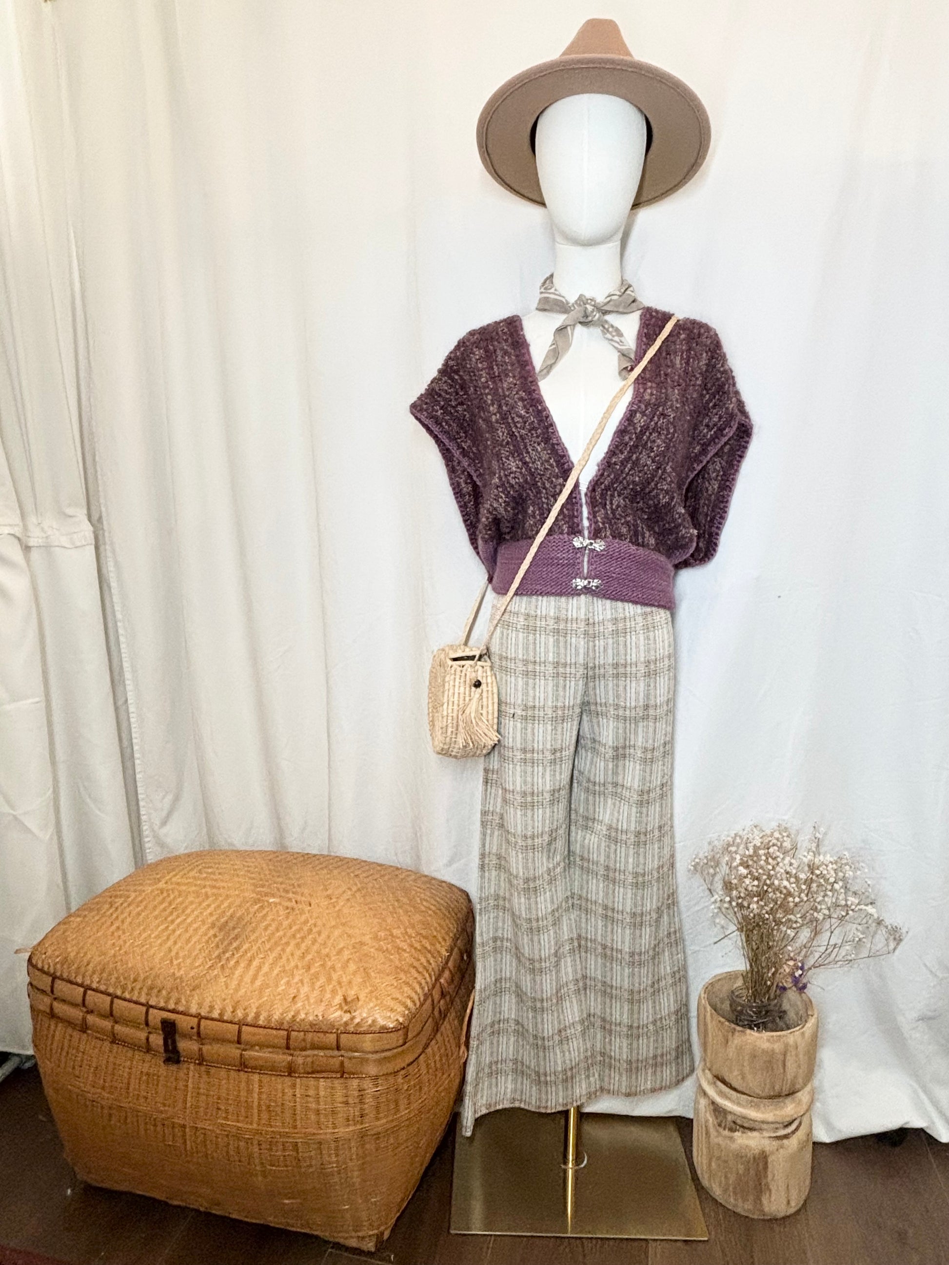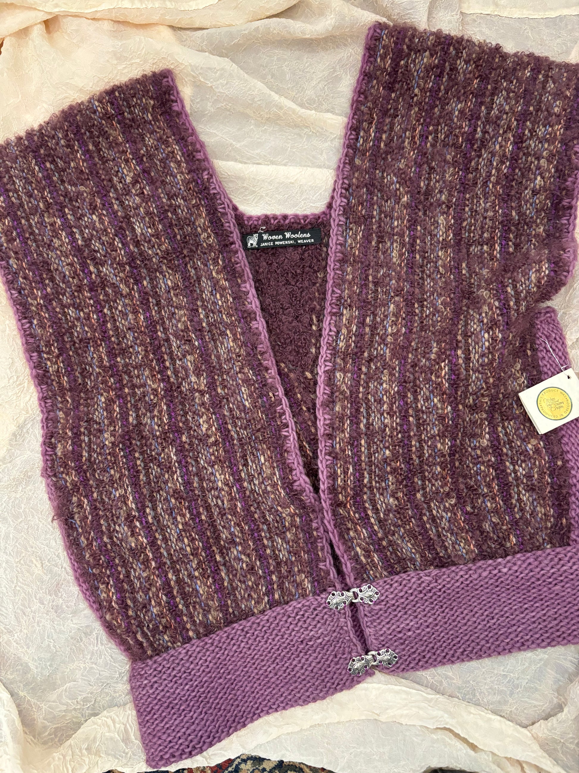 Hand-knit vintage crochet sleeveless cardigan in rich purple wool, crafted by Woven Woolens artisan Janice Powerski. This retro-inspired piece is free size and full of character—so neat and cozy!