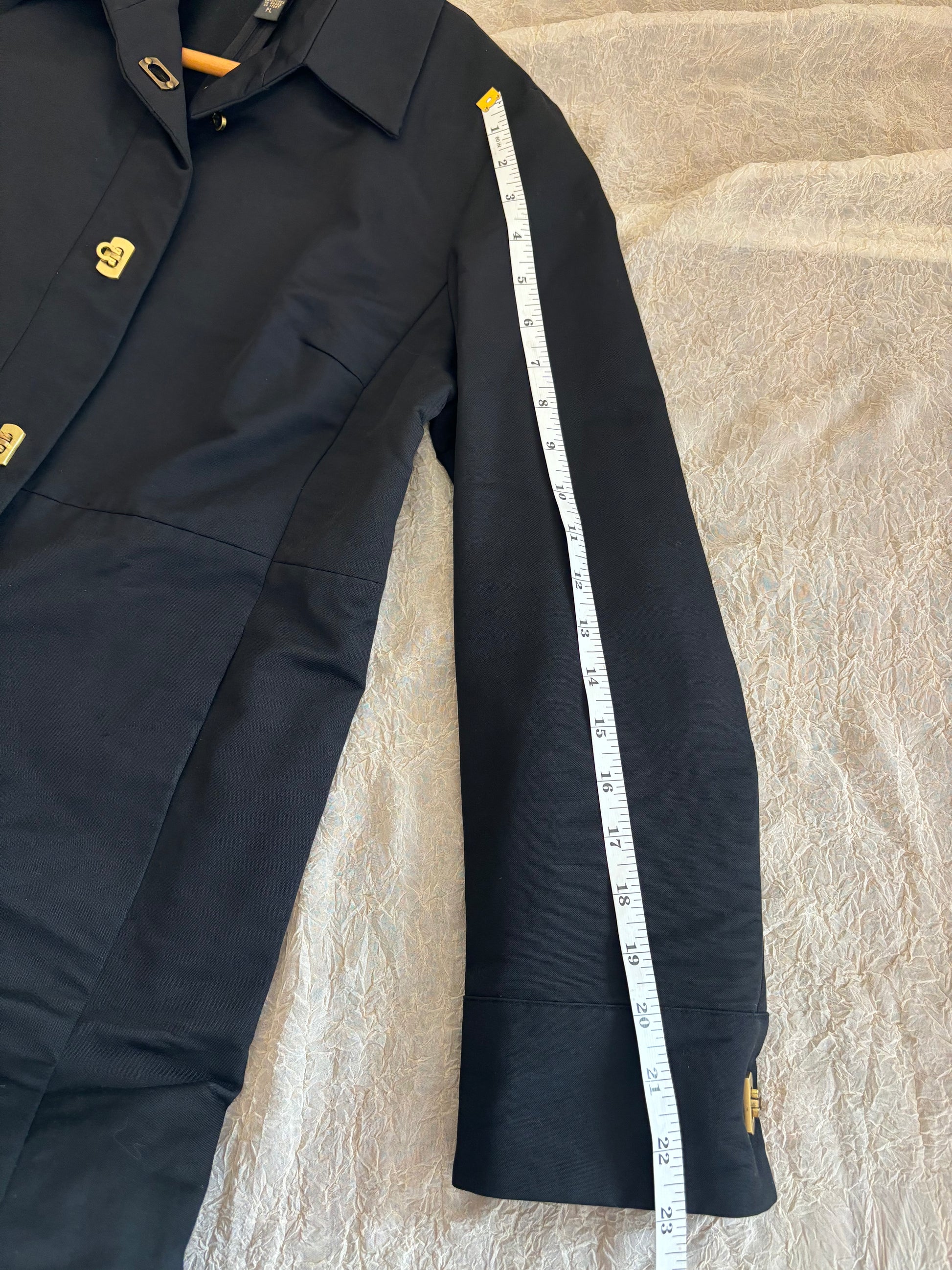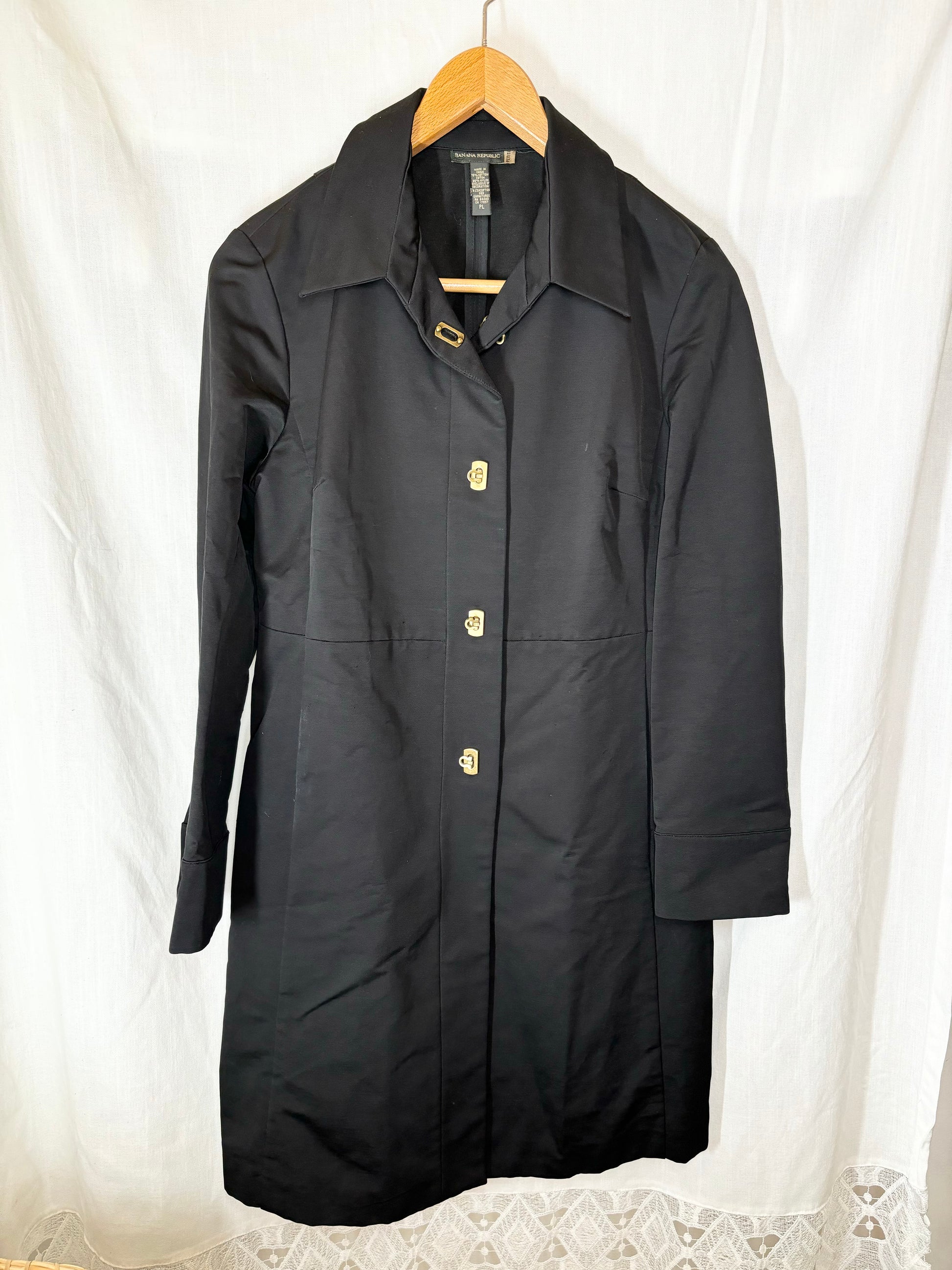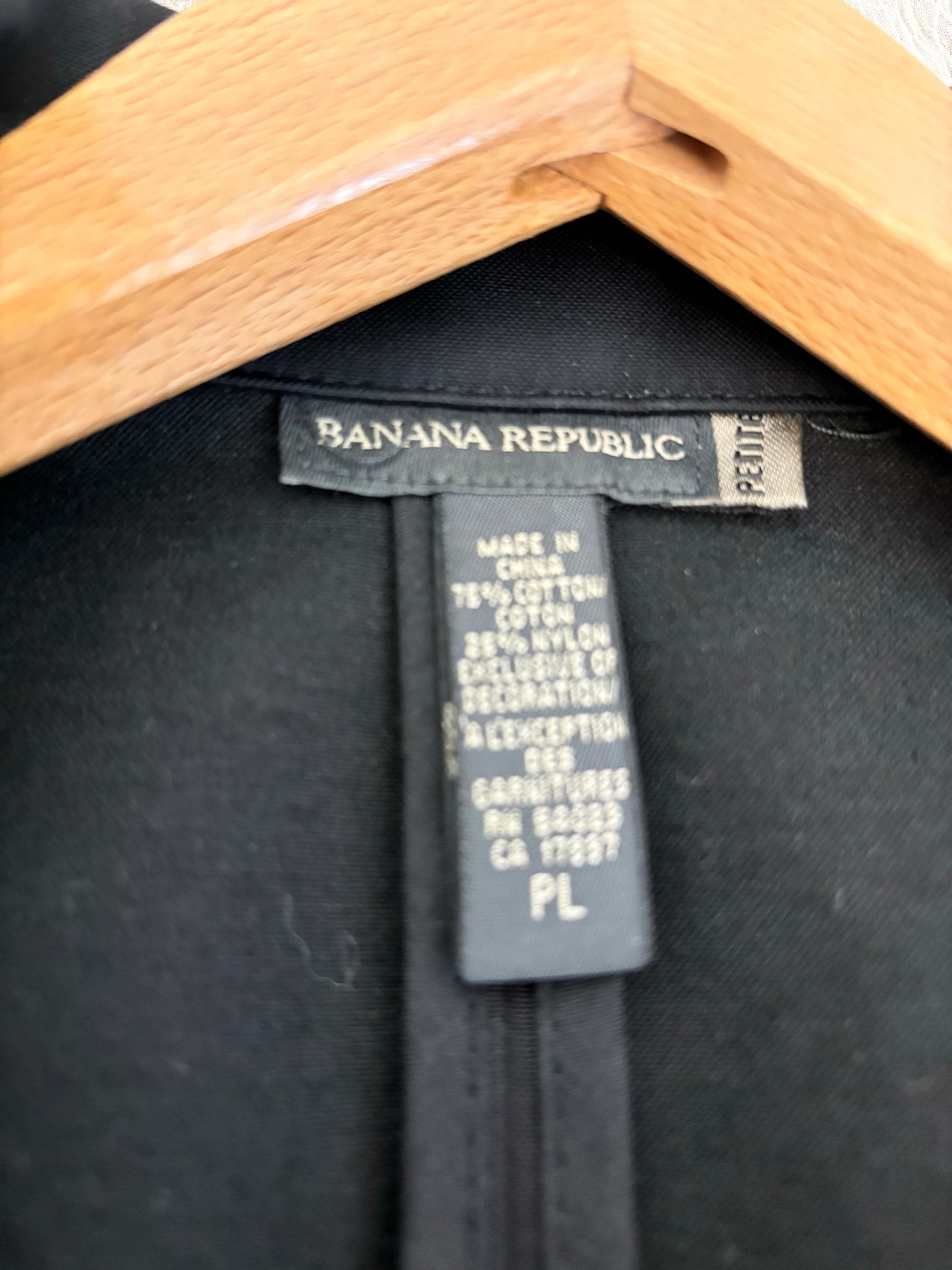 Banana Republic Women’s Collared Trench Coat – Size Petite Large (PL), fitting approximately a size 12-14. This long raincoat features classic trench details, including adjustable buckles and a sophisticated collar, perfect for stylish, weather-ready wear.