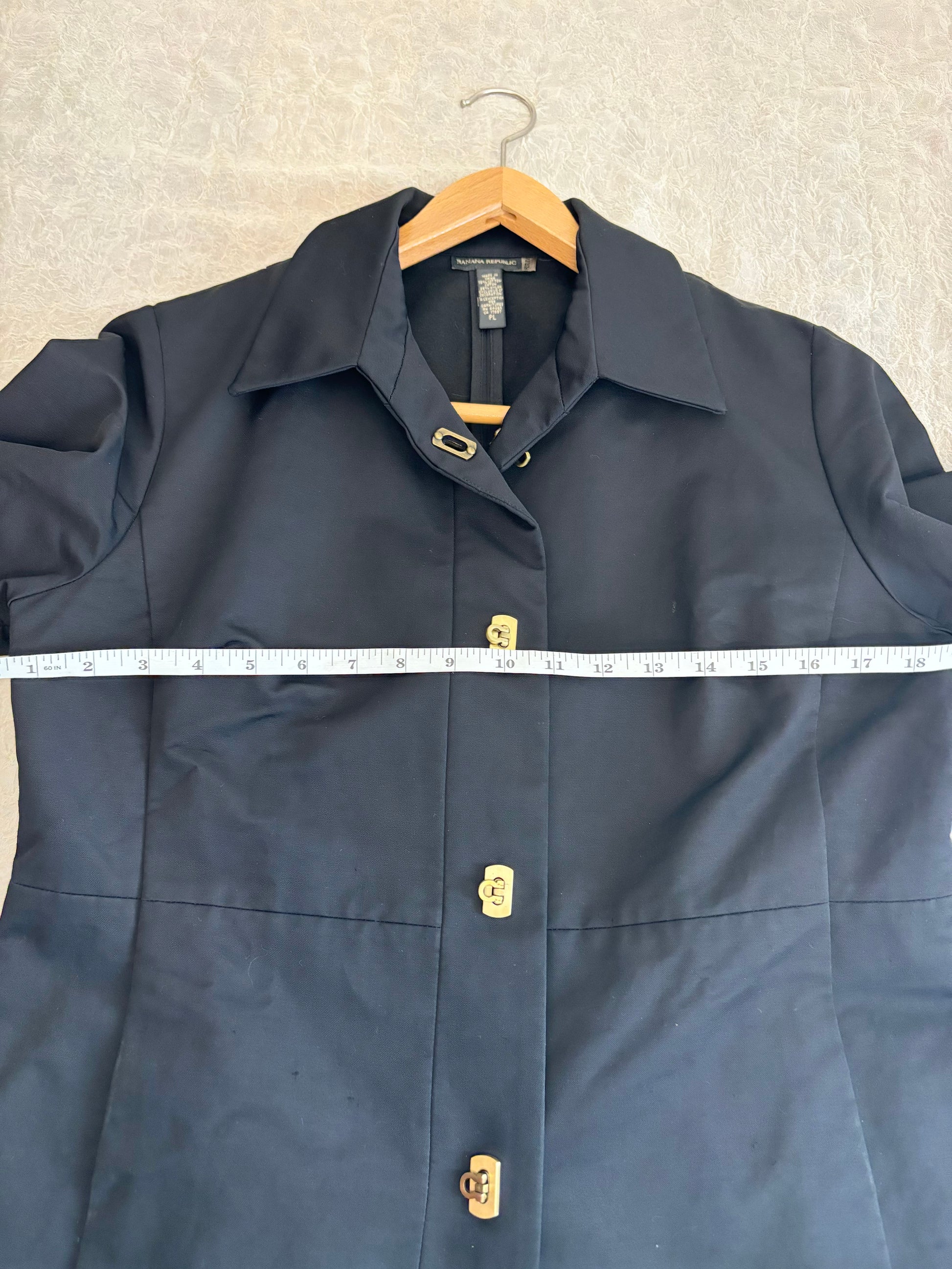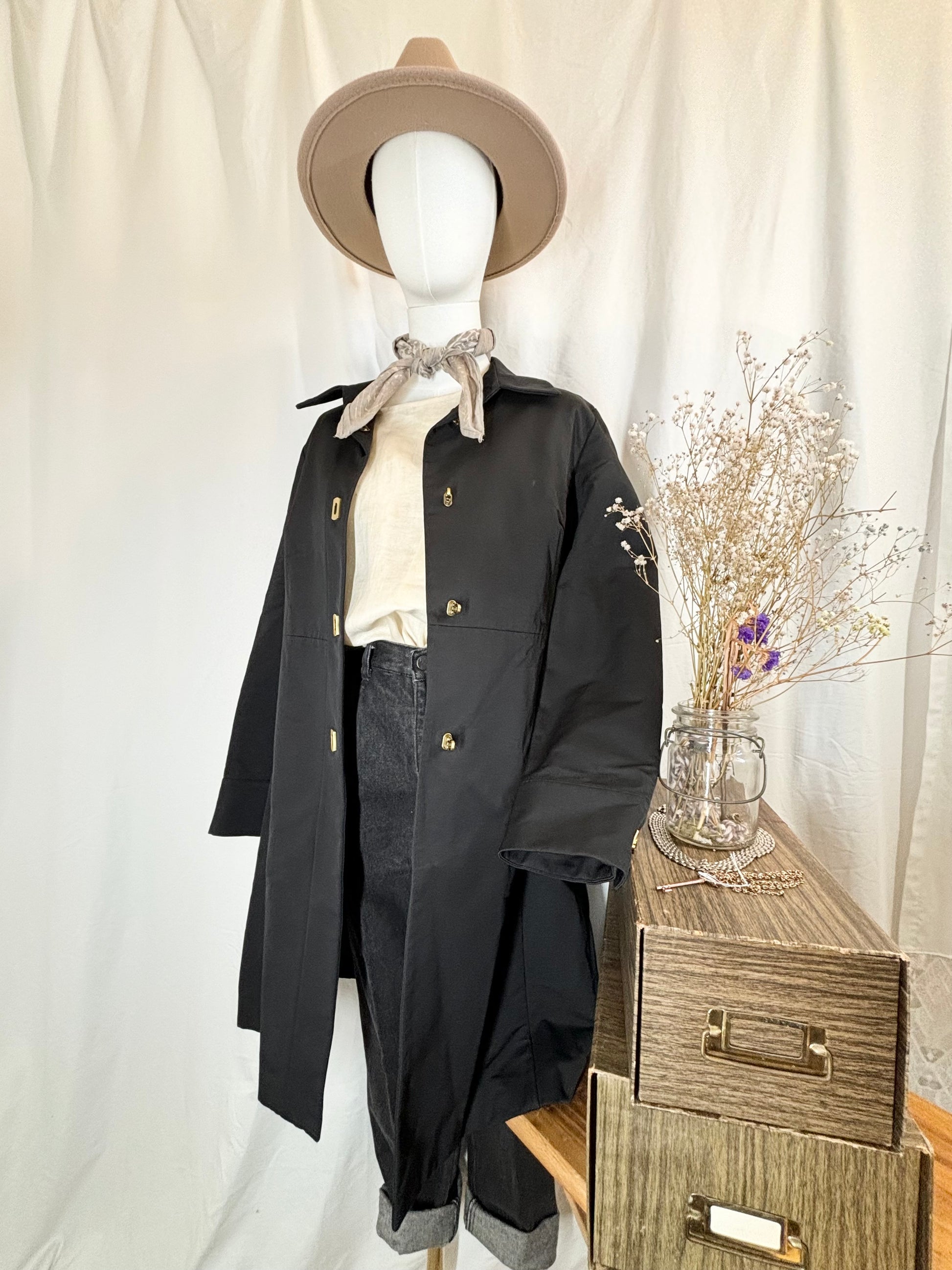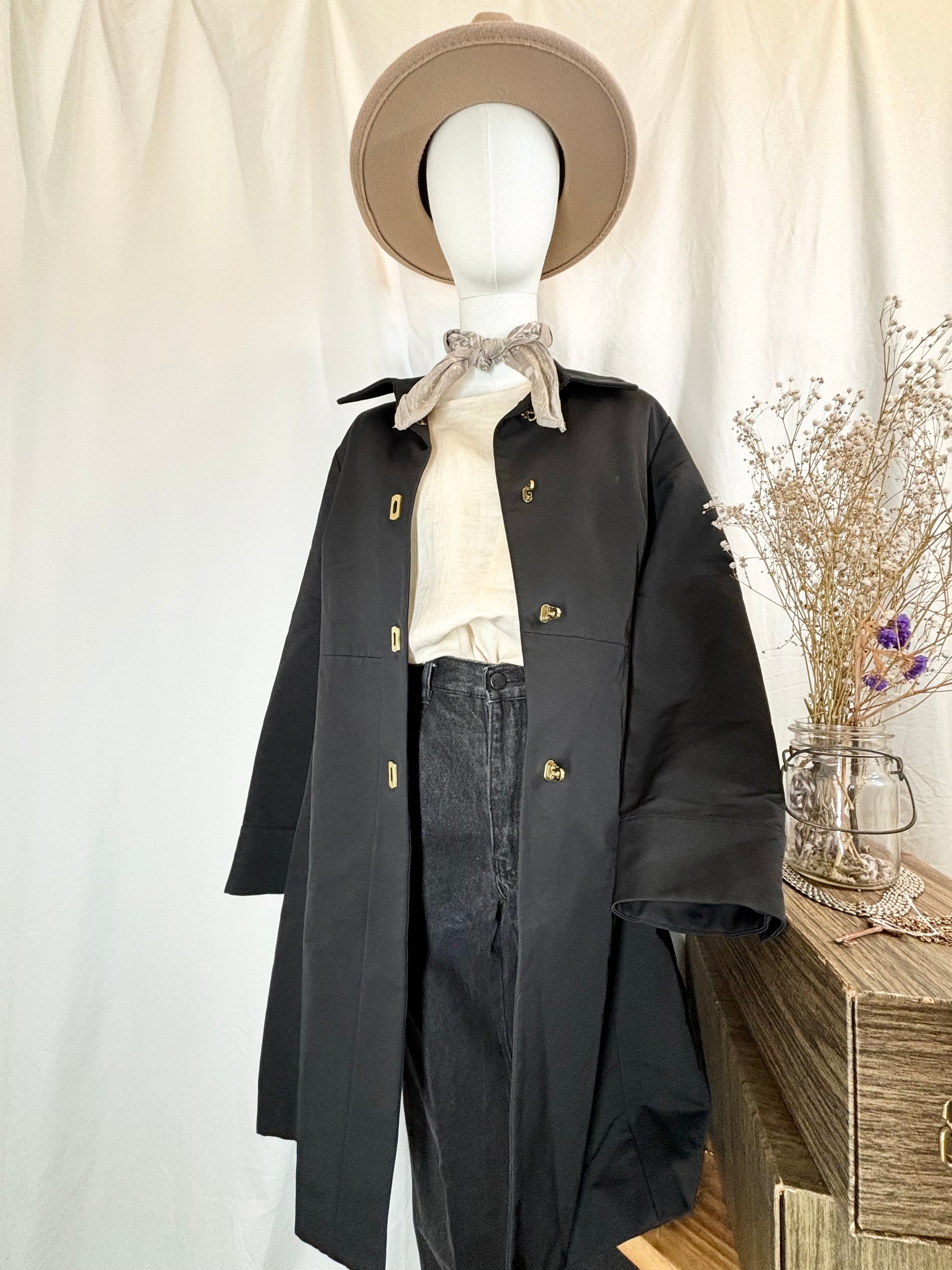 Banana Republic Women’s Collared Trench Coat – Size Petite Large (PL), fitting approximately a size 12-14. This long raincoat features classic trench details, including adjustable buckles and a sophisticated collar, perfect for stylish, weather-ready wear.