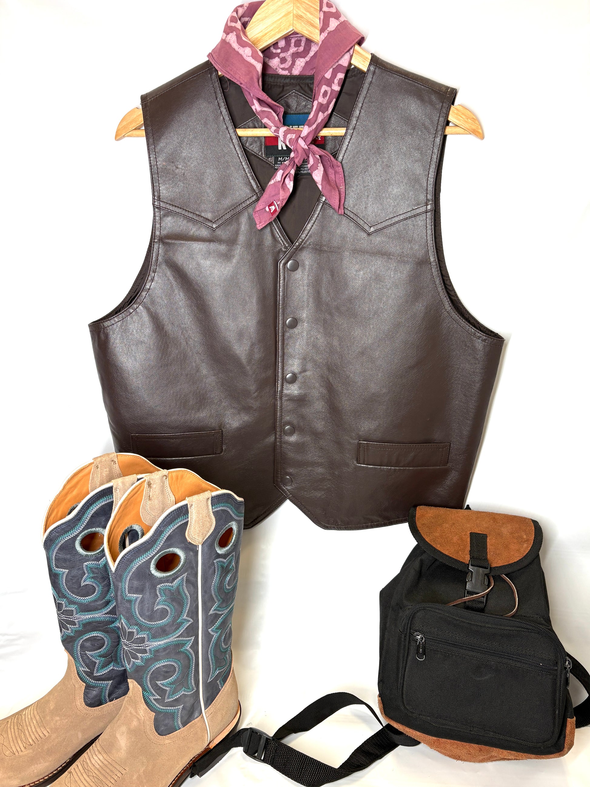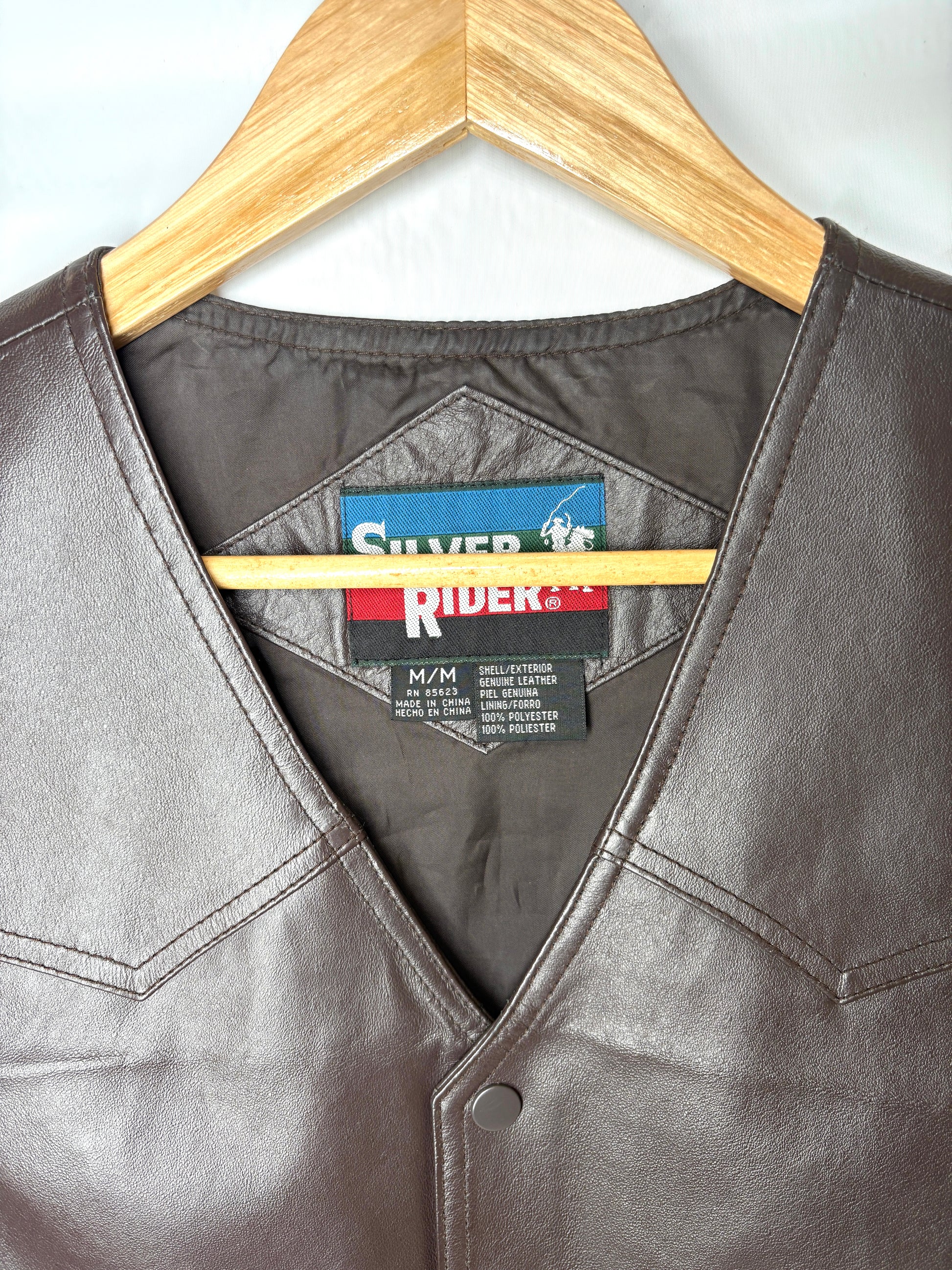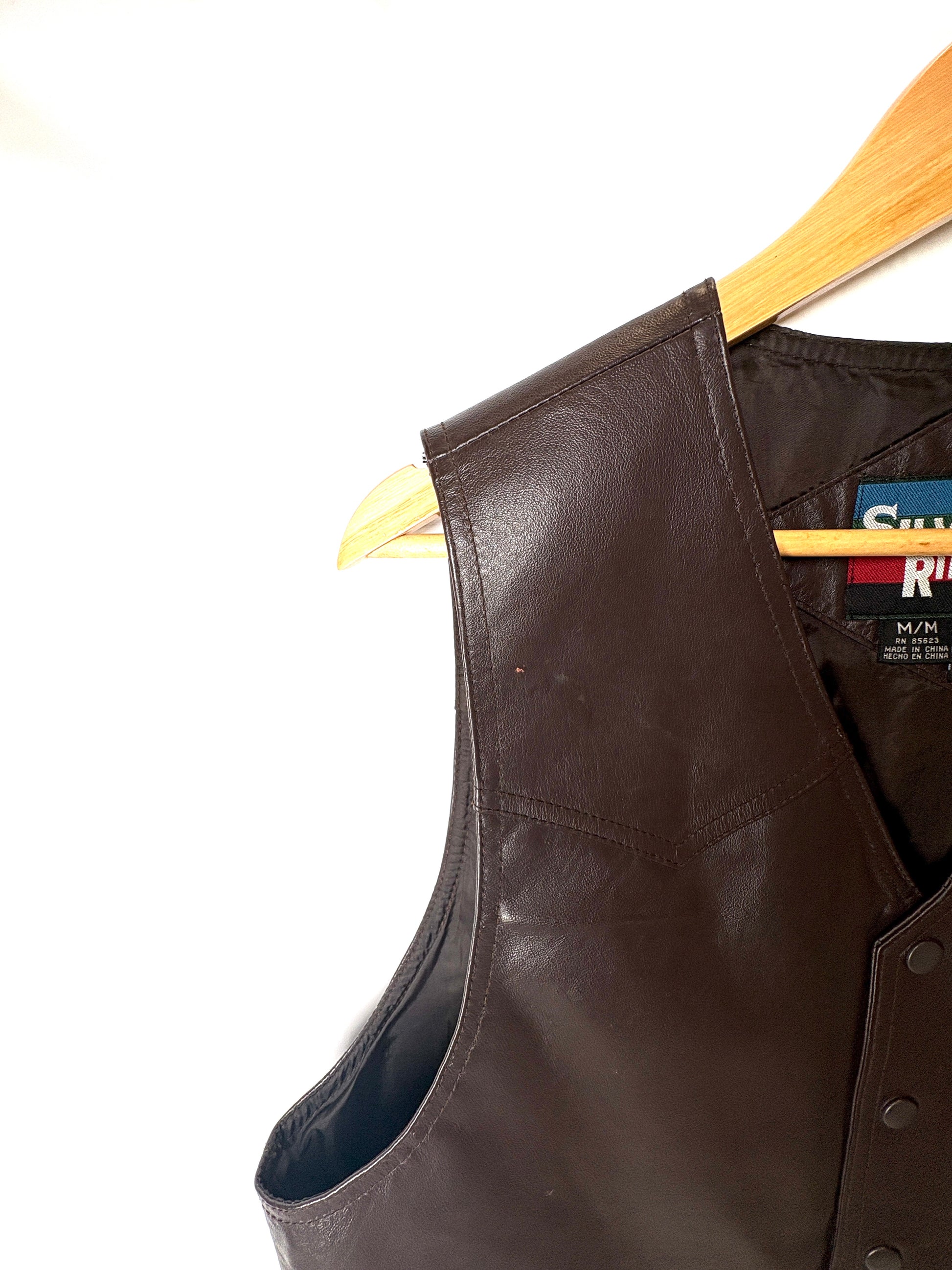 This rugged and stylish brown leather vest from Silver Rider is a versatile piece perfect for casual outings, travel, or even workwear. Made from quality leather with a soft polyester lining, it features a collarless western-style design, snap button closure, and convenient pockets—ideal for adding a bit of cowboy flair to your everyday look.