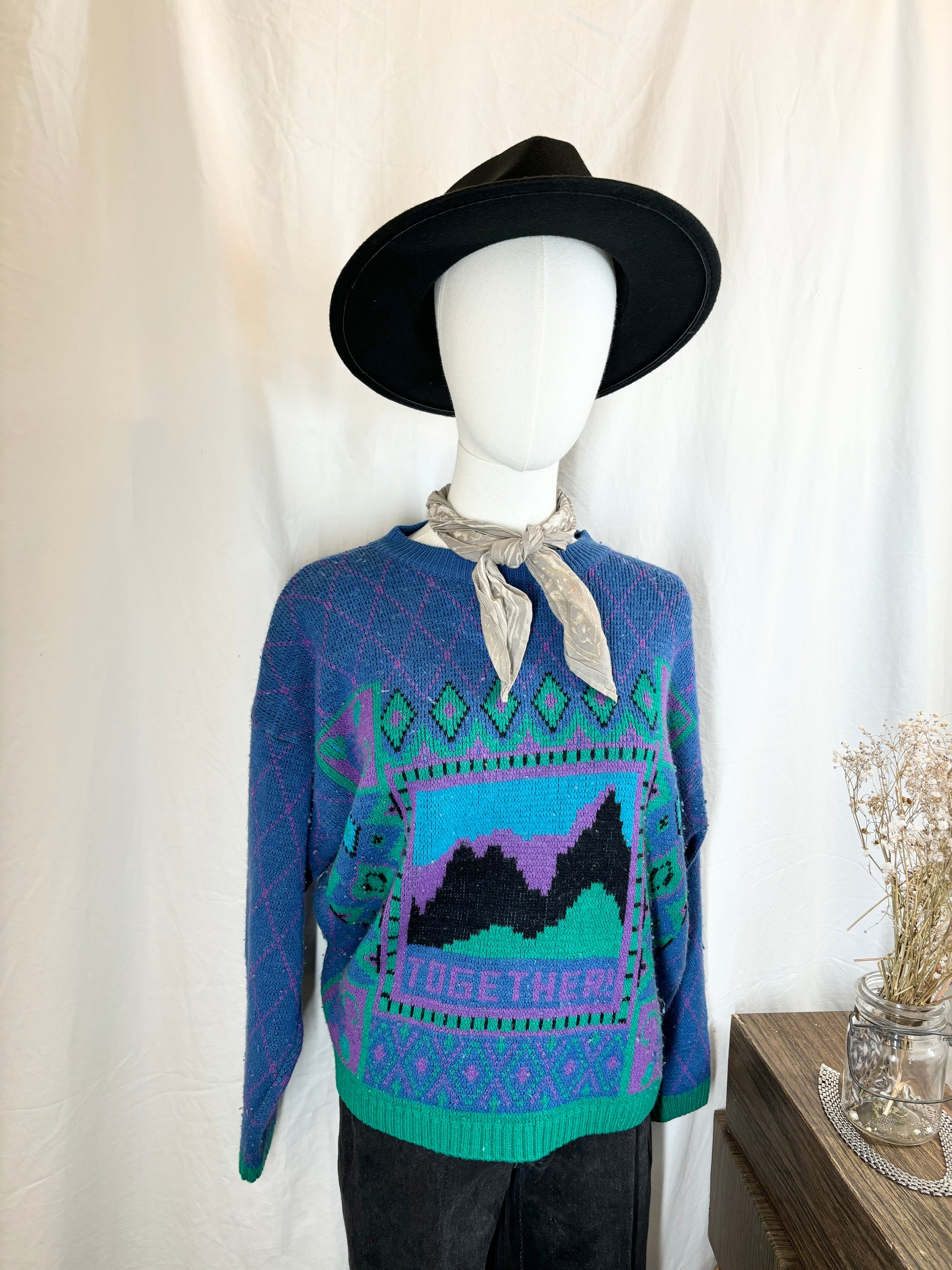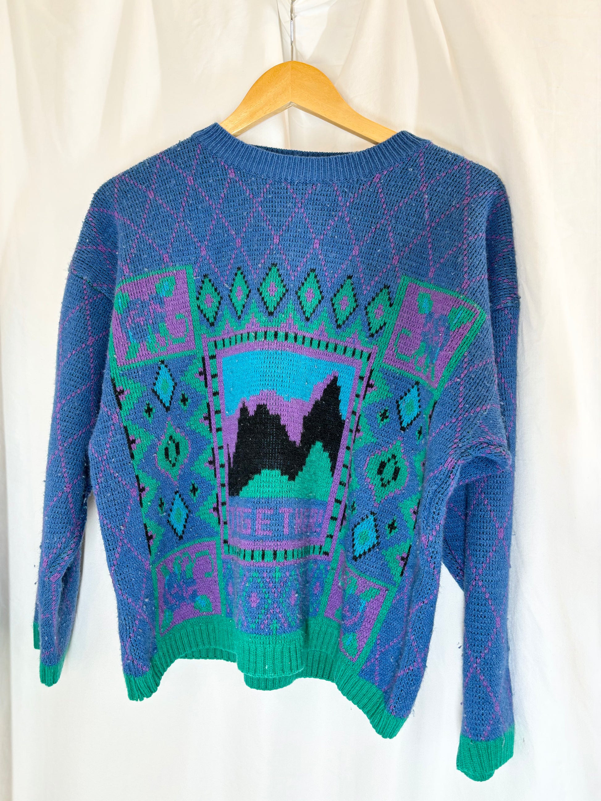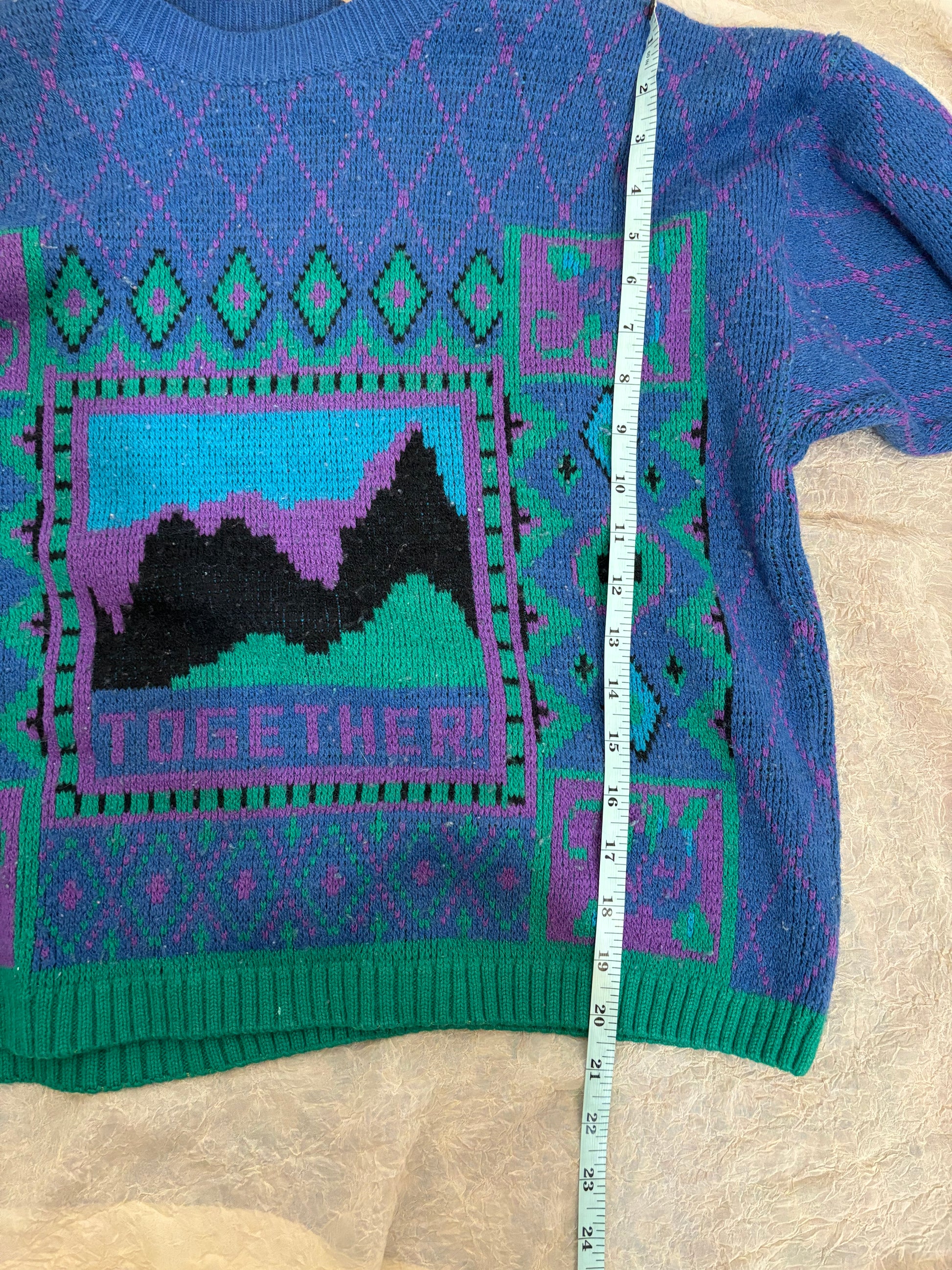 Vintage 1980’s knit sweater in vibrant, fun colors with a playful 'Together' design on the front. This cozy pullover is labeled as an XL, but the sizing may vary, so please refer to measurements in the photos for an accurate fit. Perfect for adding a retro pop of color to any outfit!