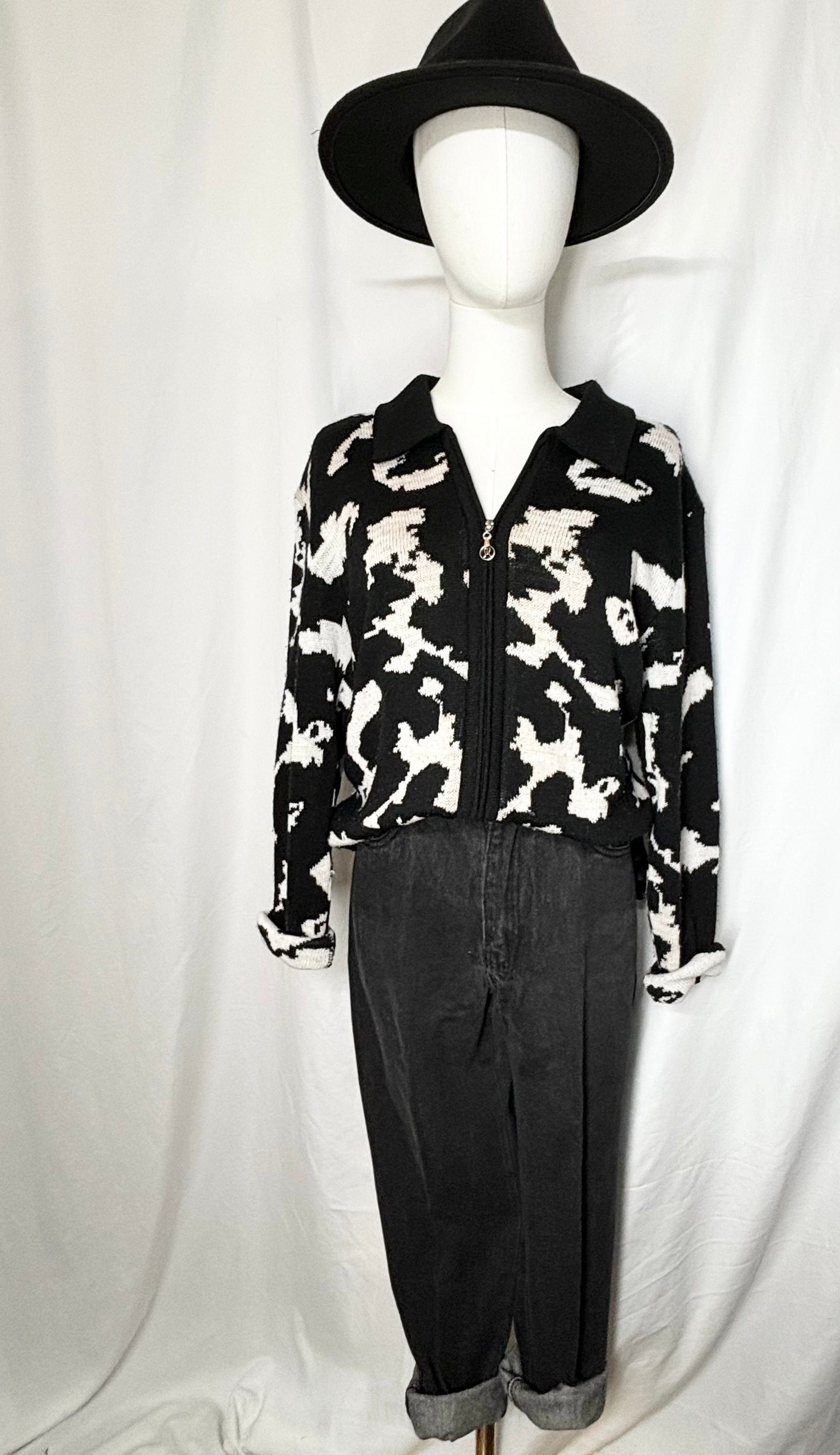 Vintage black and white zip-up sweater with a bold abstract pattern and a classic collared design. No size tag, but it likely fits sizes Small to Medium. A unique and stylish piece for layering or wearing on its own!