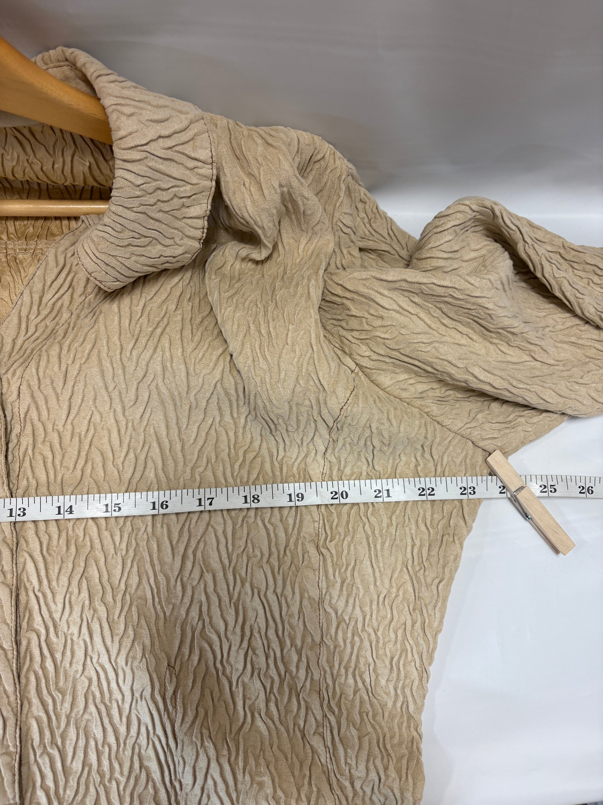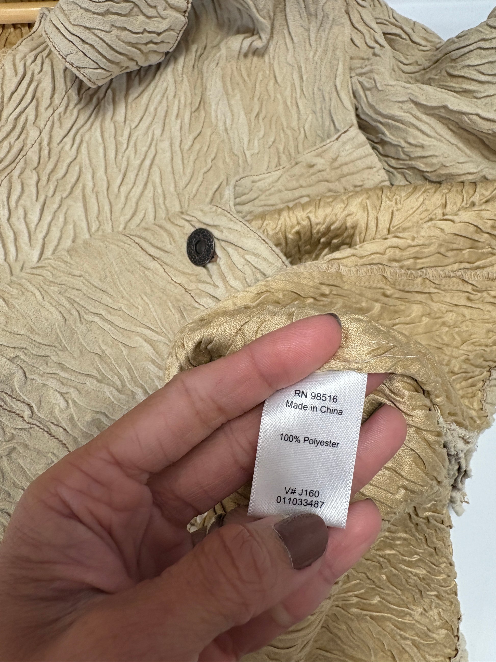 This Coldwater Creek beige faux suede shirt jacket is a chic and versatile outerwear piece for any wardrobe. Designed in a flattering petite medium, it features a soft polyester fabric, geometric pattern, long sleeves, and button closures for a polished look. Perfect for casual outings or layering, it’s both comfortable and timeless.