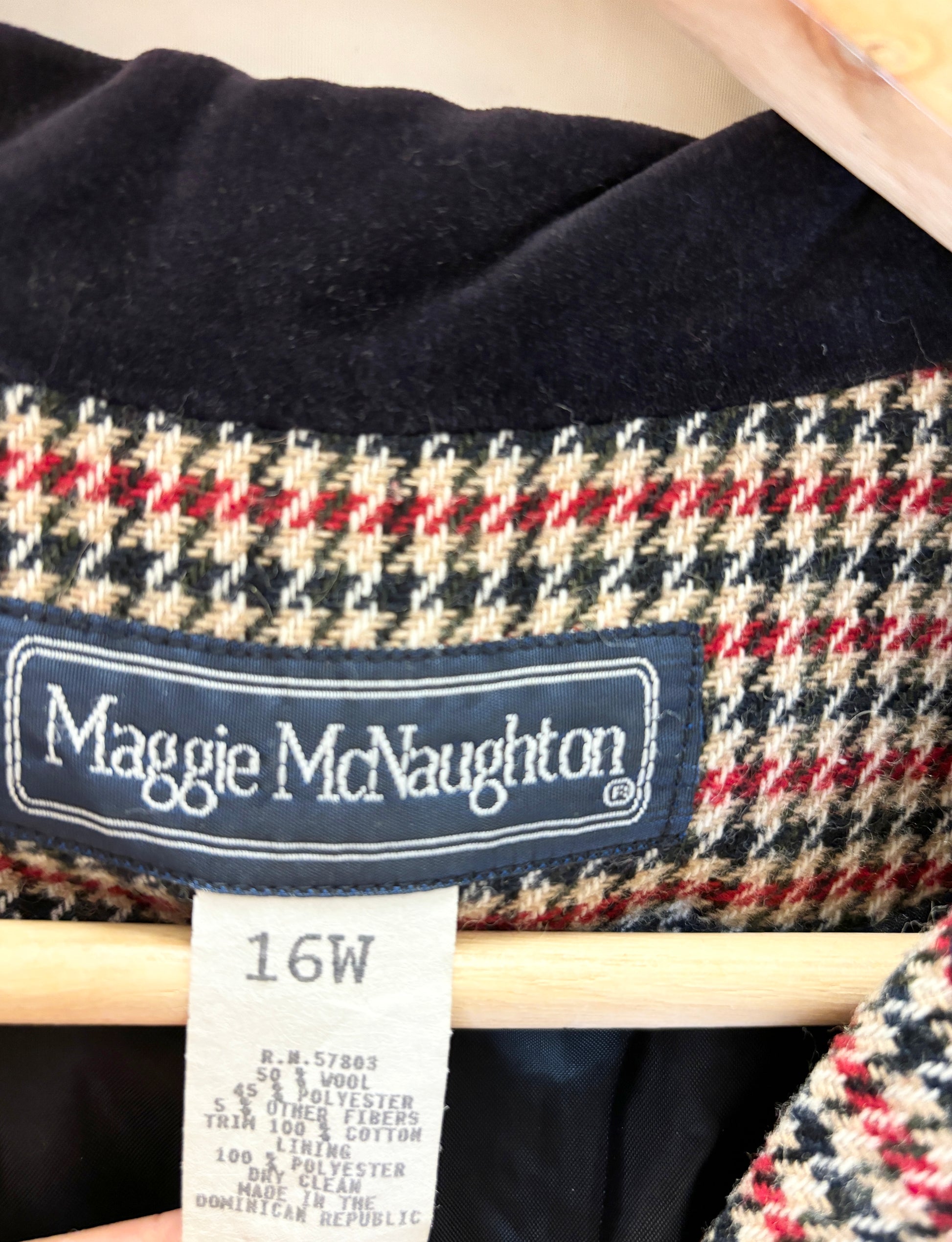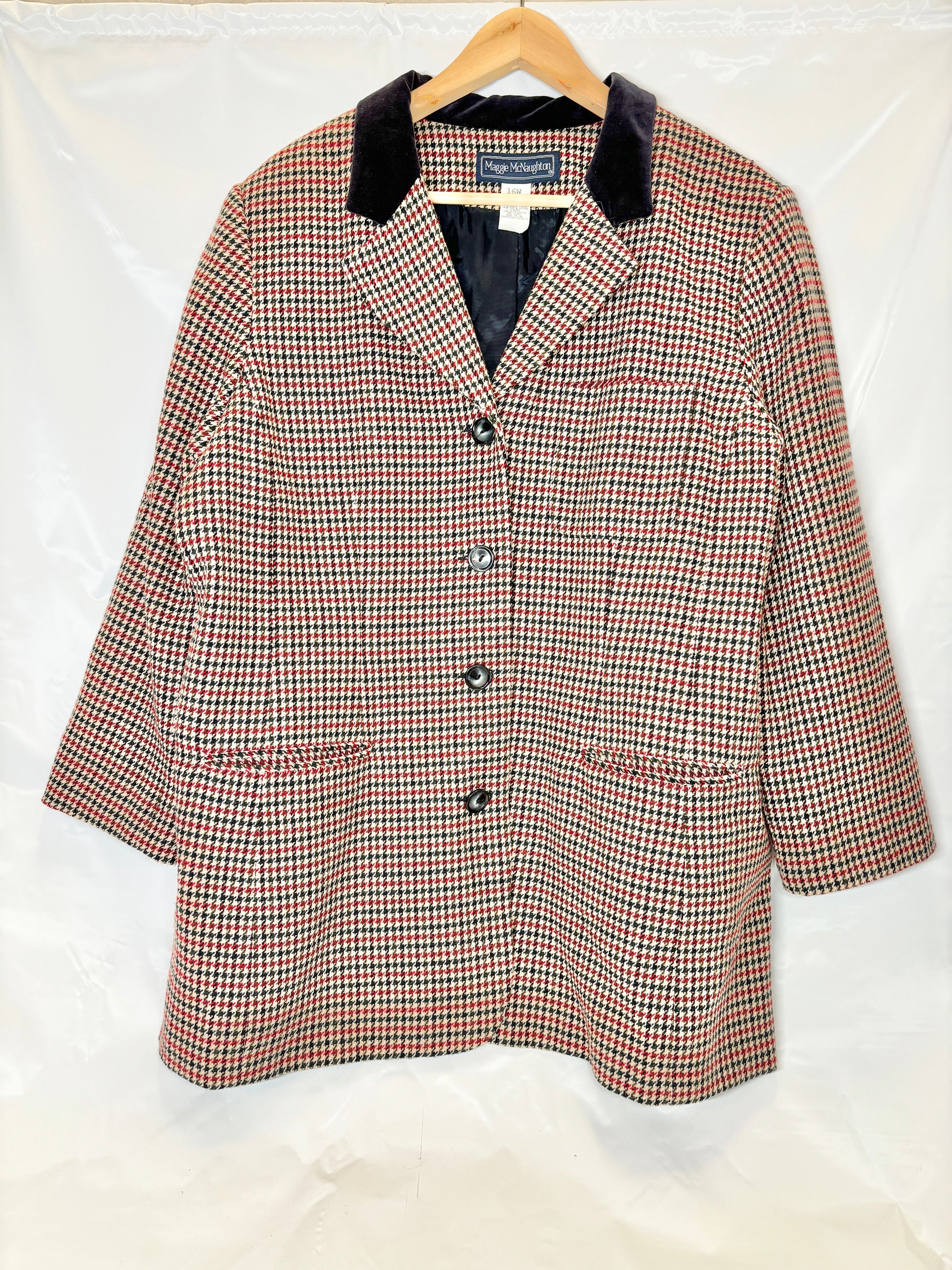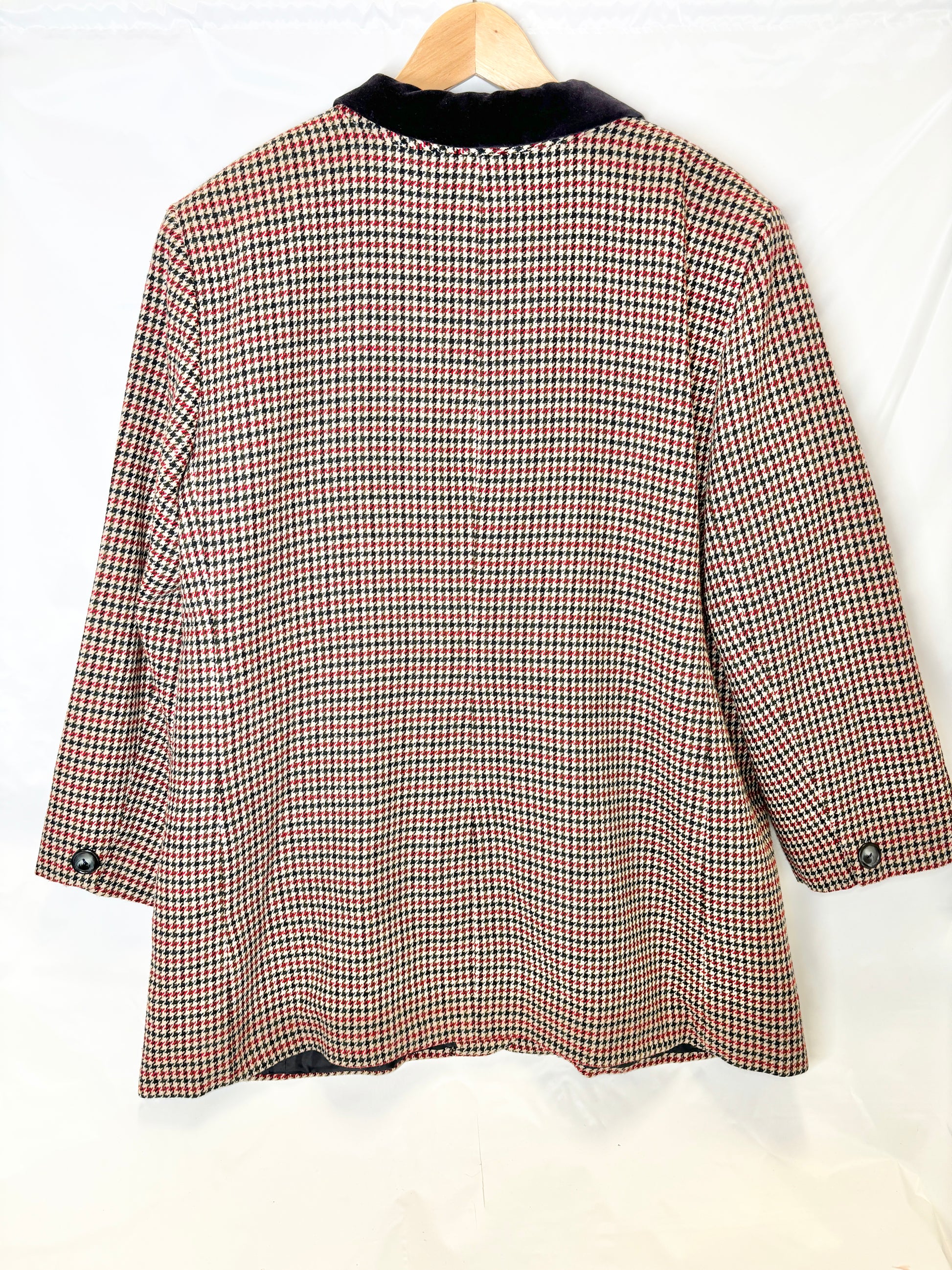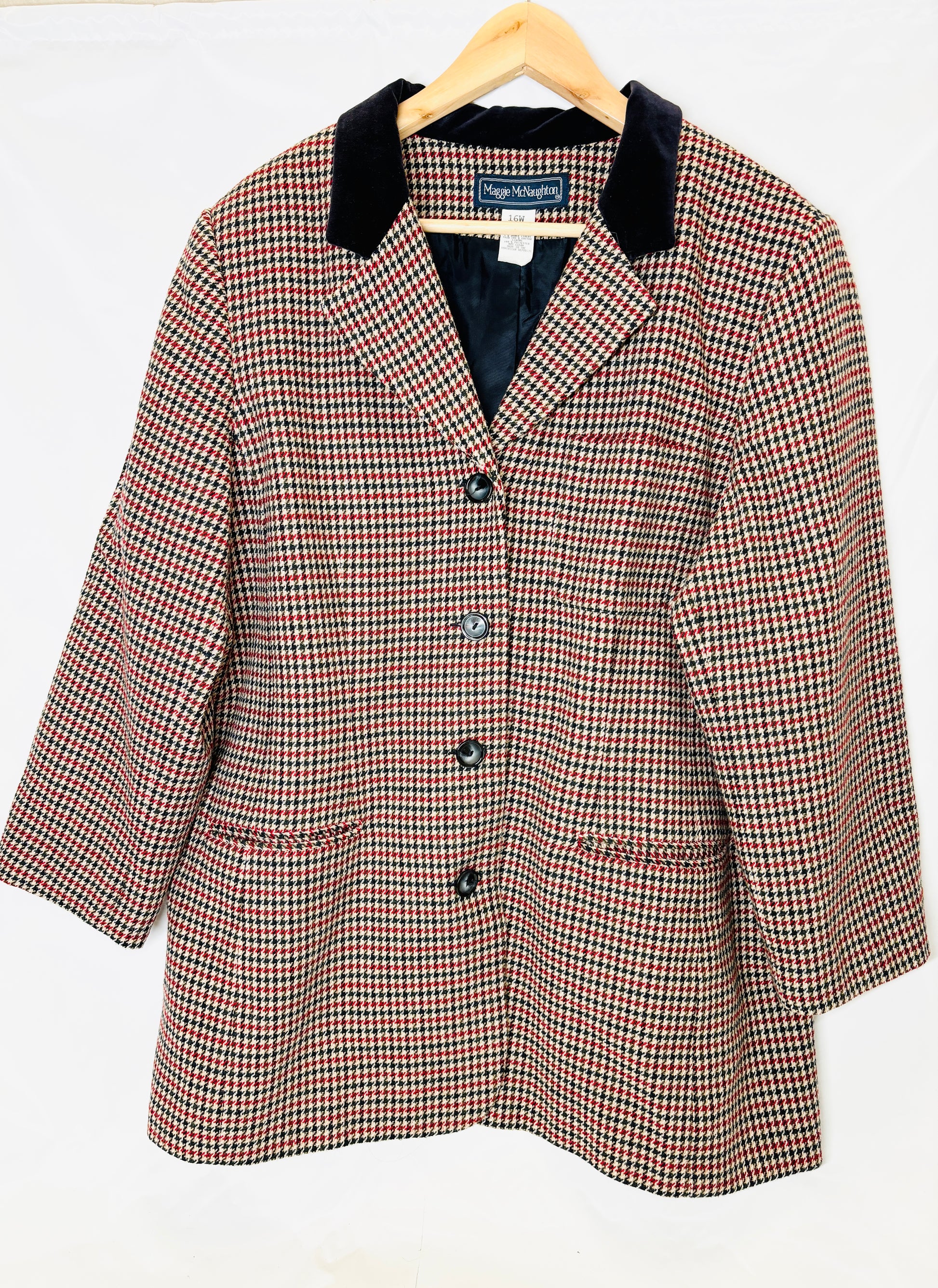 Classic and bold, this vintage 1980s houndstooth blazer by Norton McNaughton features a rich wool blend fabric with a striking black velvet collar, structured shoulders, and front pockets. A timeless piece that brings instant vintage polish to any look.
