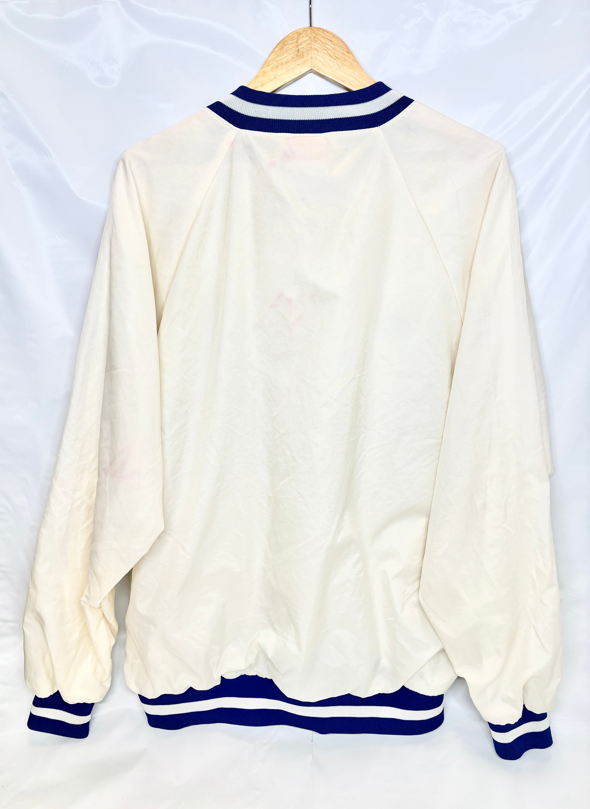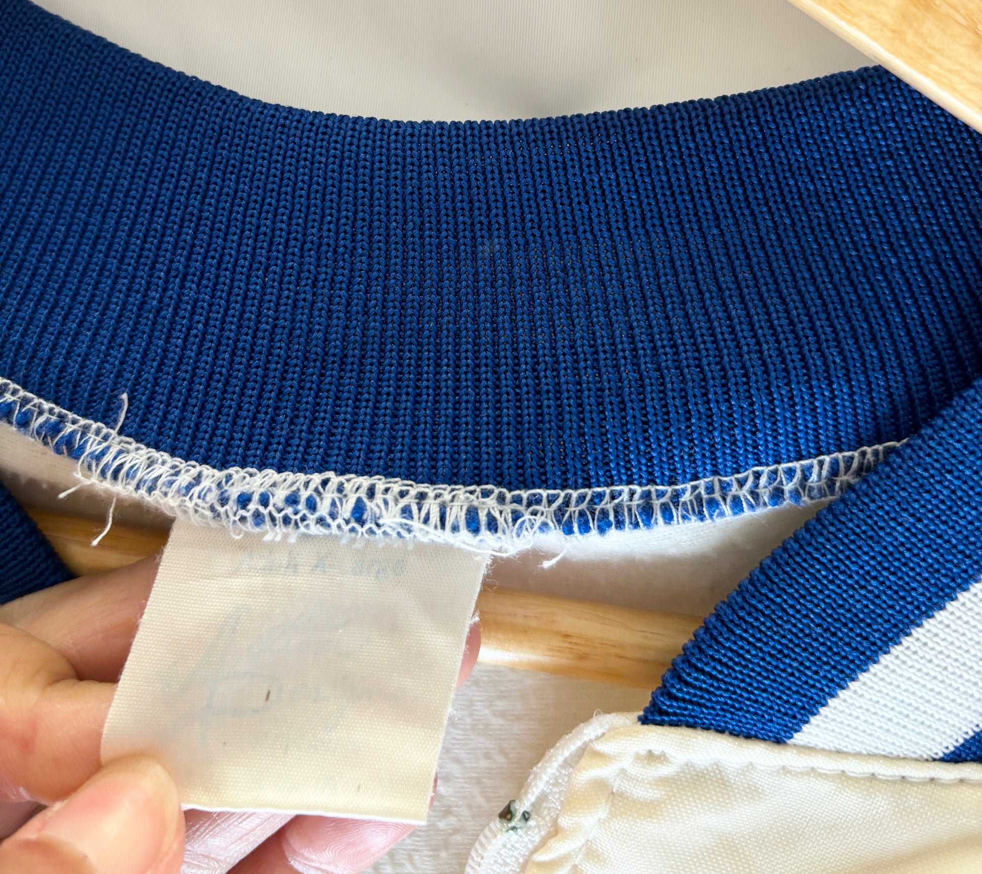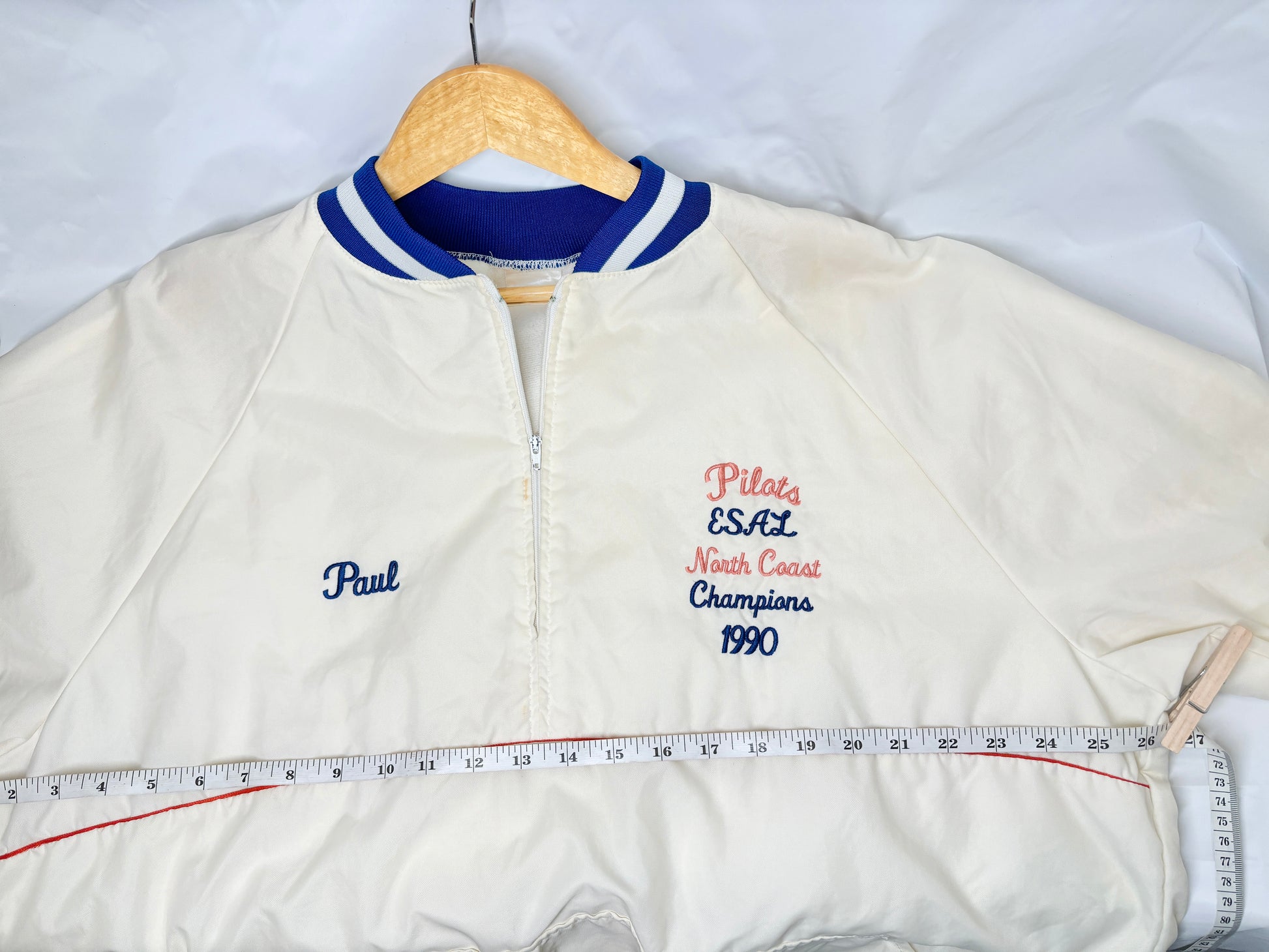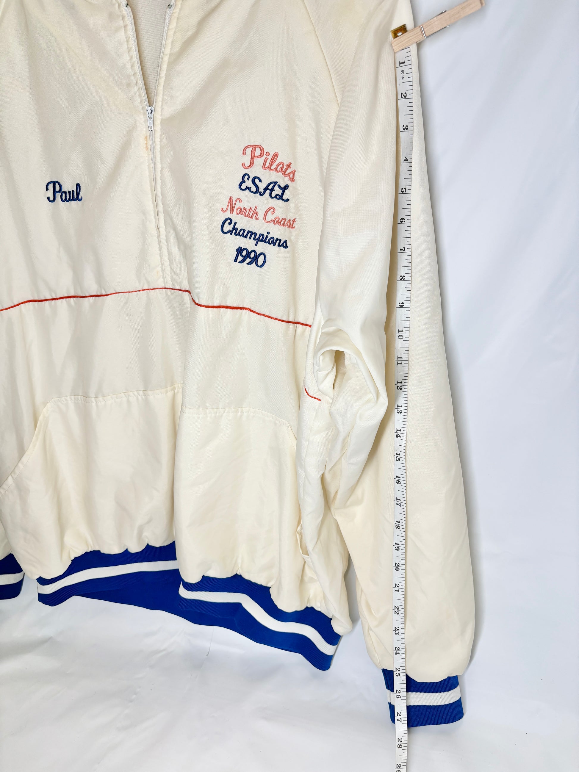 Step back into the ‘90s with this classic vintage windbreaker! Featuring embroidered details including "Paul" and “Pilato ESFA North Coast Champions 1990,” this jacket brings old-school athletic charm. Made of lightweight fabric, it has a half-zip front, kangaroo pocket, and bold striped ribbed cuffs and hem in navy and white. A thin red piping detail runs across the chest for an added pop of vintage flair.