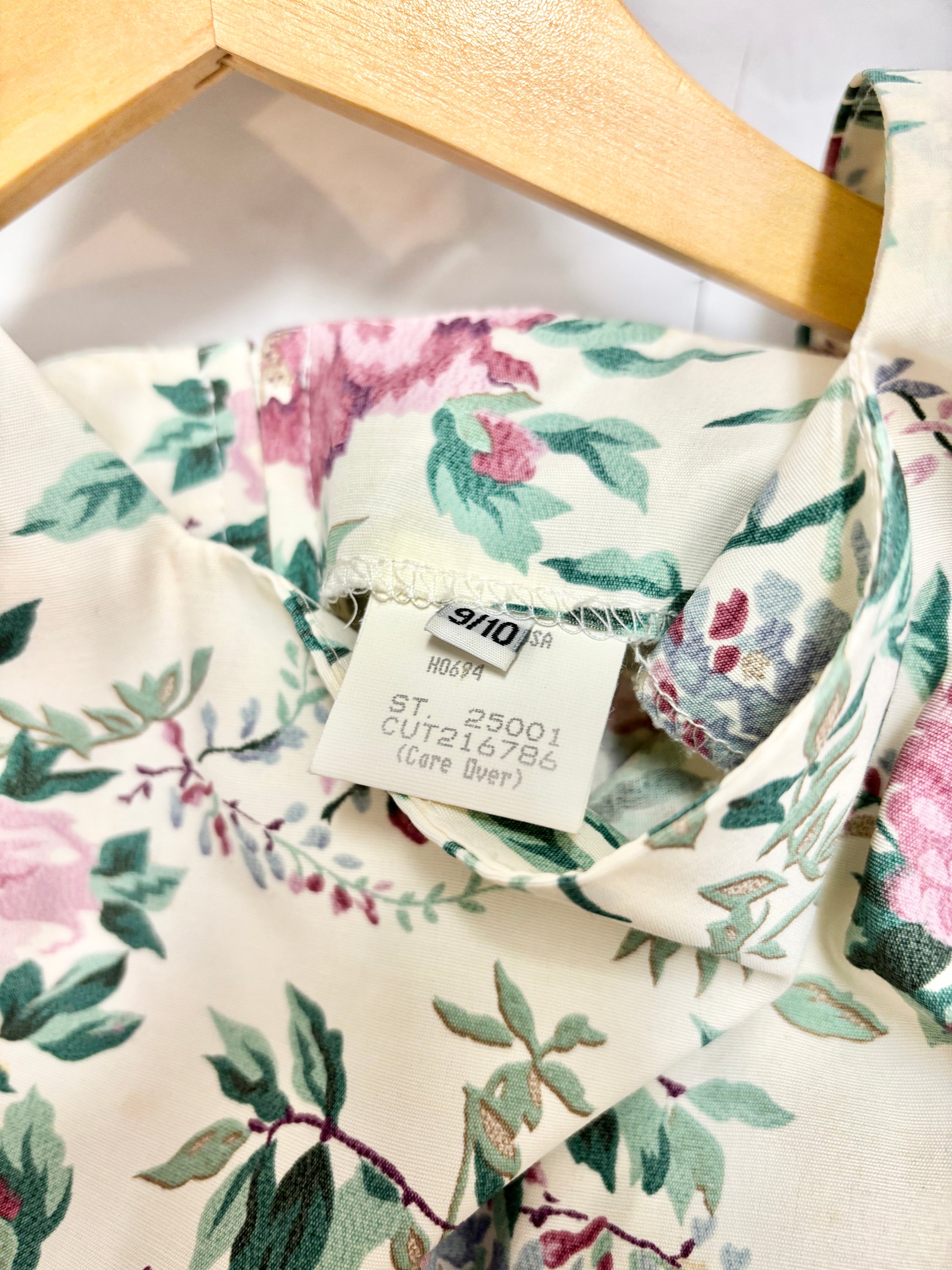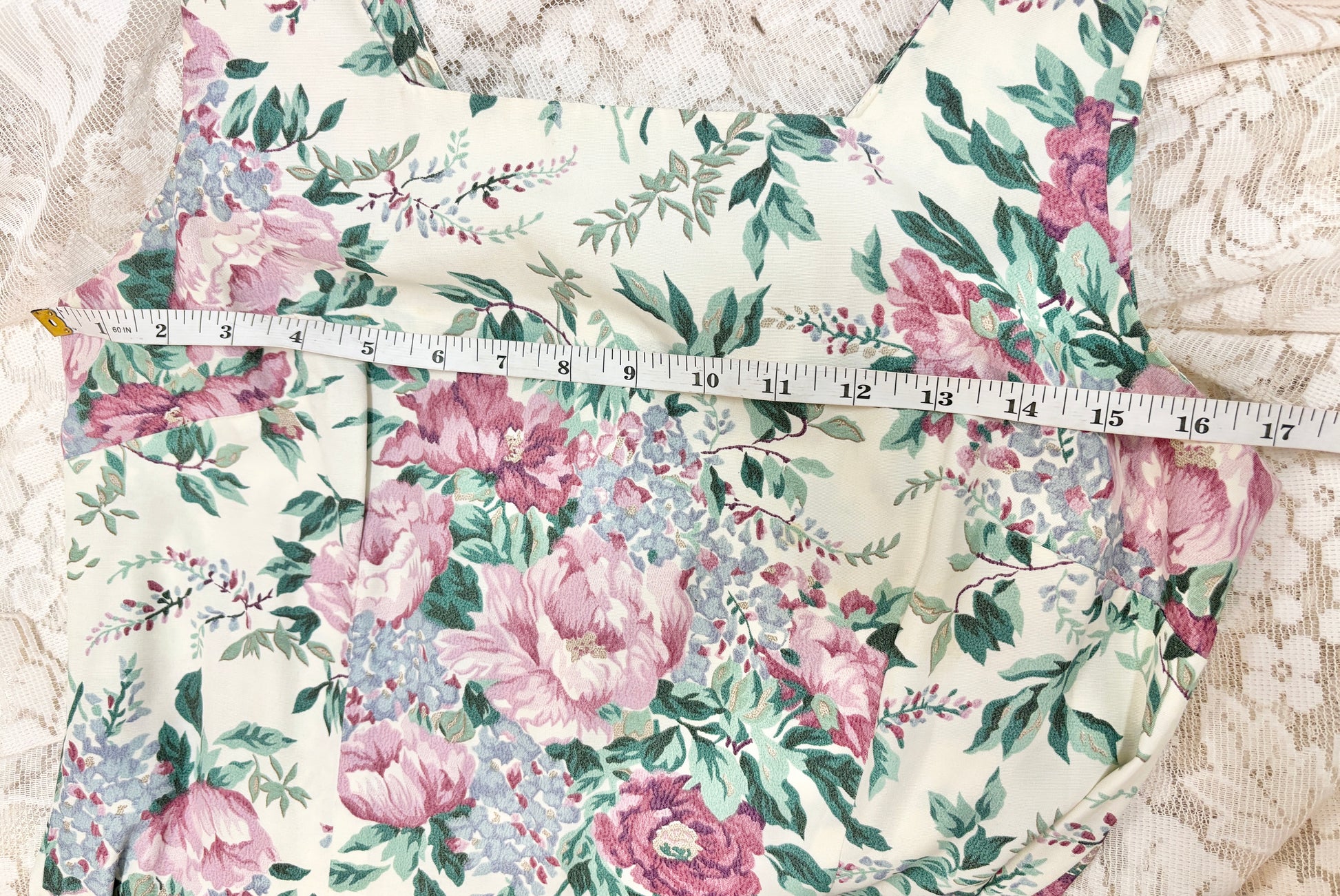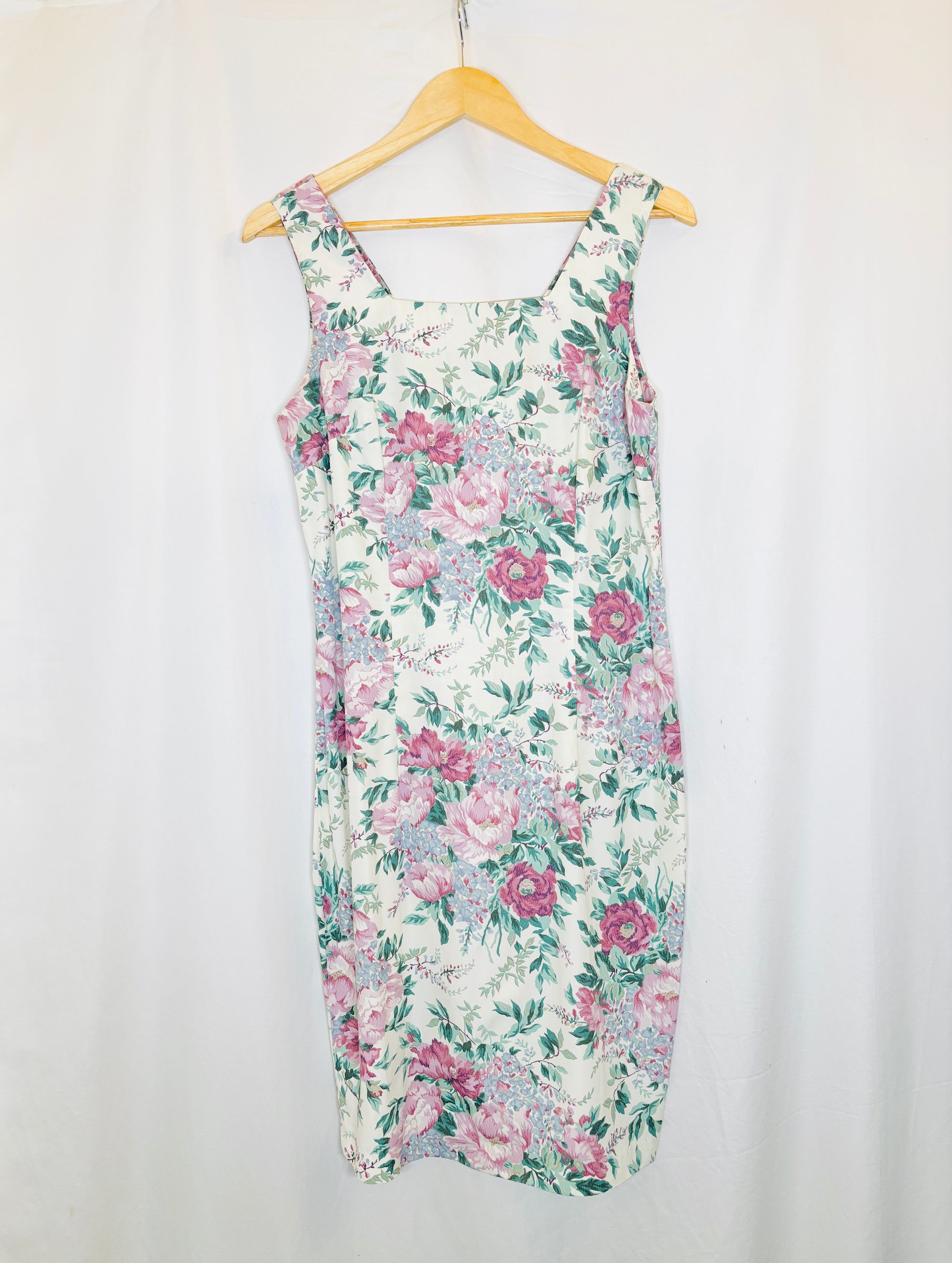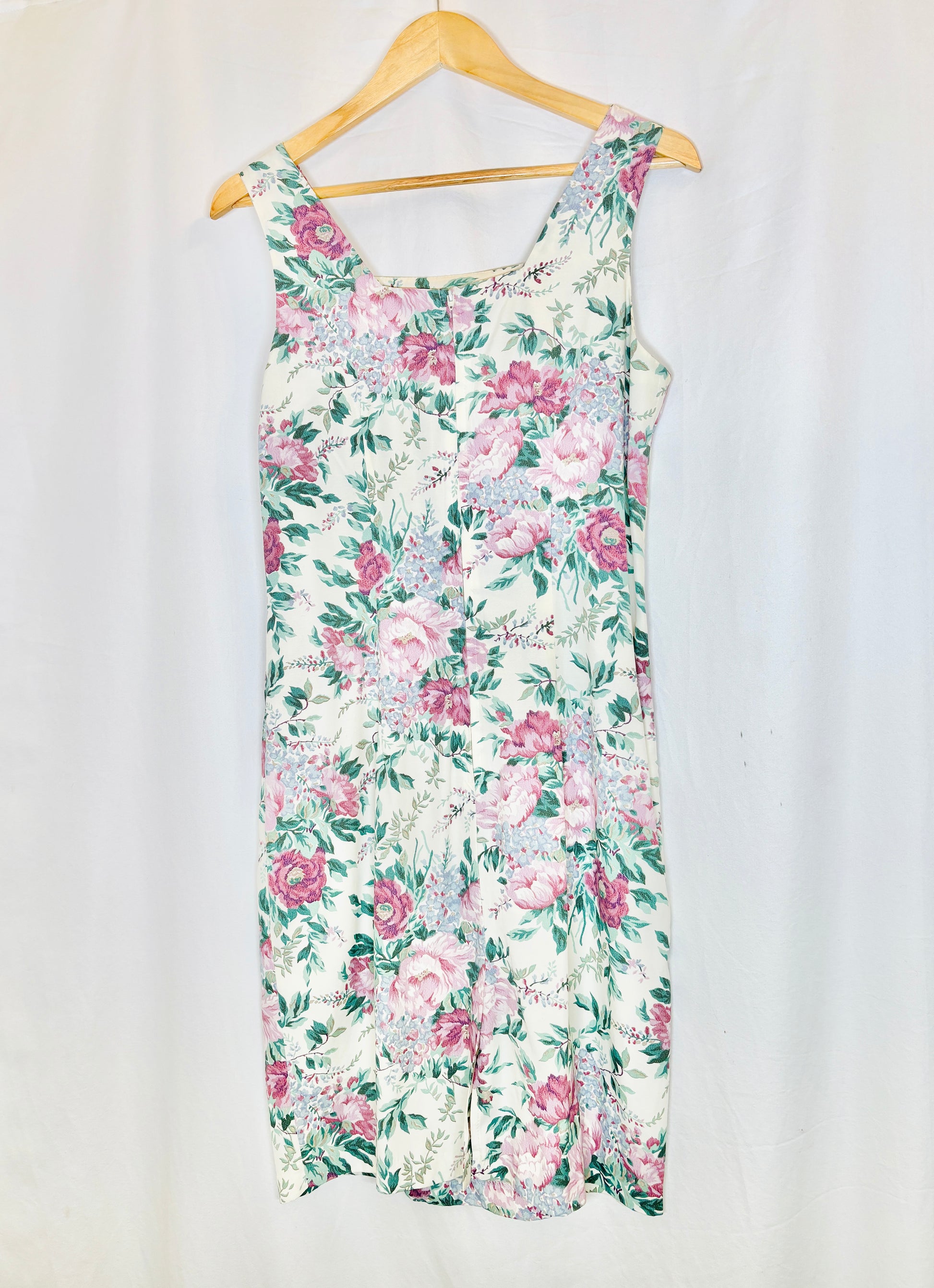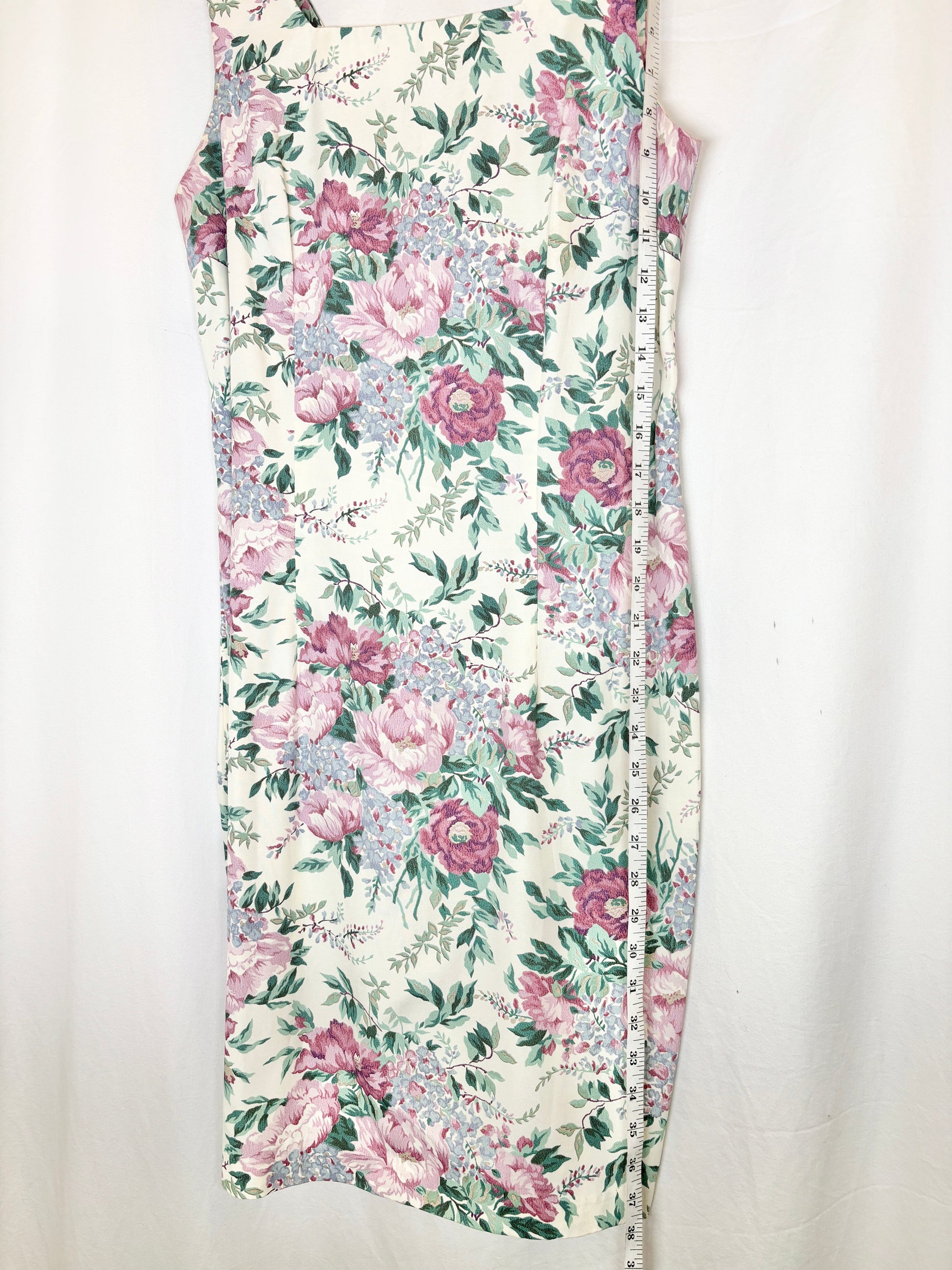 Step into effortless elegance with this vintage 1990s cream shift dress, featuring a subtle floral print along one side for a soft, romantic touch. The easy silhouette, mid-length cut, and sleeveless design make it perfect for warm weather or layering with a light jacket.