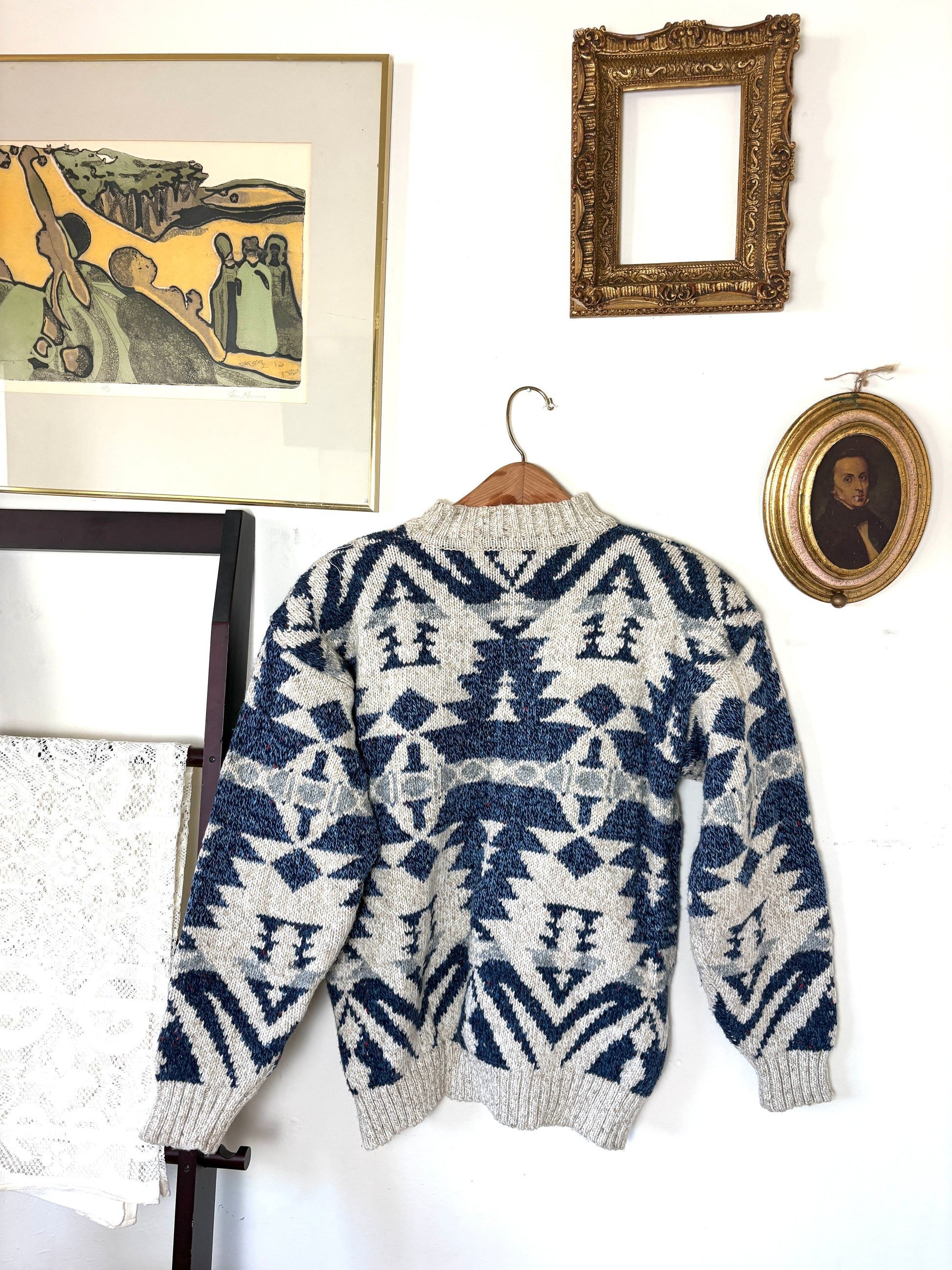 Vintage 80s Grandpa Sweater Small Chunky Southwestern Aztec Boho Wool Geometric