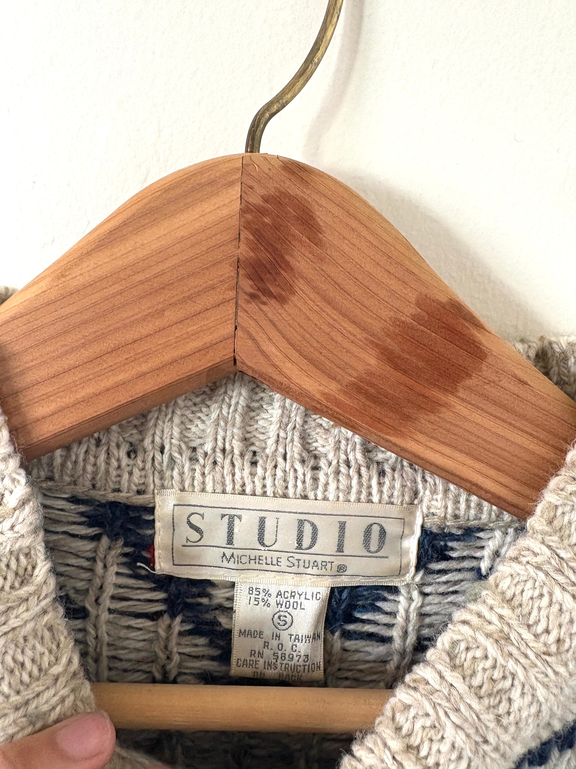 This vintage 80s Grandpa sweater by Studio is a unique piece that exudes a boho look with Southwestern Aztec geometric patterns. Made of a wool blend material in a small size, this casual sweater is perfect for adding a touch of retro charm to any outfit. The colorful design and chunky texture make it a standout piece for those who appreciate vintage fashion from the 1980s.