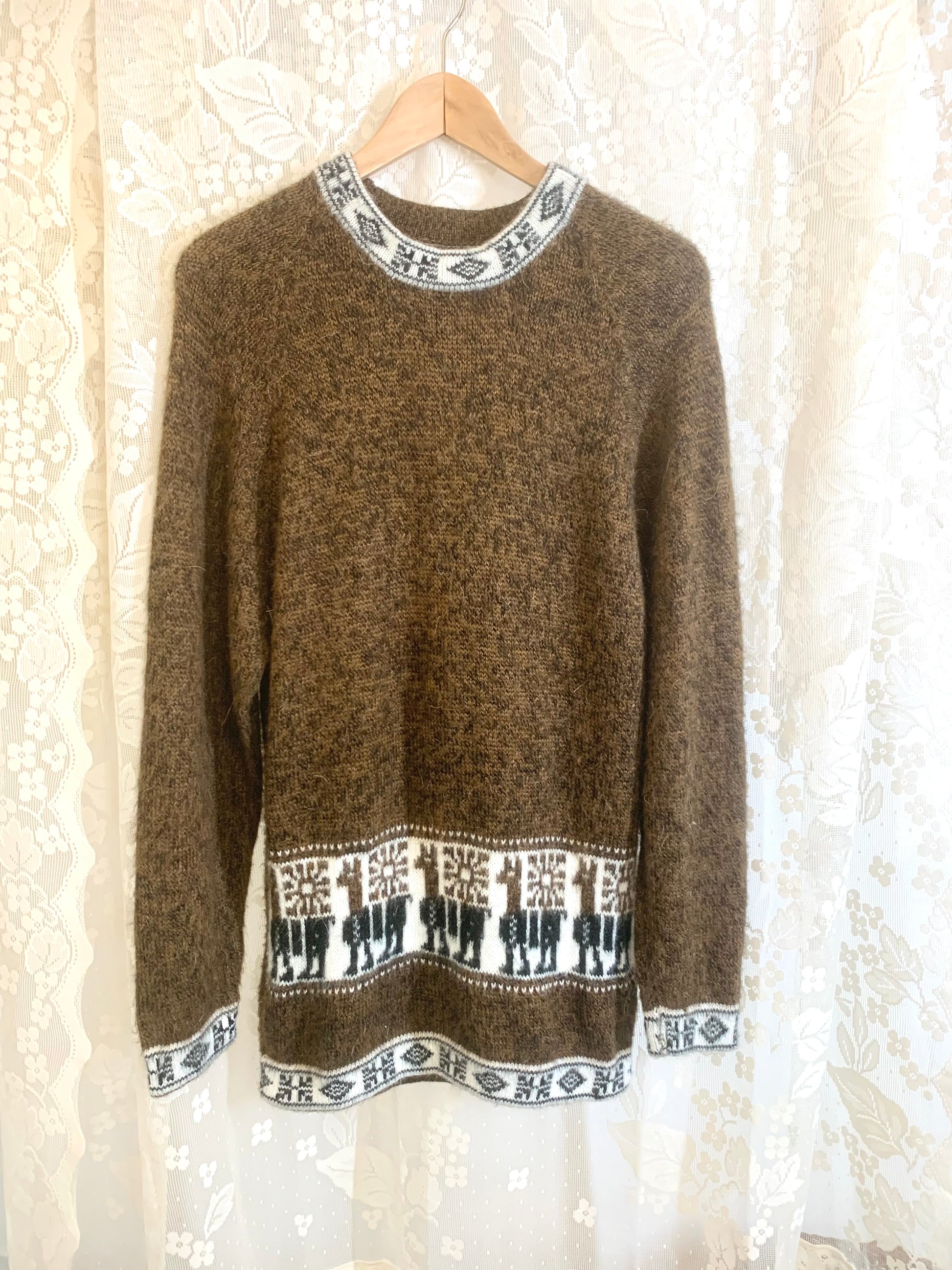 Vintage Unisex Brown Knitted Pullover Soft Winter Sweater Grey Peruwian Crewneck Top Blouse 1990s 2000s Size L
