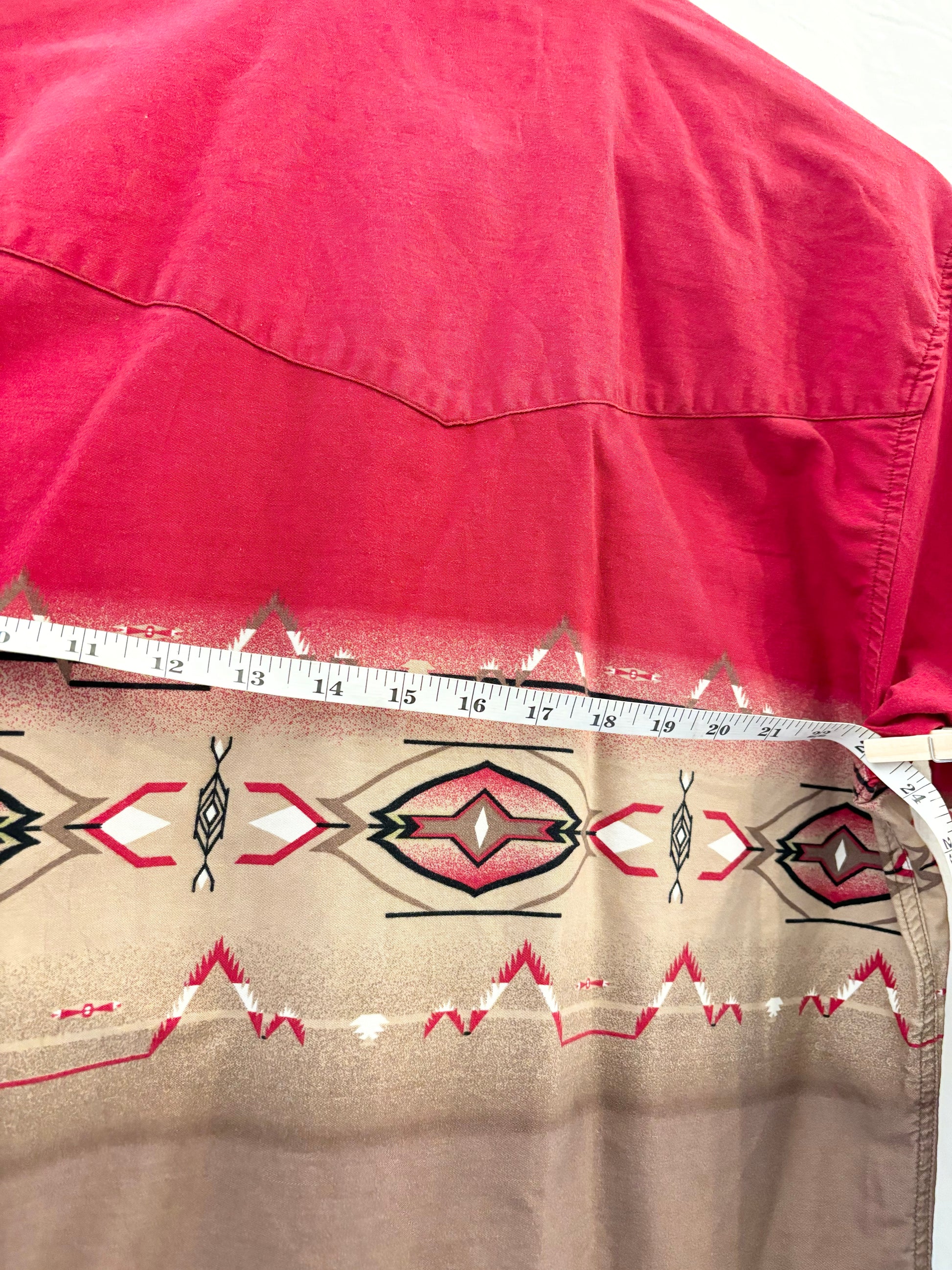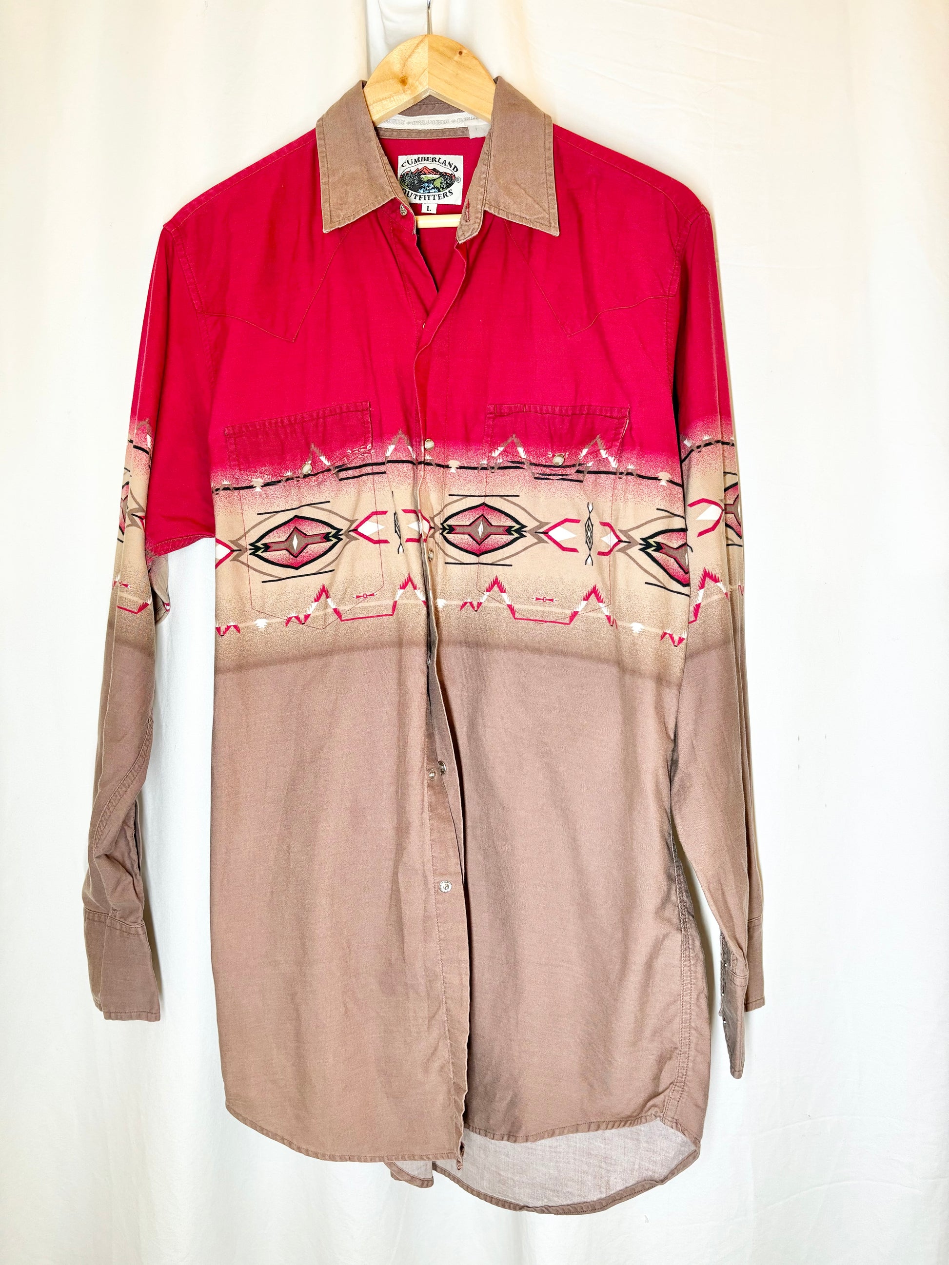 This is a vintage Cumberland Outfitters men's shirt in size L. It features a striped pattern, long sleeves with snap closures, a collared neckline, and a multicolor design. Made of cotton, this button-up shirt has a regular fit and a cutaway collar style, suitable for travel, casual wear, and work settings with a Western theme.