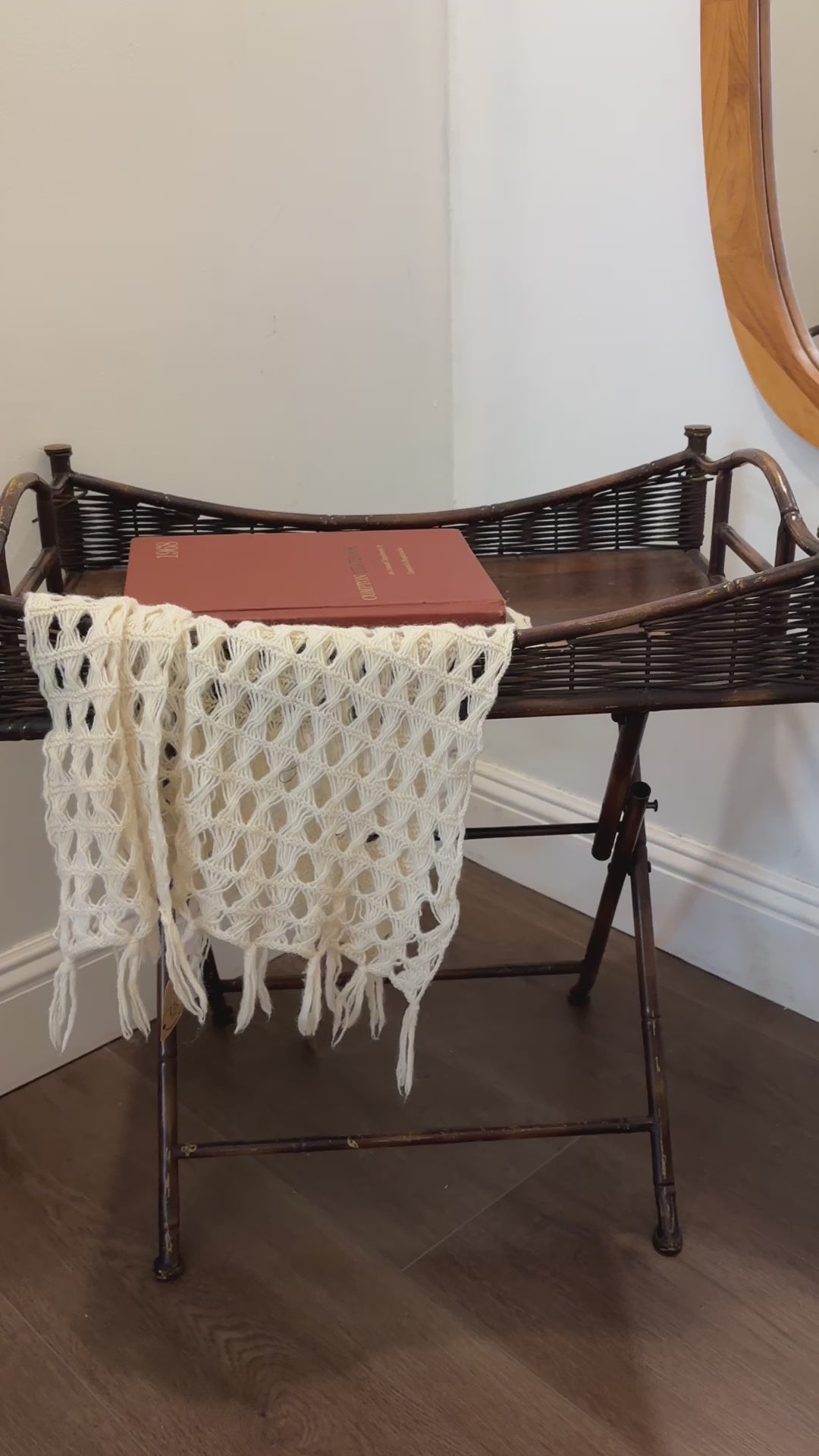 Beautiful vintage-style wicker and bamboo folding table, perfect as a side table, plant stand, or entryway accent piece.