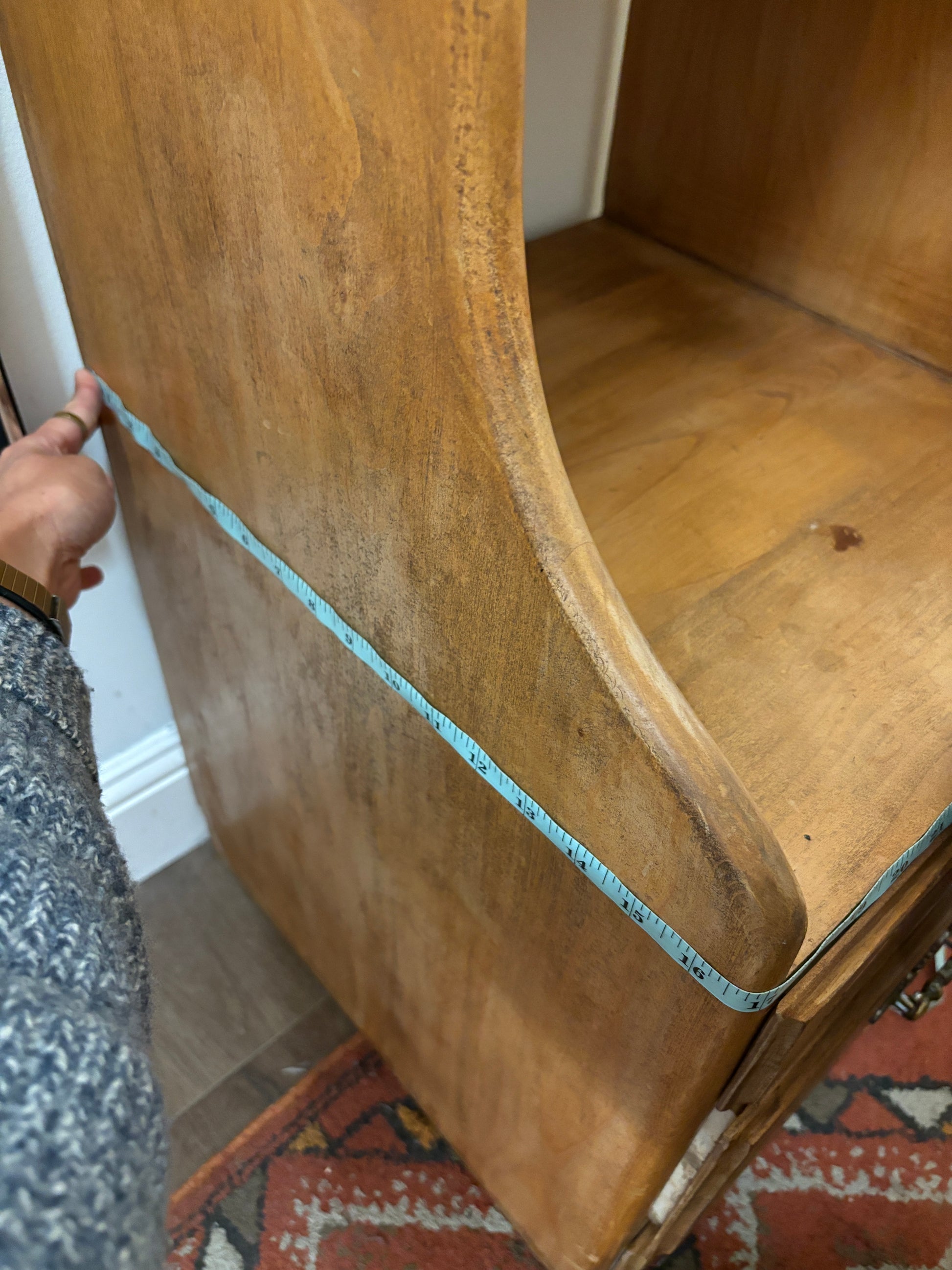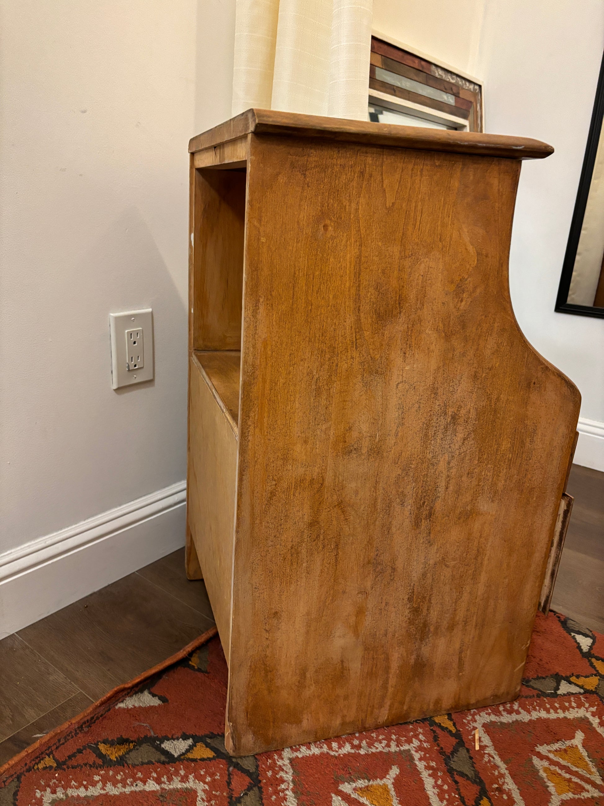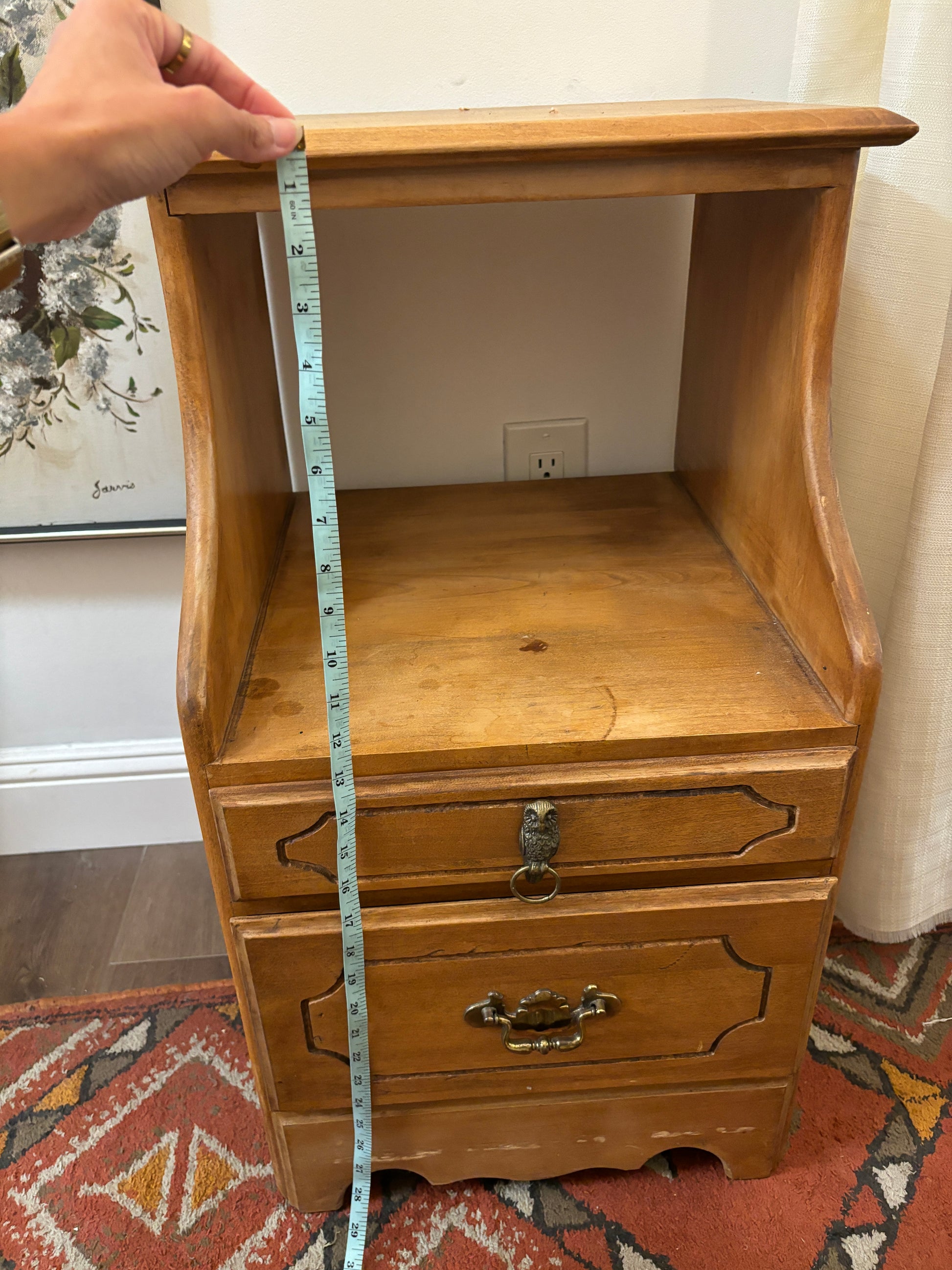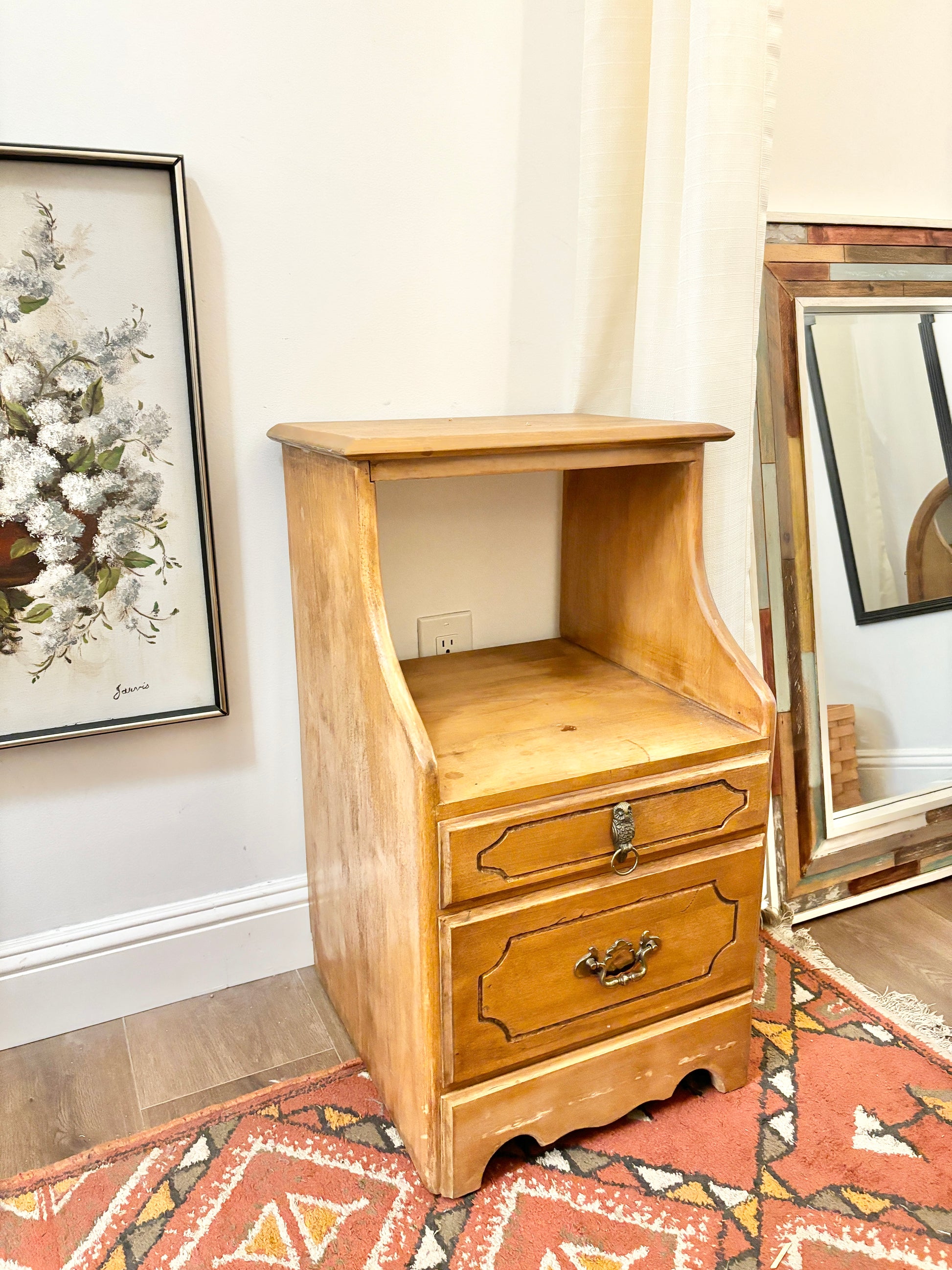 Charming vintage wooden nightstand with two drawers and an open shelf. Features unique antique-style hardware including an owl ring pull on the top drawer and beautiful carved details on the drawer fronts. Perfect as a bedside table, side table, or accent piece.