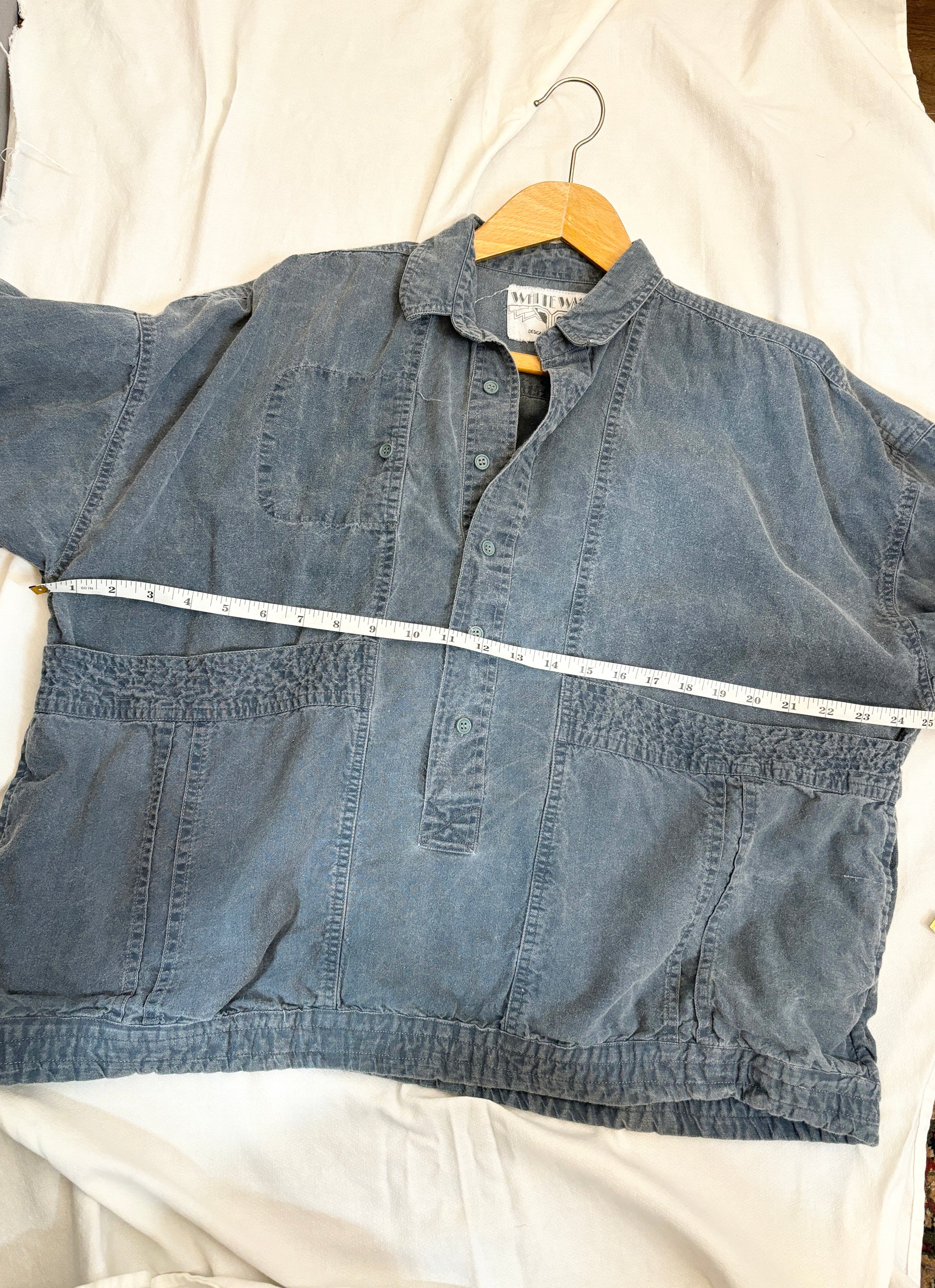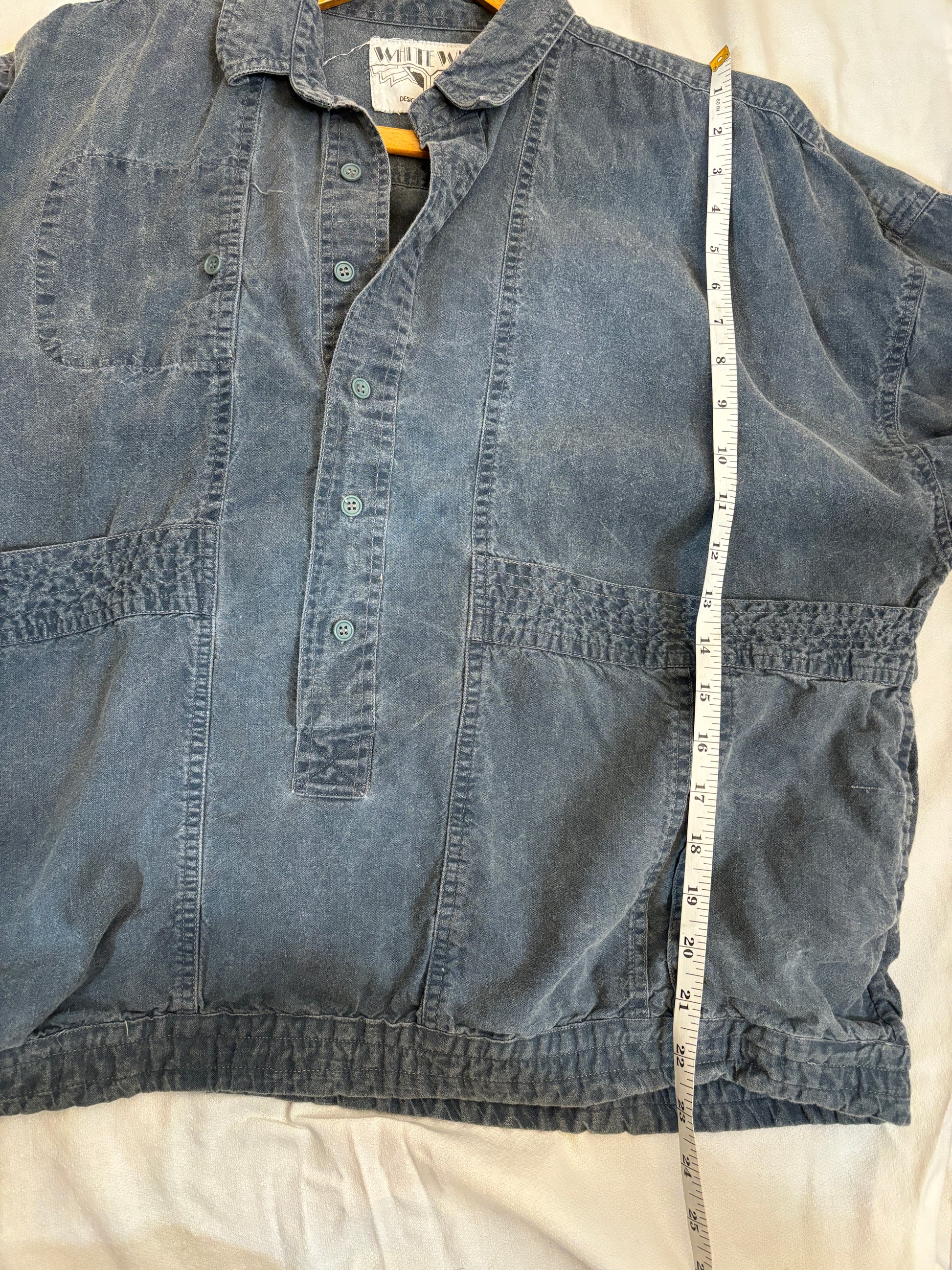 This vintage oversized denim pullover jacket by White Wash (designed in London) is the perfect blend of comfort and effortless style. Featuring a faded, worn-in wash, it has a relaxed, slouchy fit with a partial button-up front, a classic collar, and roomy front pockets. The gathered hem and cuffs add subtle structure while maintaining a laid-back vibe.