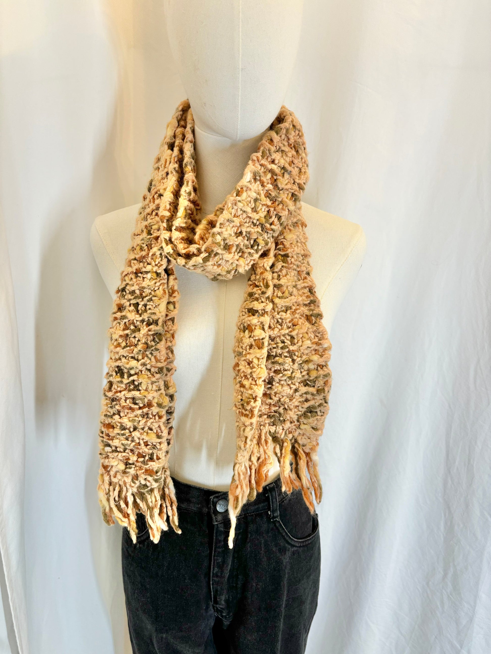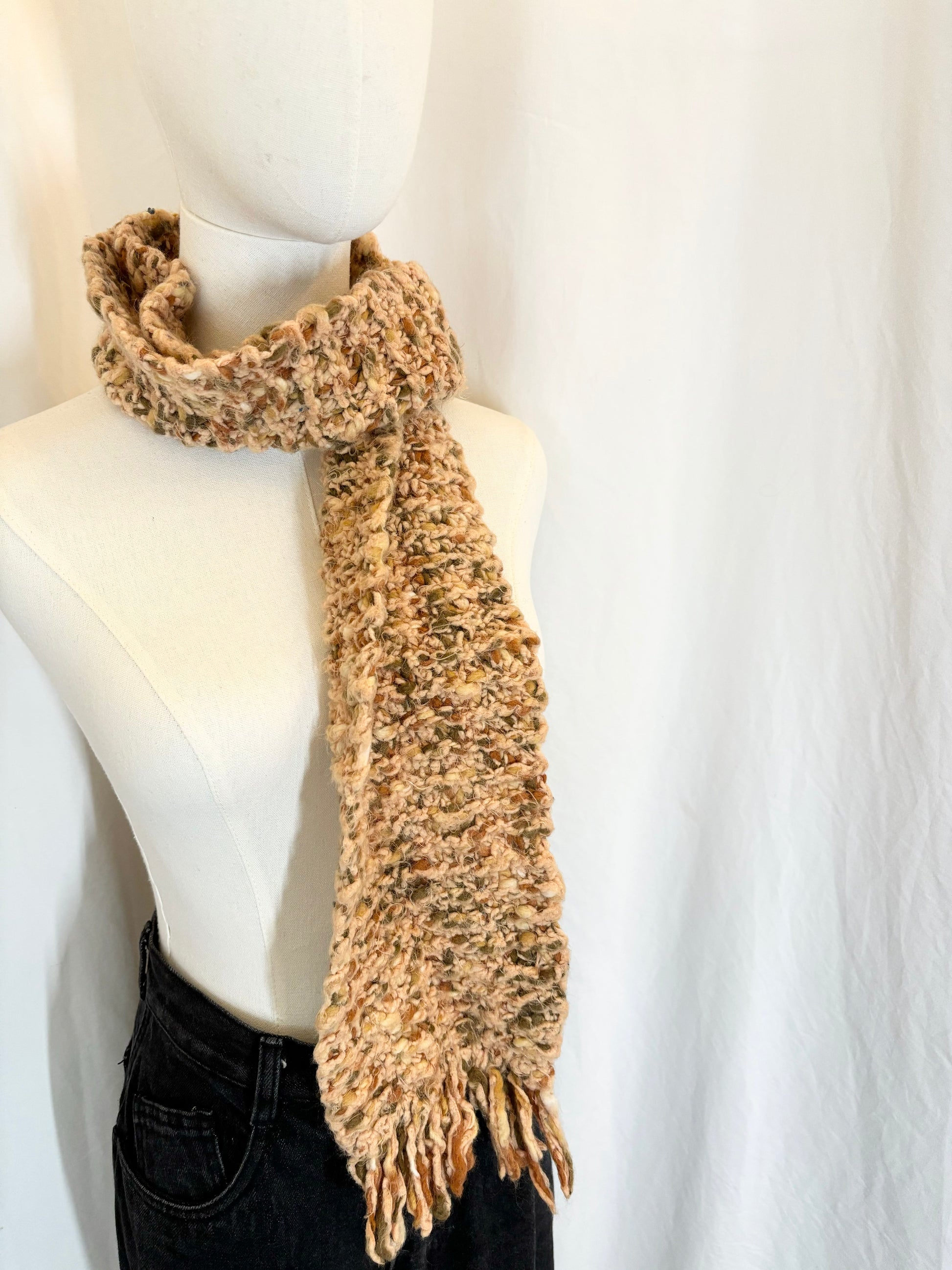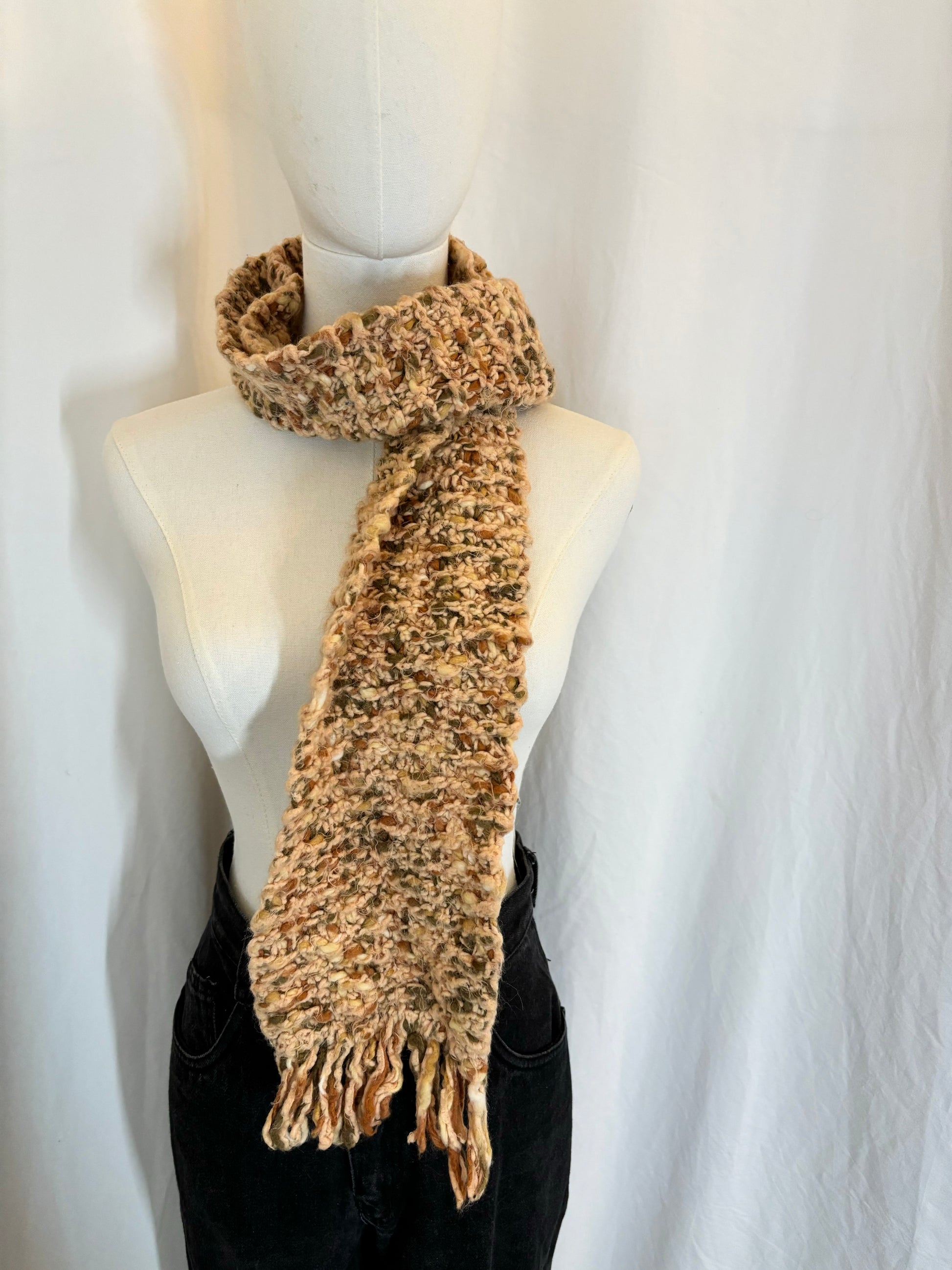 Expertly hand knitted, this stylish scarf in tan or yellow is the ideal winter accessory. Its warm and versatile design makes it a must-have for the colder months.