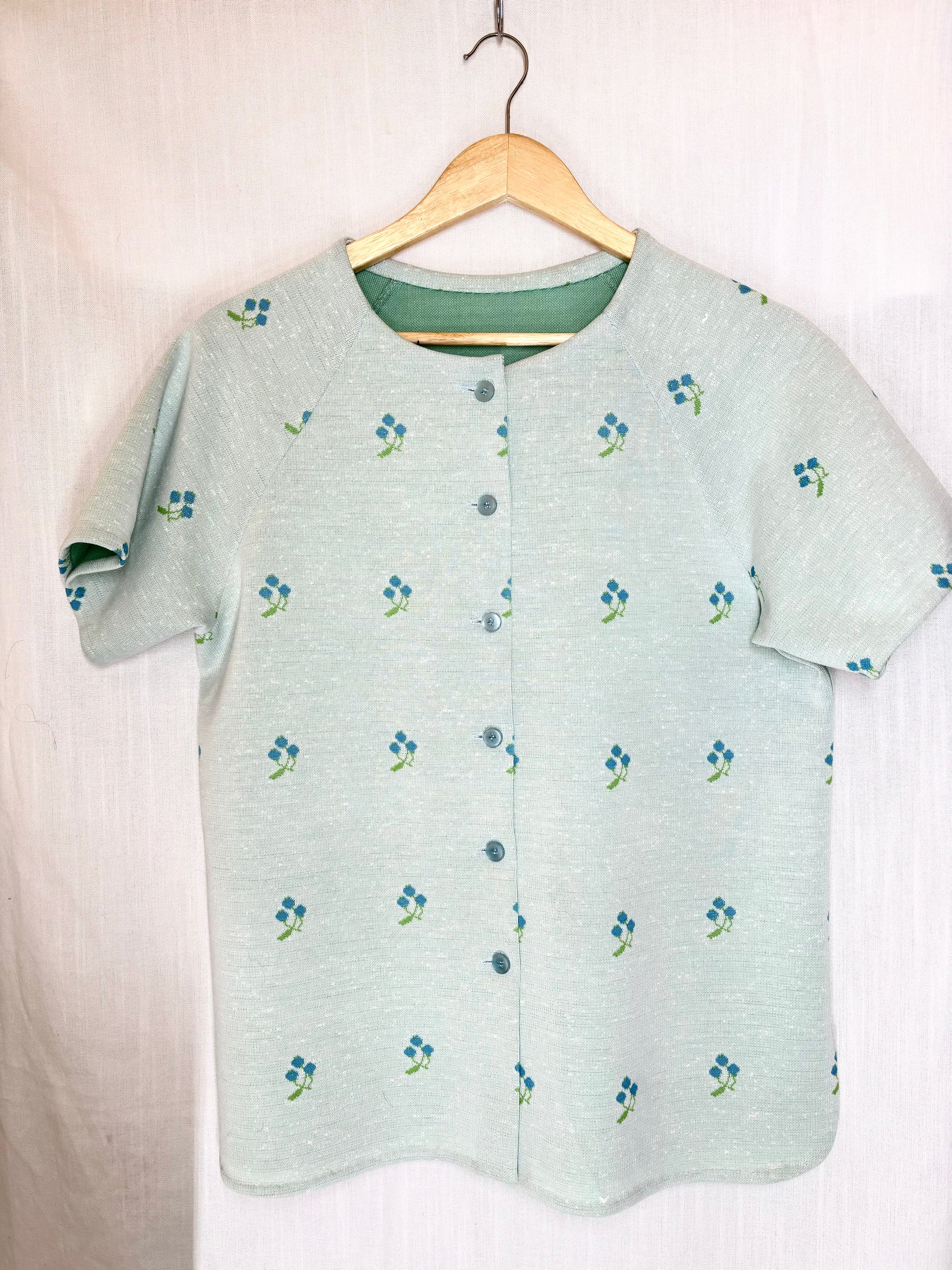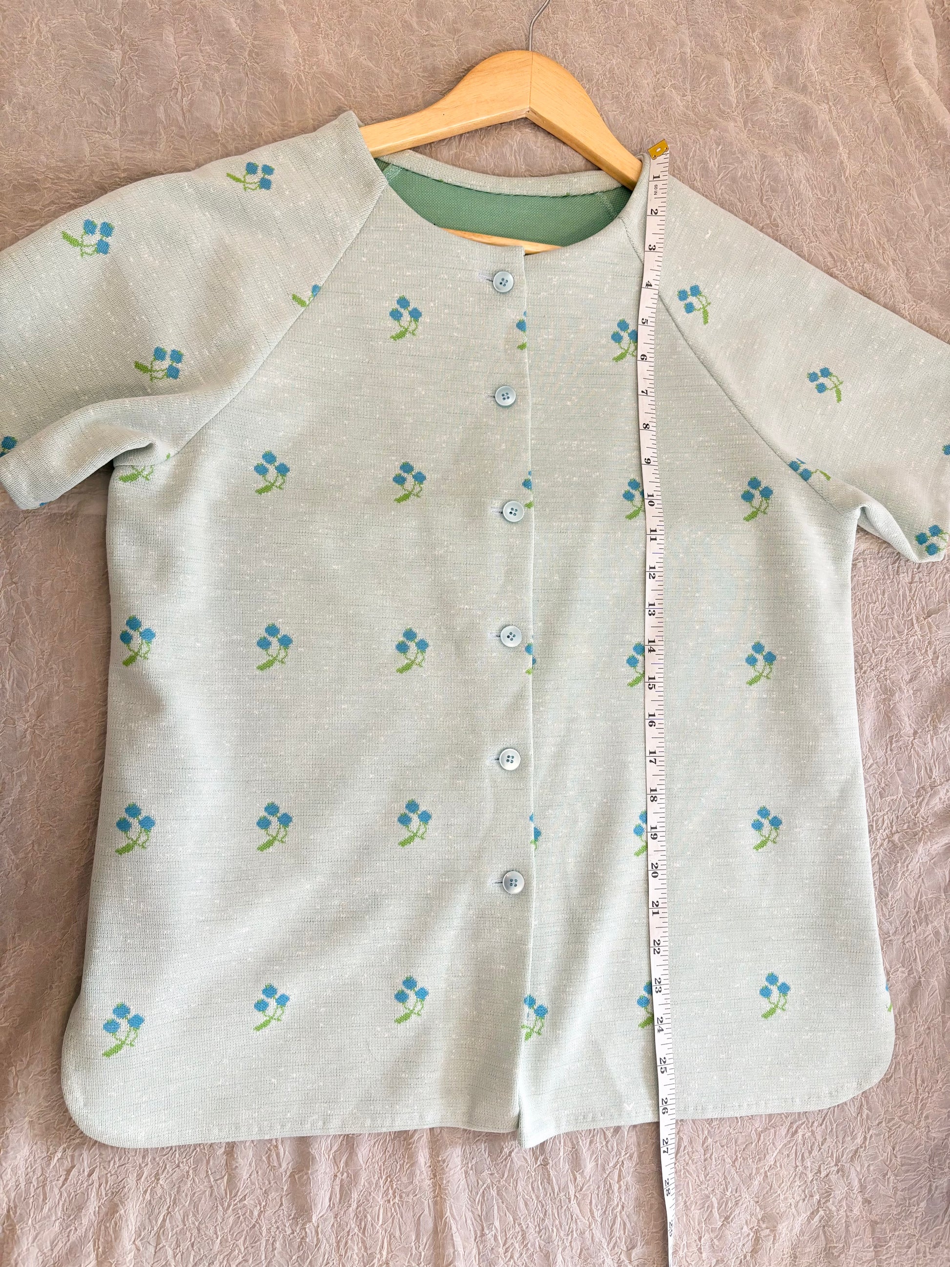 Freshly curated for you! This vintage button-down shirt in a soft mint green features charming blue floral details, adding a sweet, unique touch to any wardrobe. Handpicked with care, this one-of-a-kind piece has no size tag or brand label, so please be sure to check the size measurements in the photos for the perfect fit!